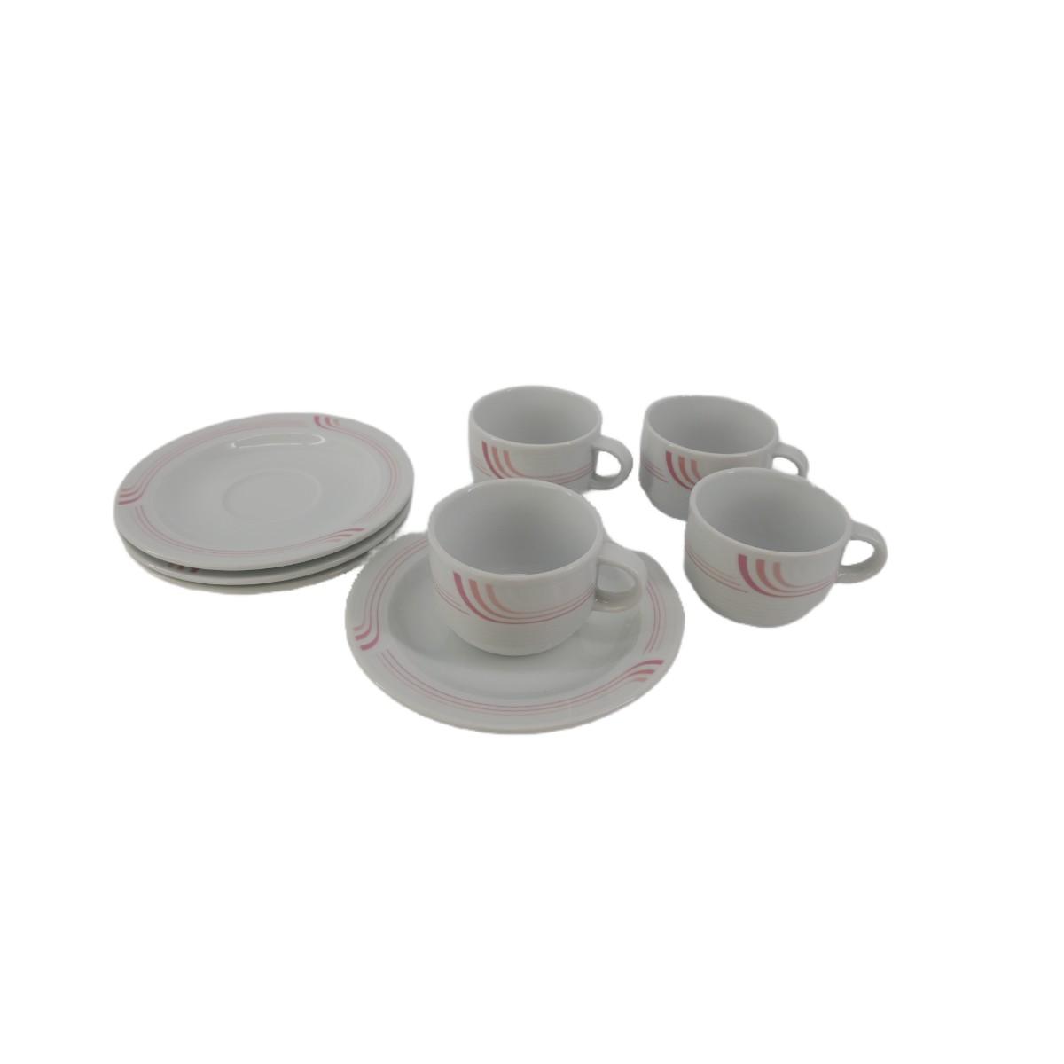 Vintage mid-century style Bauscher Weiden pink wisp stacking espresso, teacups and saucers. Made in Bavaria, Germany. Set of four, excellent condition! Each cup measures approximately 3" in diameter and 2" in height. Each saucer measures approximately 6.25" in diameter. Lot weighs 3 lb 6 oz. (G25)
