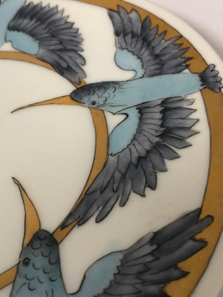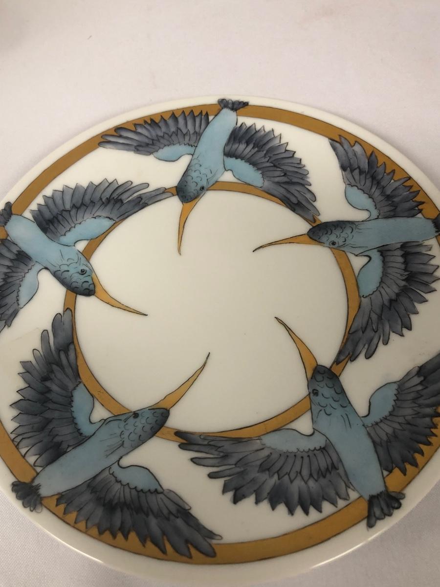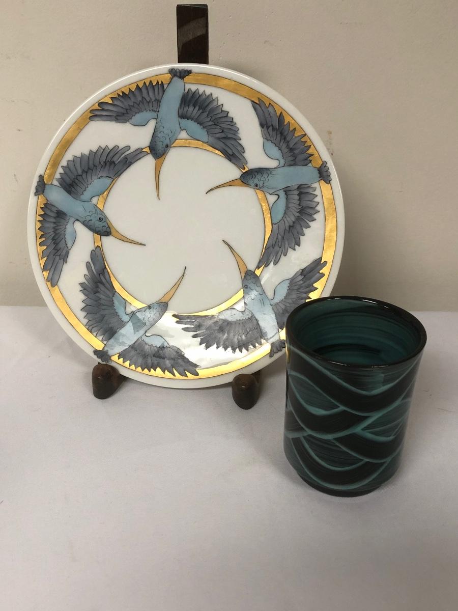 The gold and blue bird plate measures over 8” in diameter. There are no chips or cracks on the plate. The cup has paint or something similar in the bottom of it (seems to come off) and is almost 3” in diameter and stands 3.5” tall. Shipping Available.