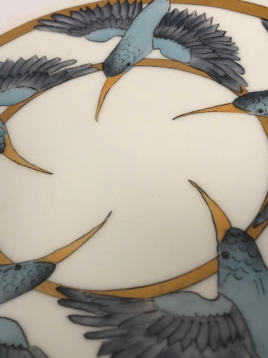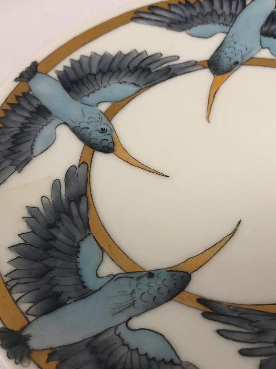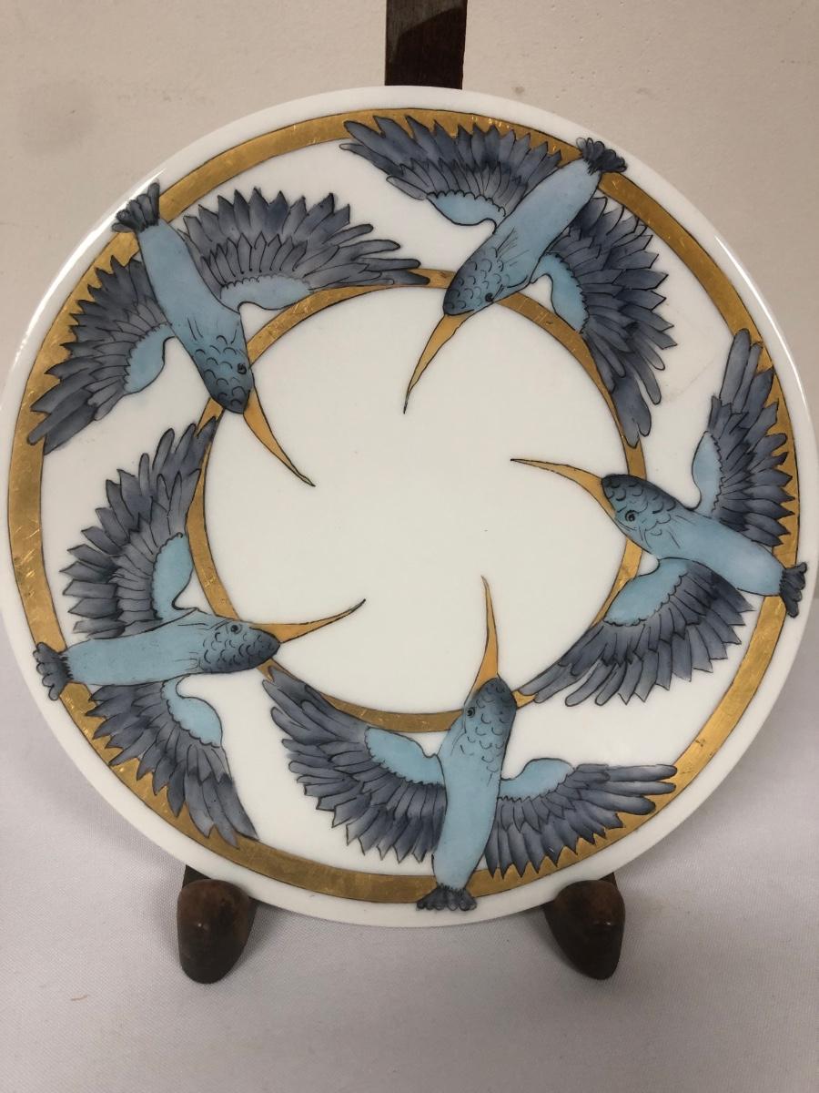 The gold and blue bird plate measures over 8” in diameter. There are no chips or cracks on the plate. The cup has paint or something similar in the bottom of it (seems to come off) and is almost 3” in diameter and stands 3.5” tall. Shipping Available.