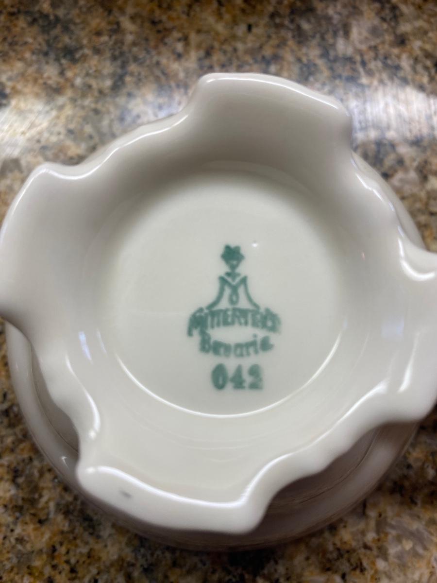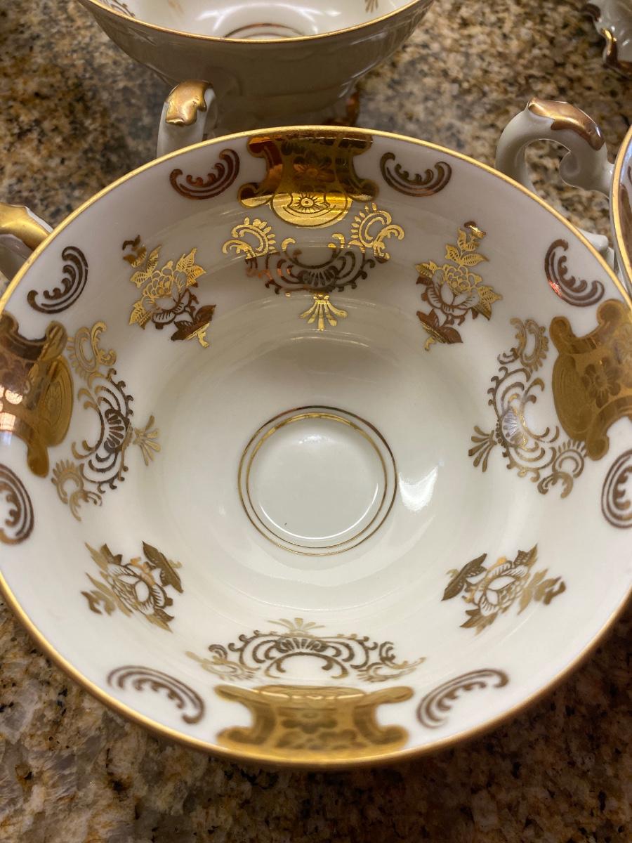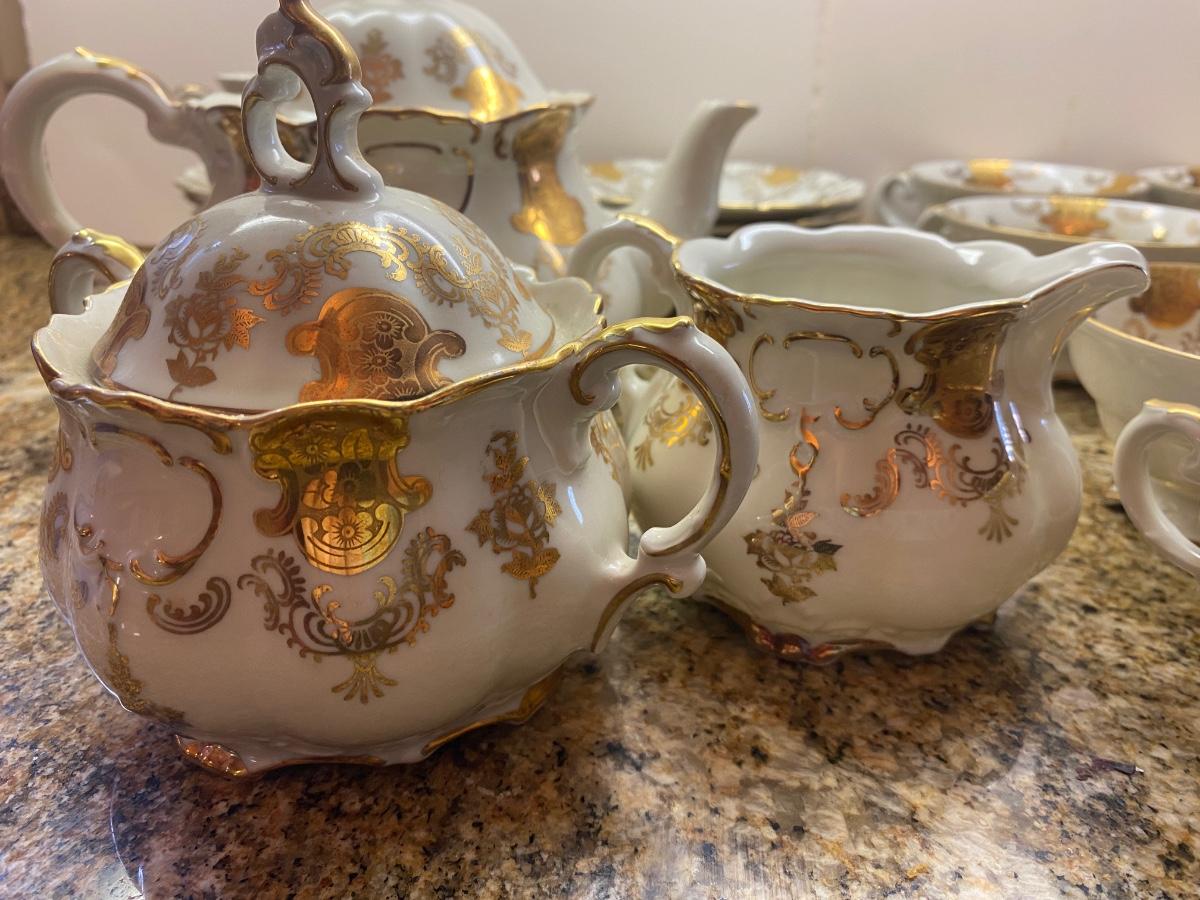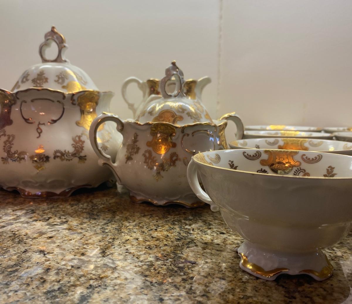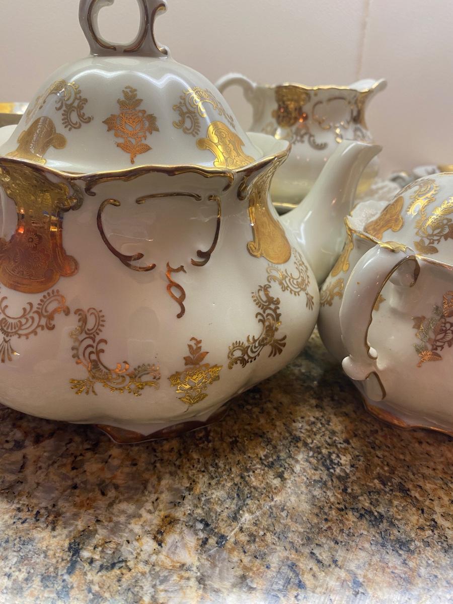 13 cups, 12 saucers, a teapot and sugar and creamer. In very good shape, no chips noticed