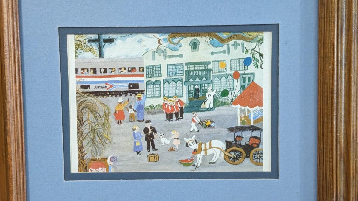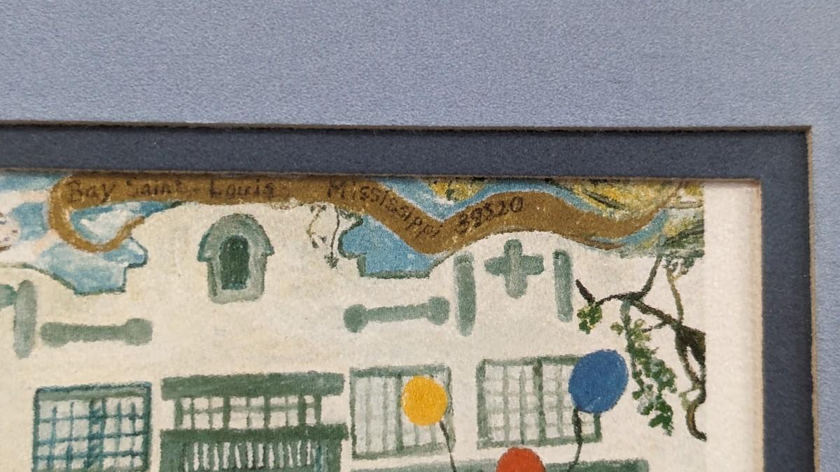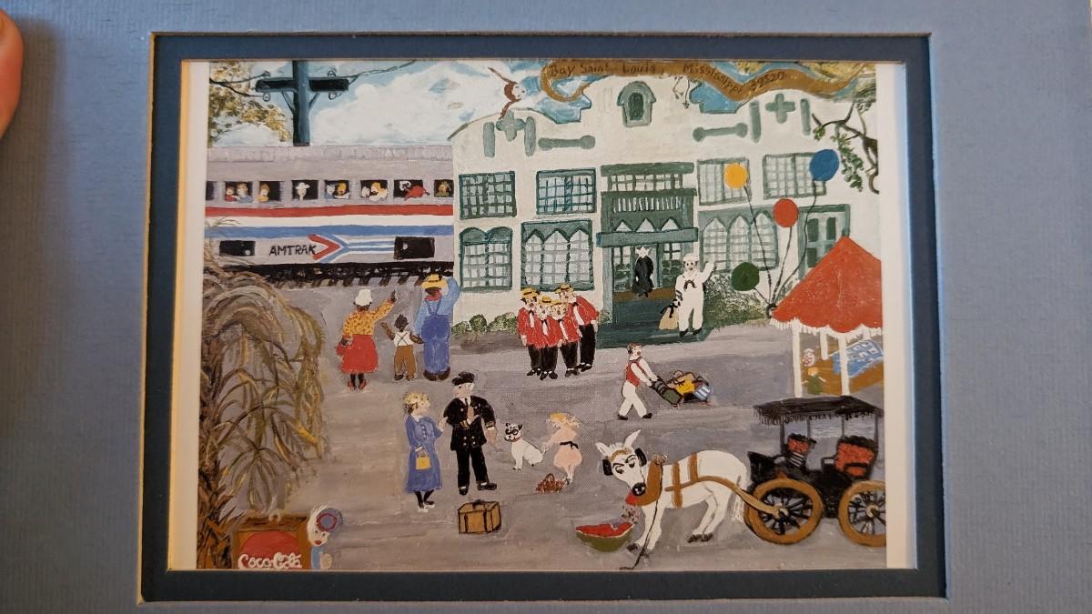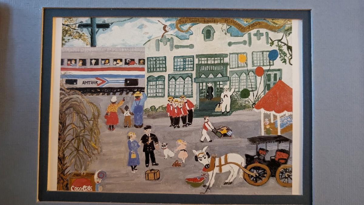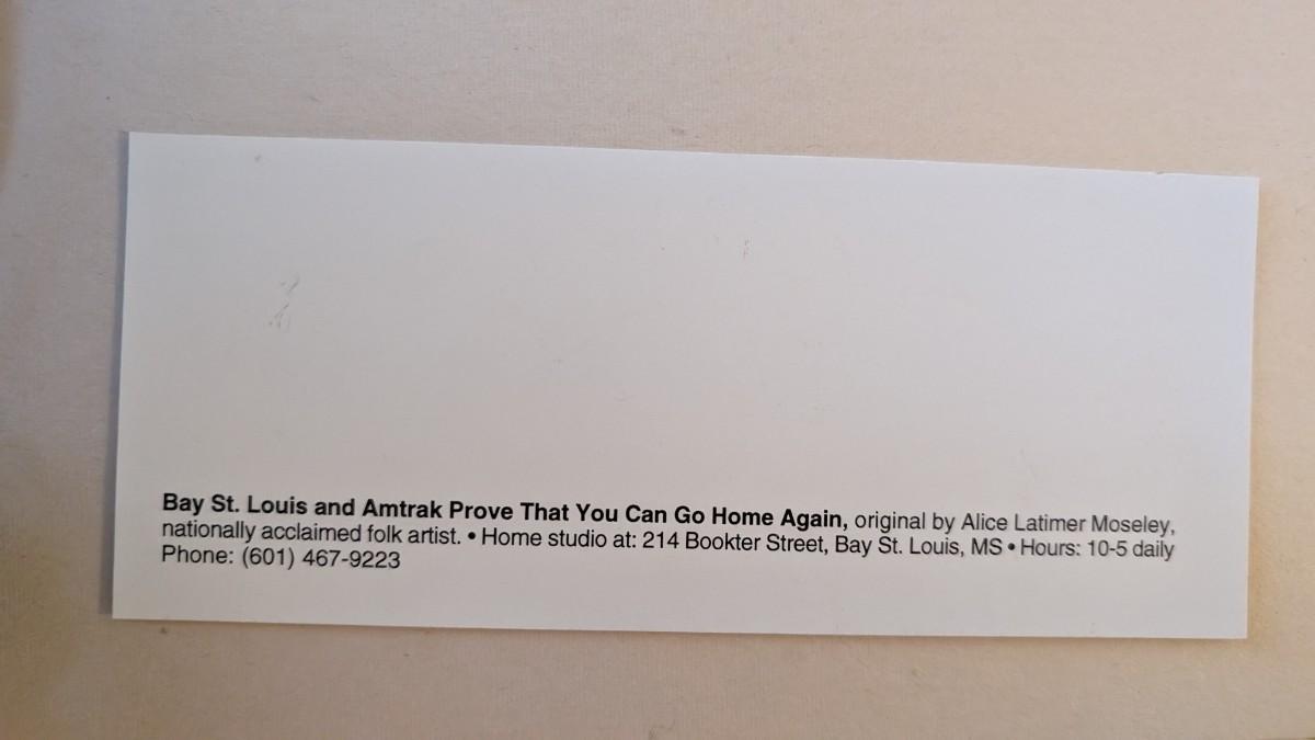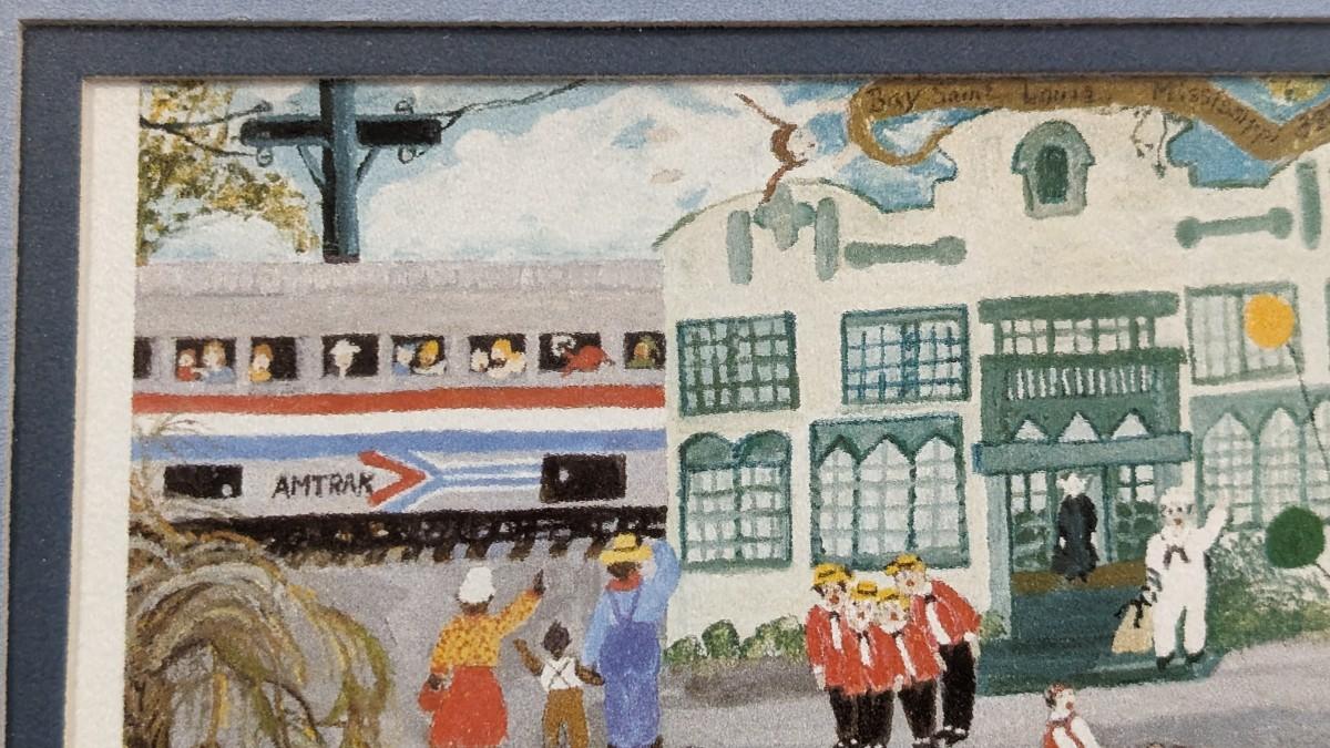 This is an original by Alice Latimer Moseley, nationally acclaimed folk artist. "Bay St Louis and Amtrak Prove That You Can Go Home" Art Framed Print with Blue Mat. Wooden frame has some damage. The frame is approximately 10" x 12".