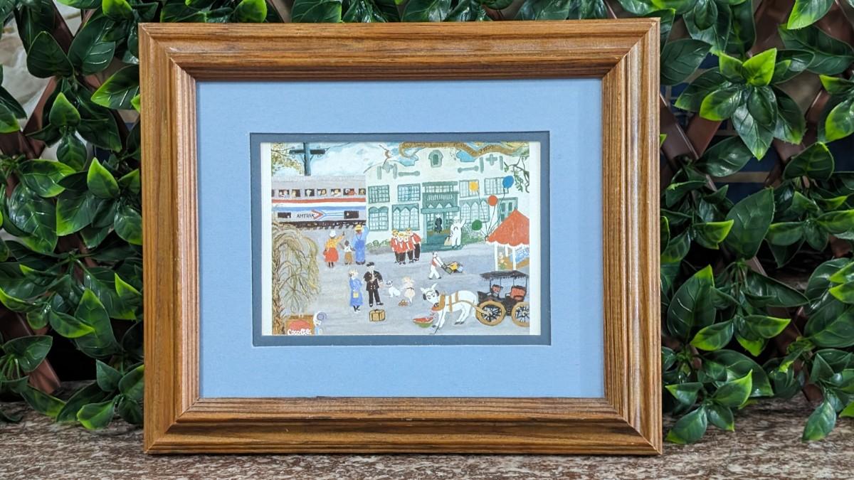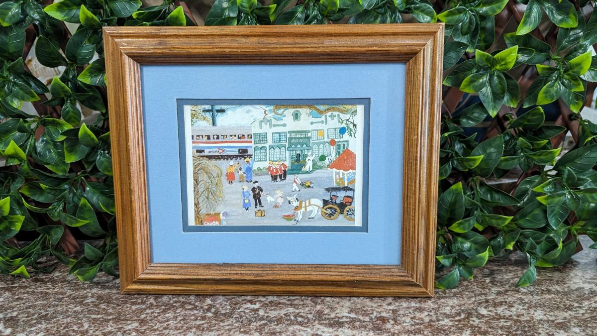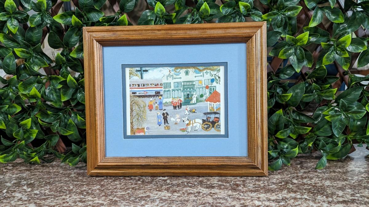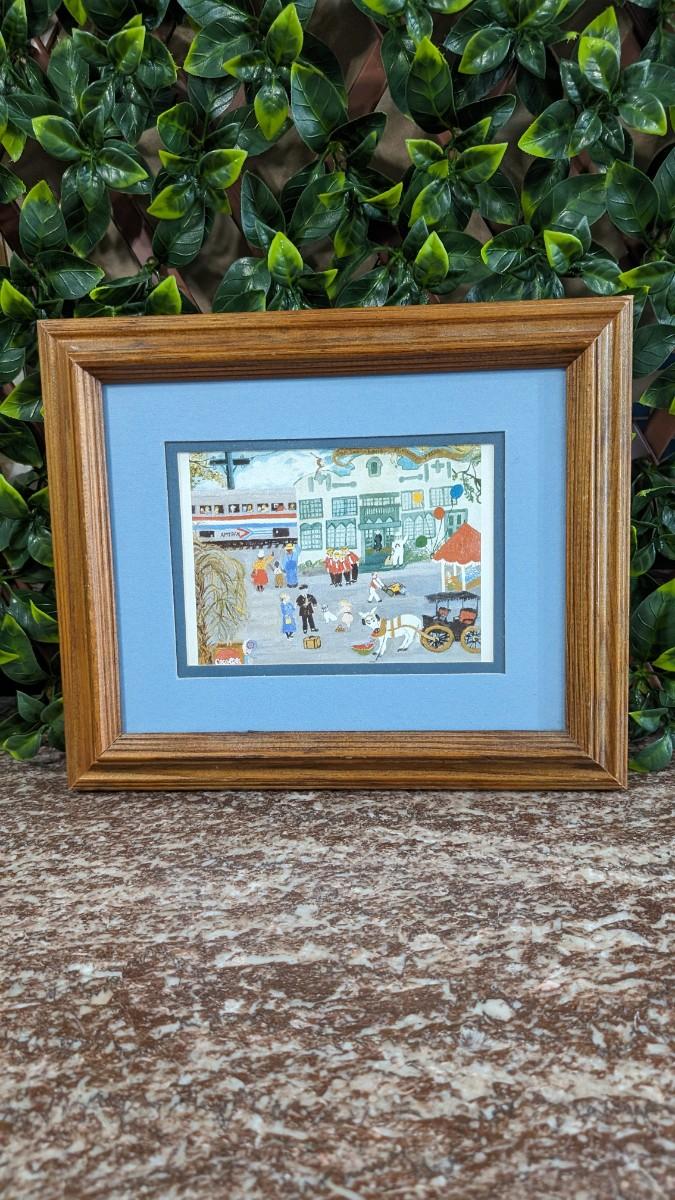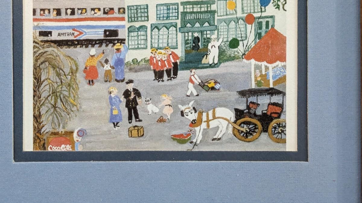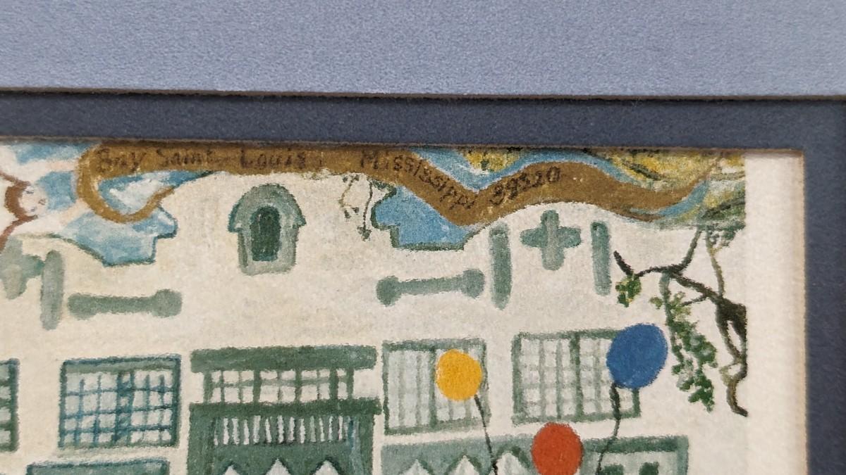 This is an original by Alice Latimer Moseley, nationally acclaimed folk artist. "Bay St Louis and Amtrak Prove That You Can Go Home" Art Framed Print with Blue Mat. Wooden frame has some damage. The frame is approximately 10" x 12".