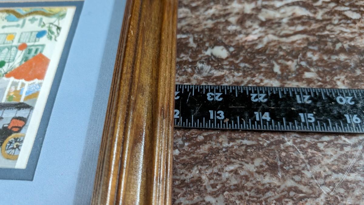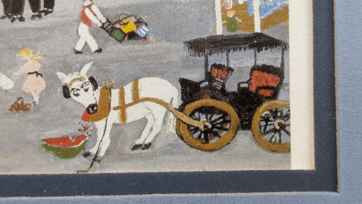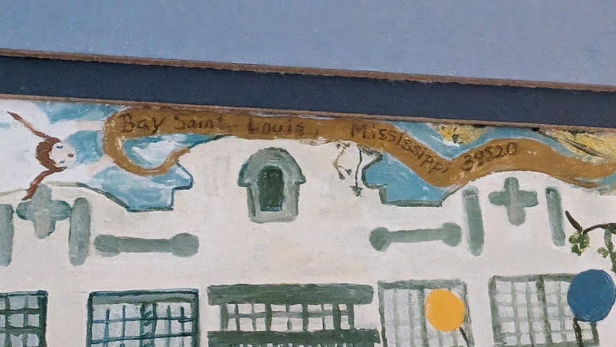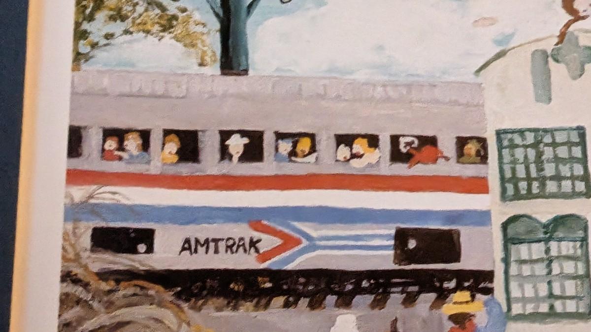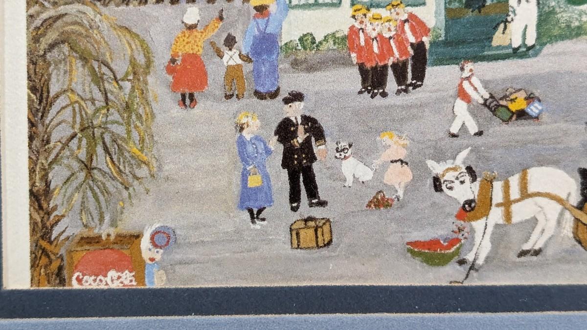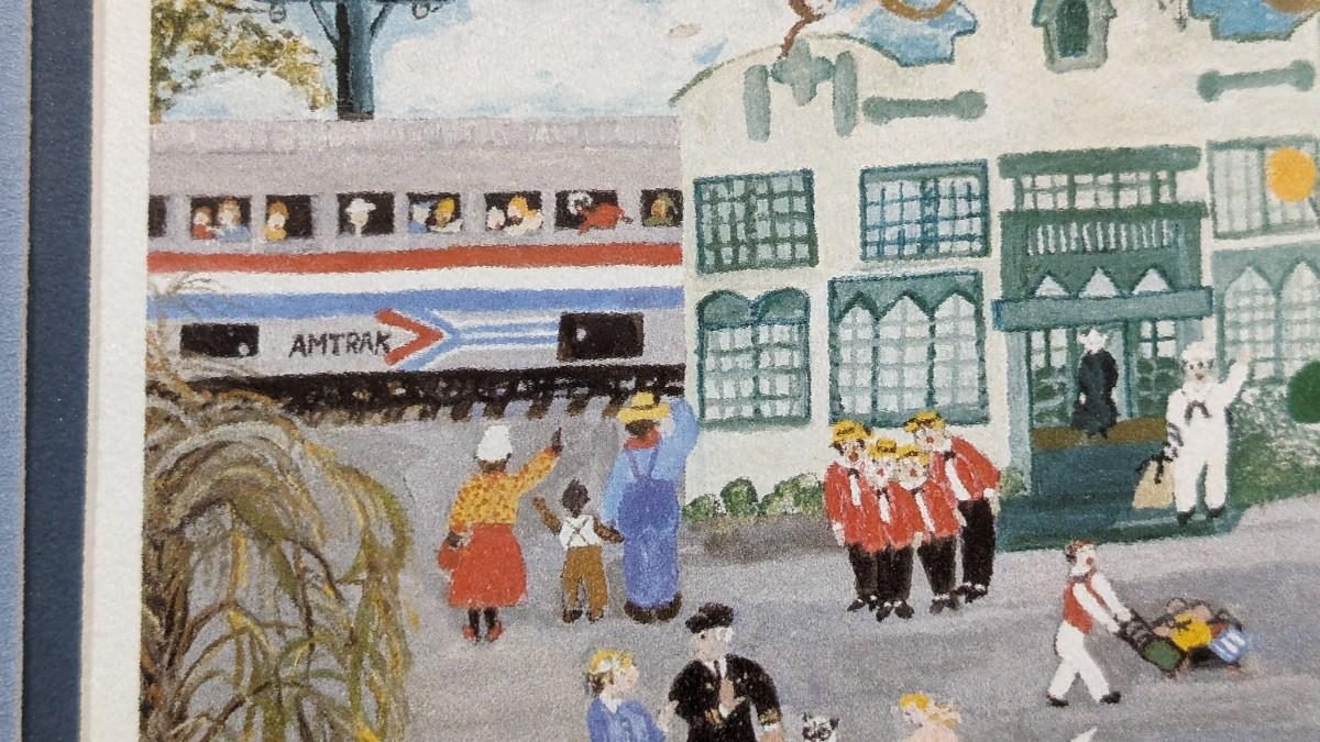 This is an original by Alice Latimer Moseley, nationally acclaimed folk artist. "Bay St Louis and Amtrak Prove That You Can Go Home" Art Framed Print with Blue Mat. Wooden frame has some damage. The frame is approximately 10" x 12".
