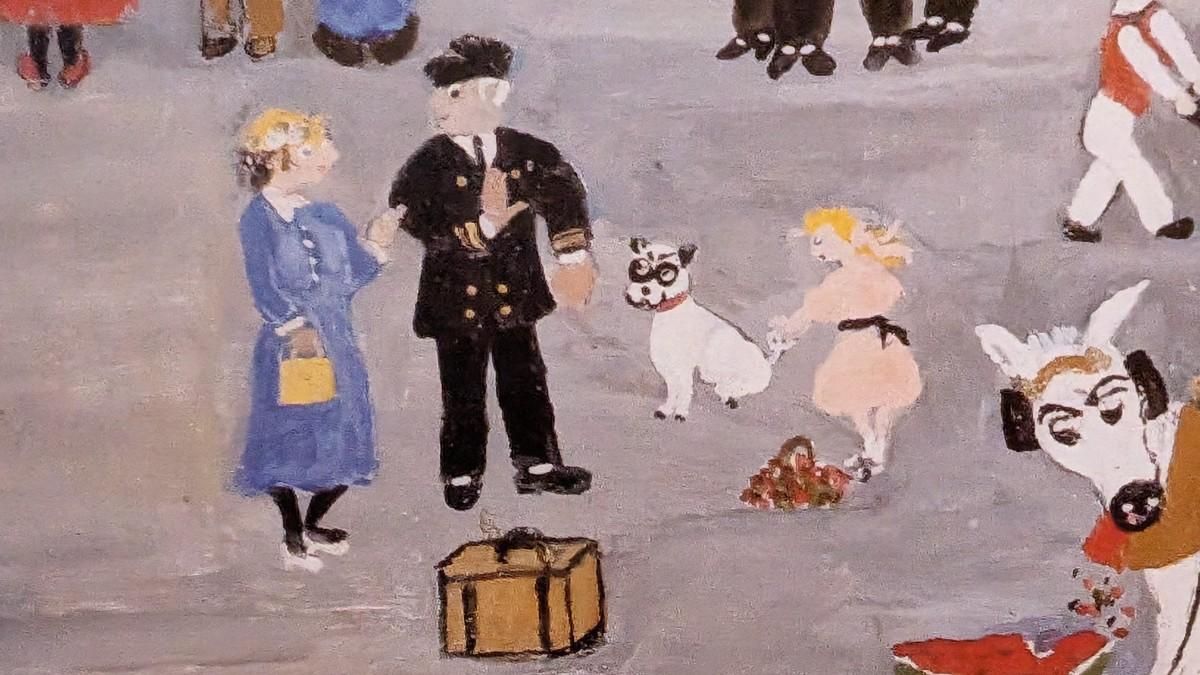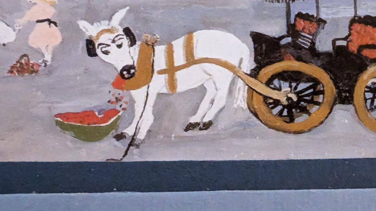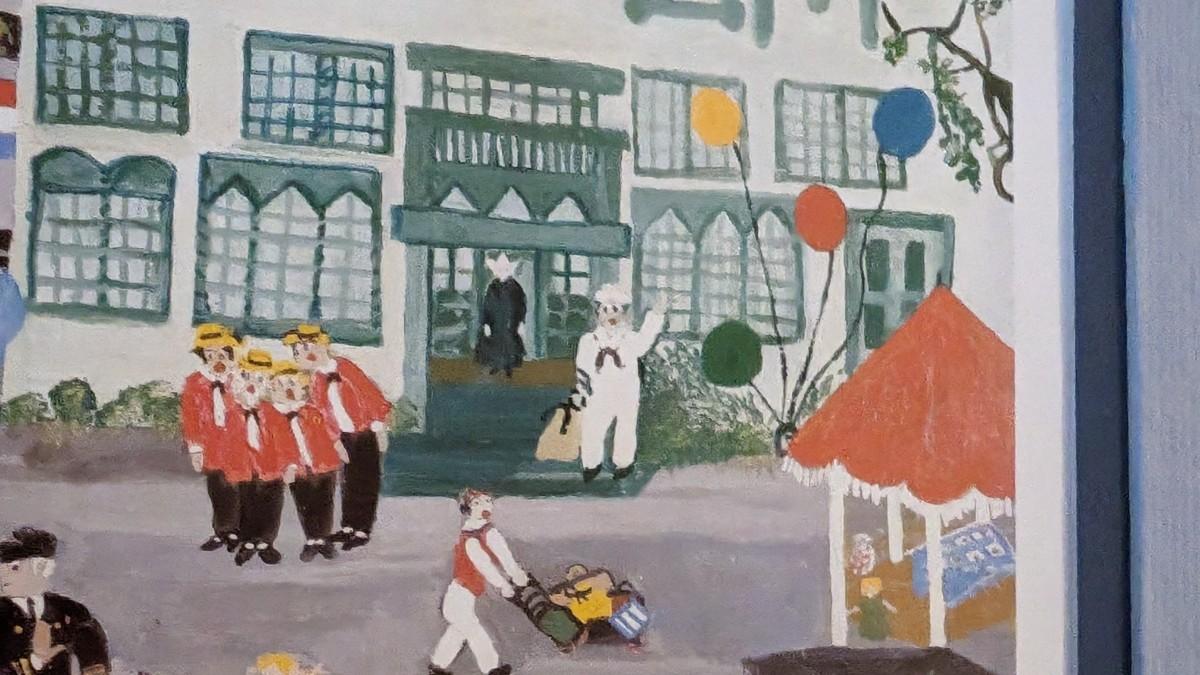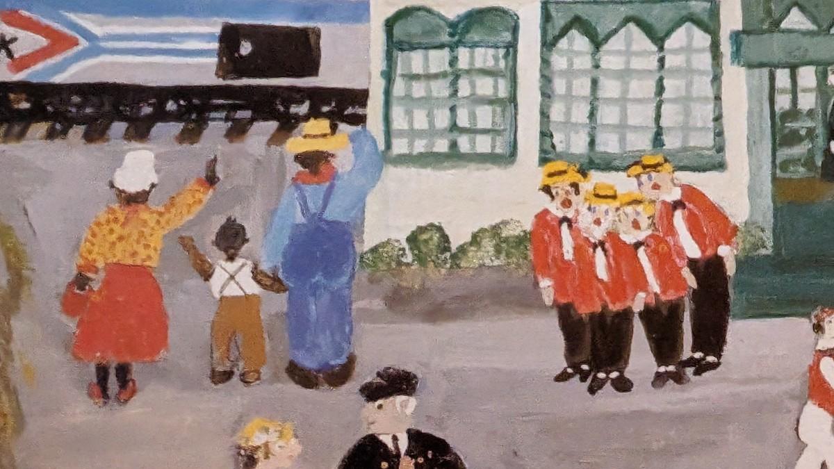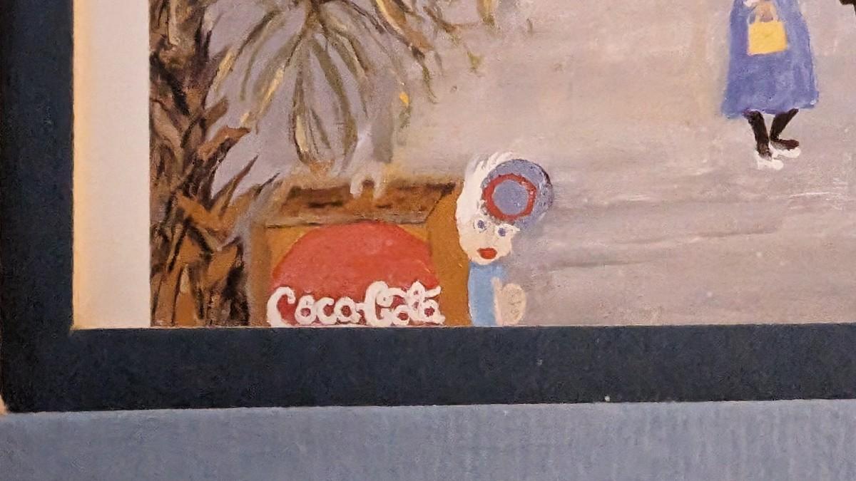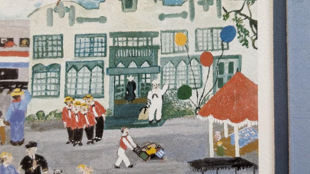 This is an original by Alice Latimer Moseley, nationally acclaimed folk artist. "Bay St Louis and Amtrak Prove That You Can Go Home" Art Framed Print with Blue Mat. Wooden frame has some damage. The frame is approximately 10" x 12".
