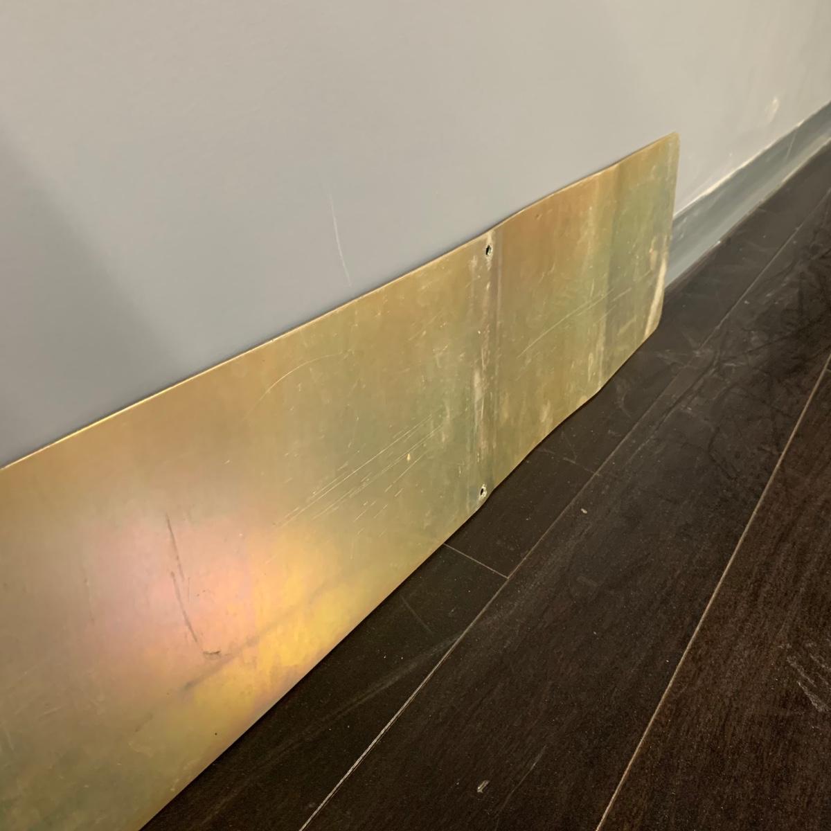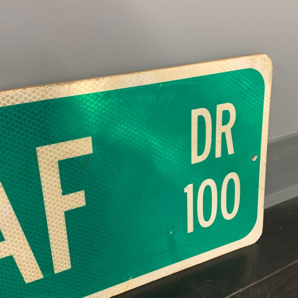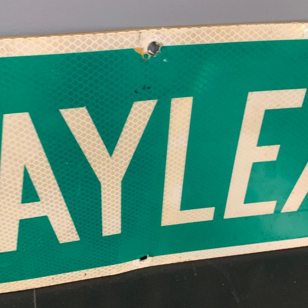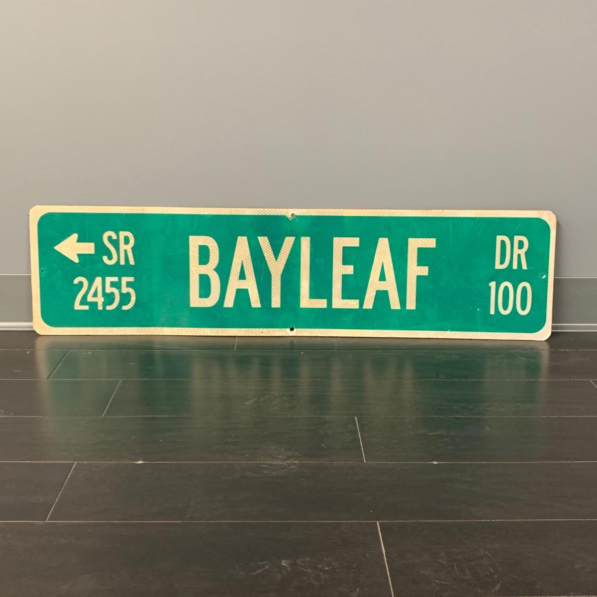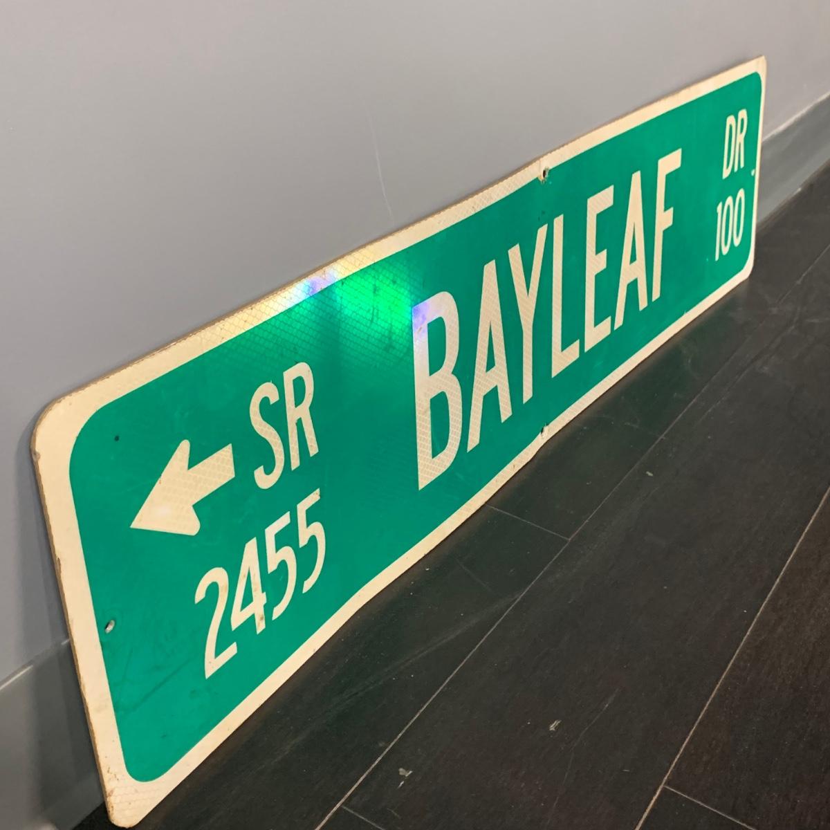 Metal Bayleaf Drive sign. Measures 36” x 9”. It has some scratches on the surface and is a bit warped and has holes from where it was previously mounted. Shipping available.