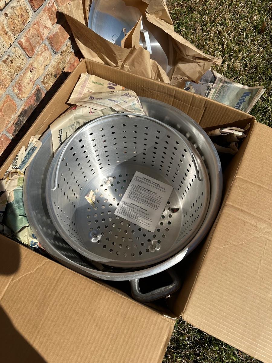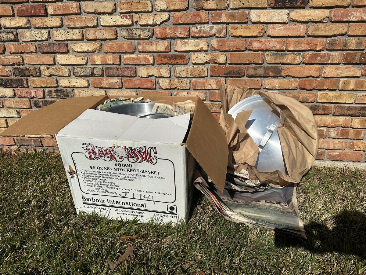 NIB Bayou Classic #8000 80-quart aluminum stockpot with matching perforated basket and aluminum lid. Heavy-duty outdoor cooking pot—great for seafood boils, crawfish, turkey frying, gumbo, and large batches. Includes original box and paperwork.
