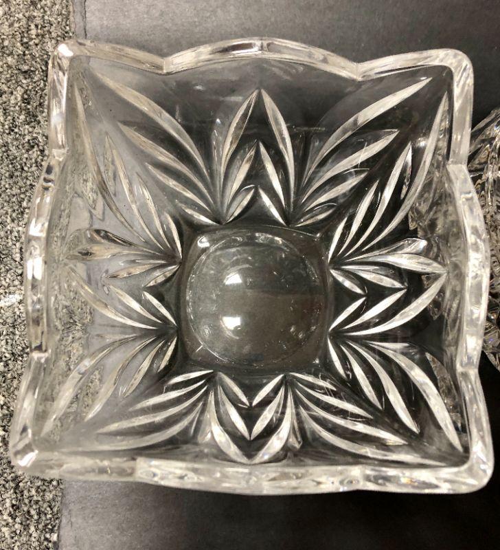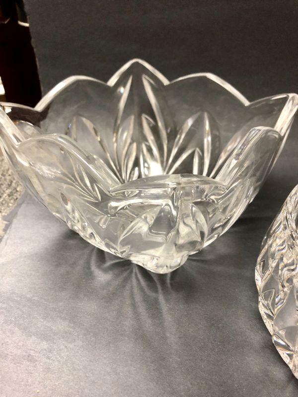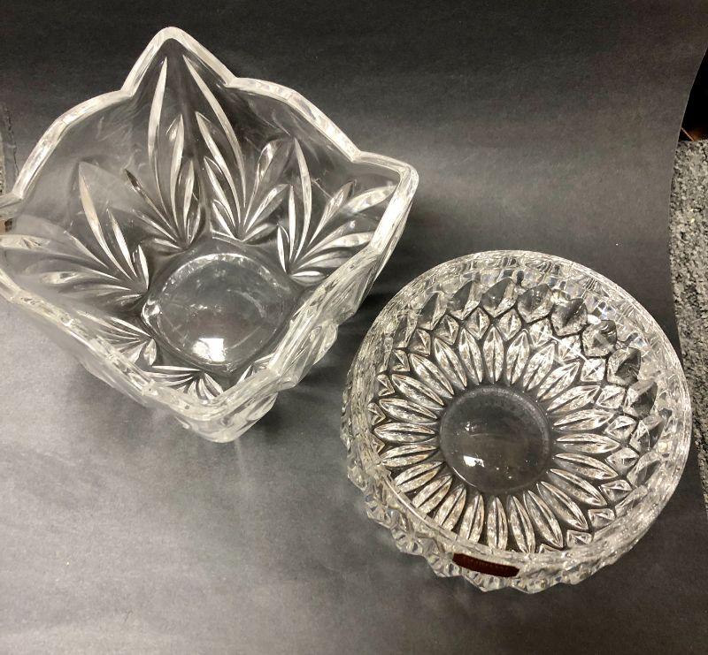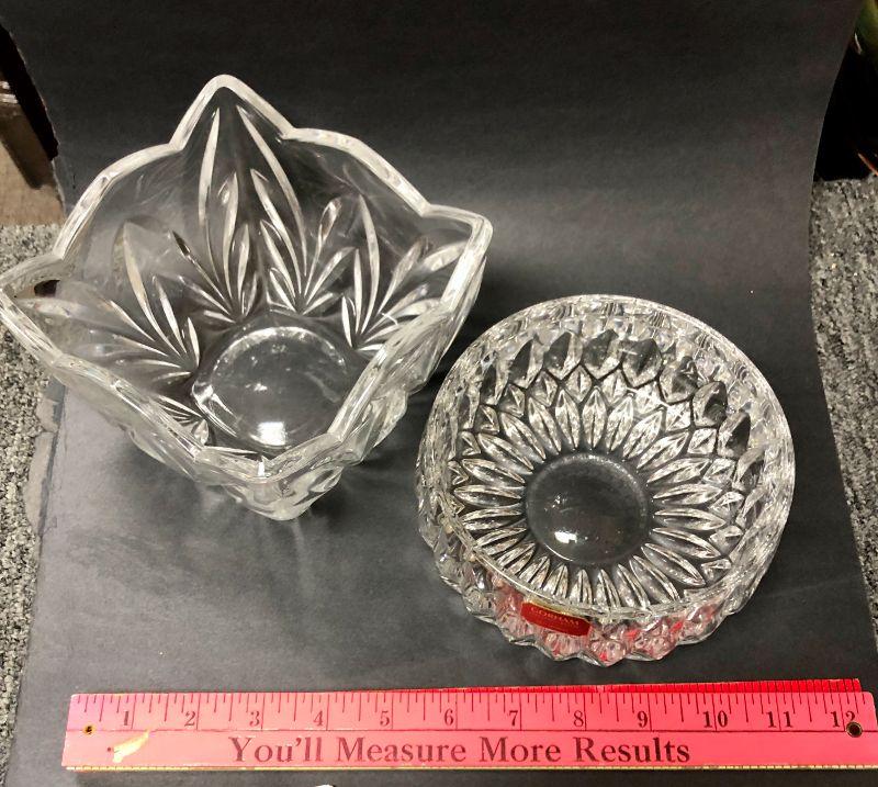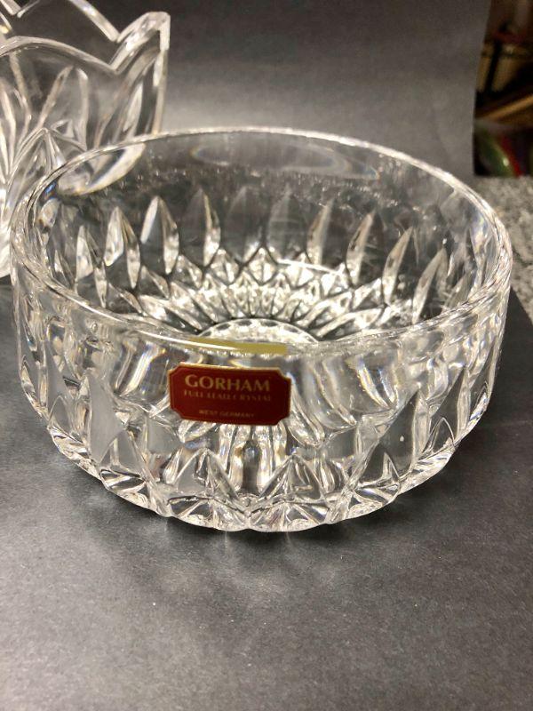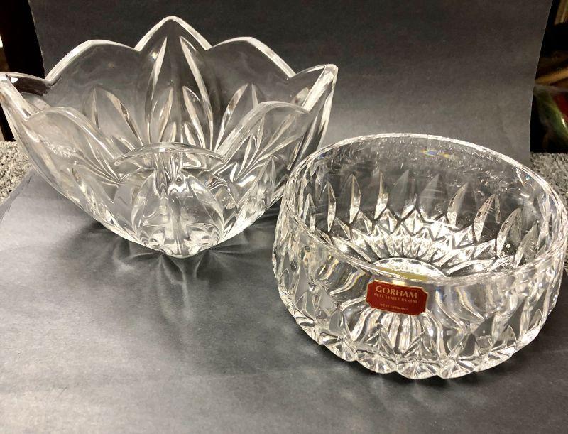 Pair of crystal bowls. Great for candy & nuts or as decor pieces. About 6" size. The round bowl is Gorham and still has original sticker on it. Both are in good condition.
