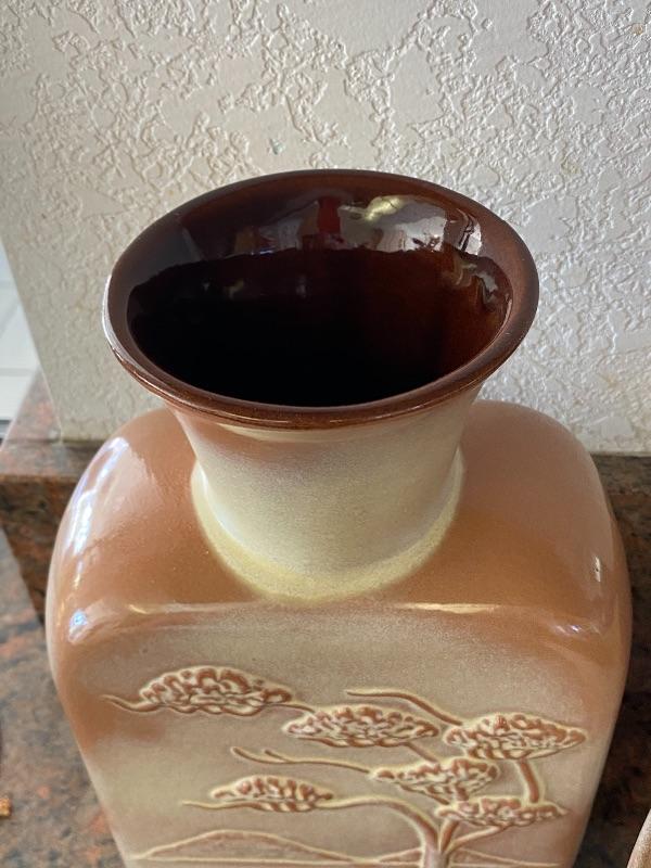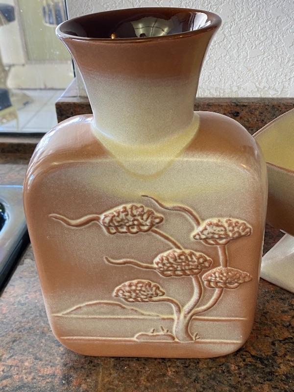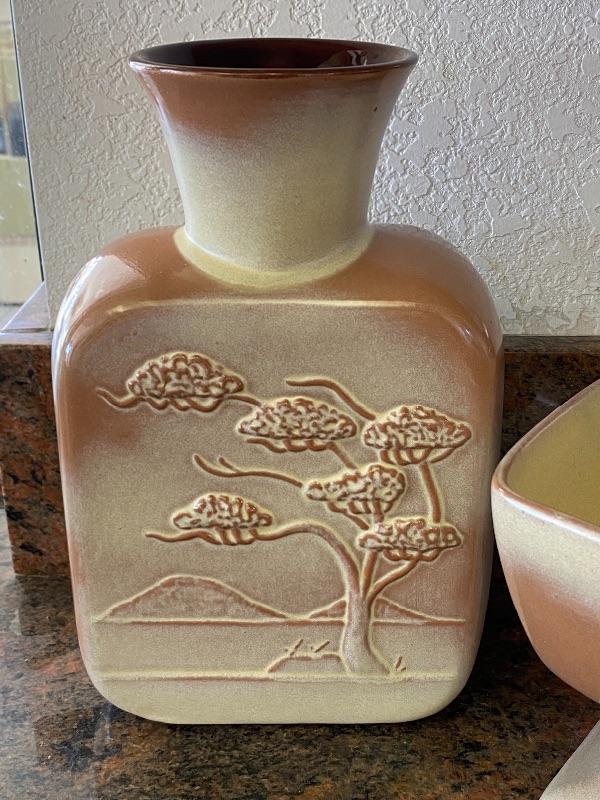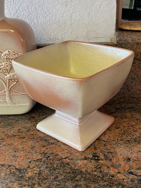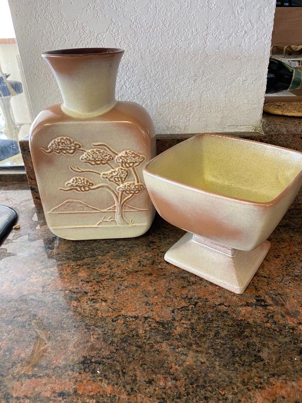 Vintage Frankoma desert gold pottery. Embossed vase is signed on the bottom "V-14 JF 1982 Frankoma Joniece Frank 2nd Edition". In excellent condition, about 12"x8". The second piece is a pedestal bowl #23A in desert gold. Bottom says "Frankoma 23A". In excellent condition, about 6" square. No chips or damage in either piece.