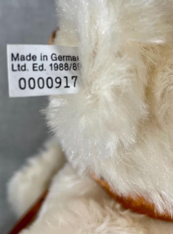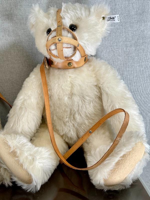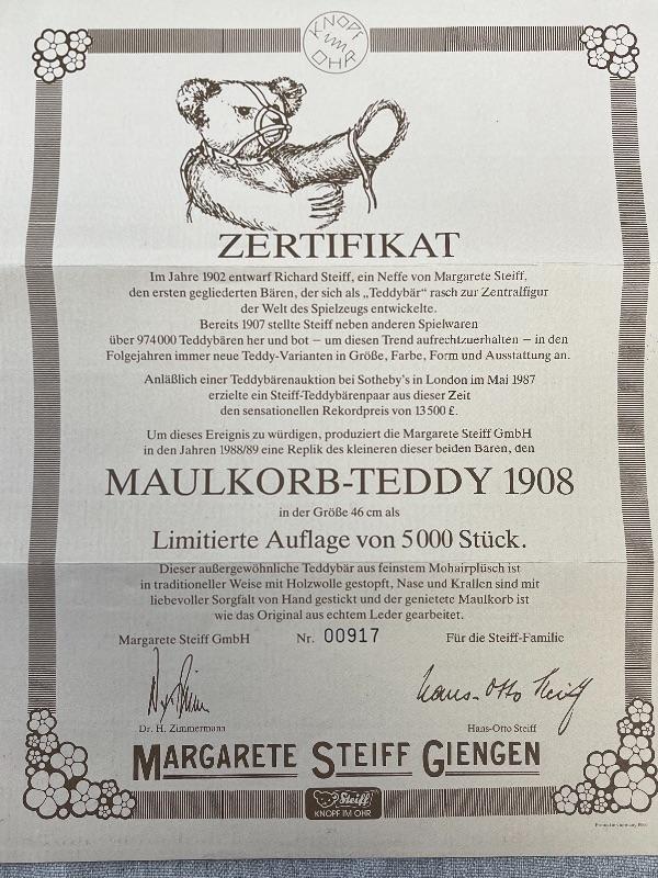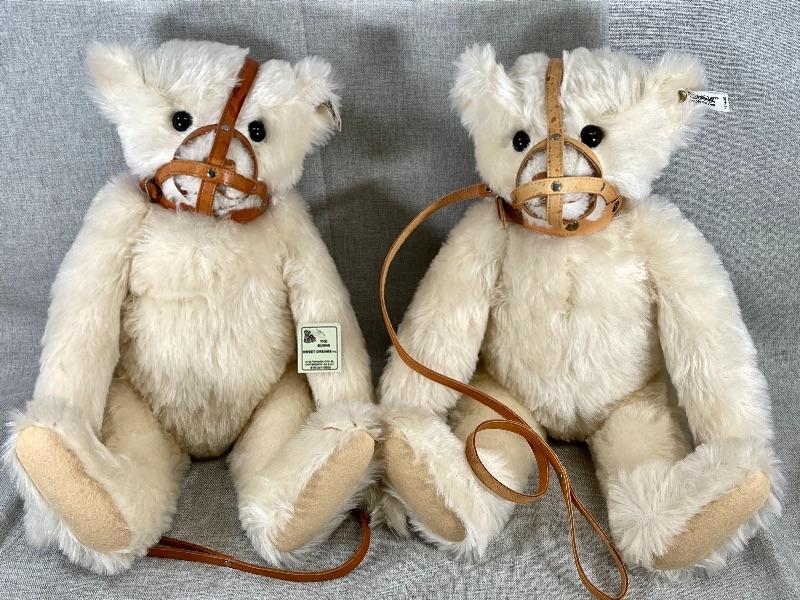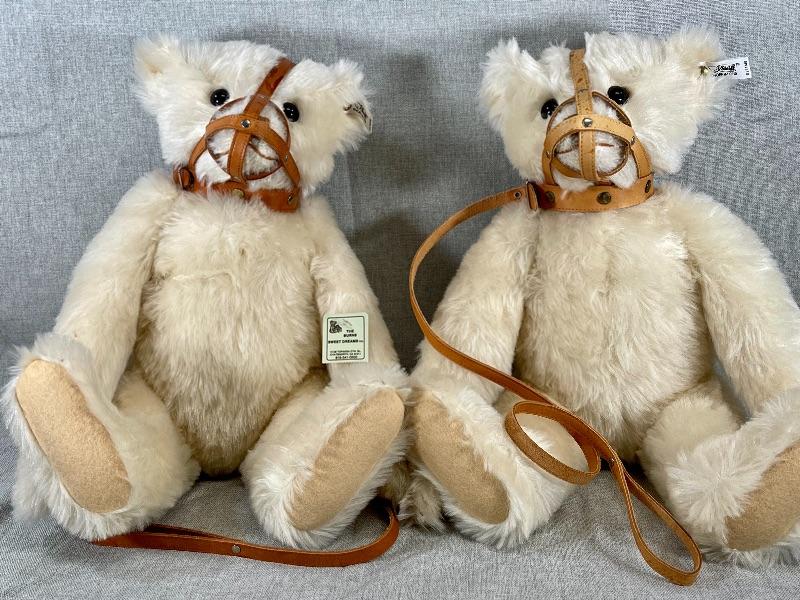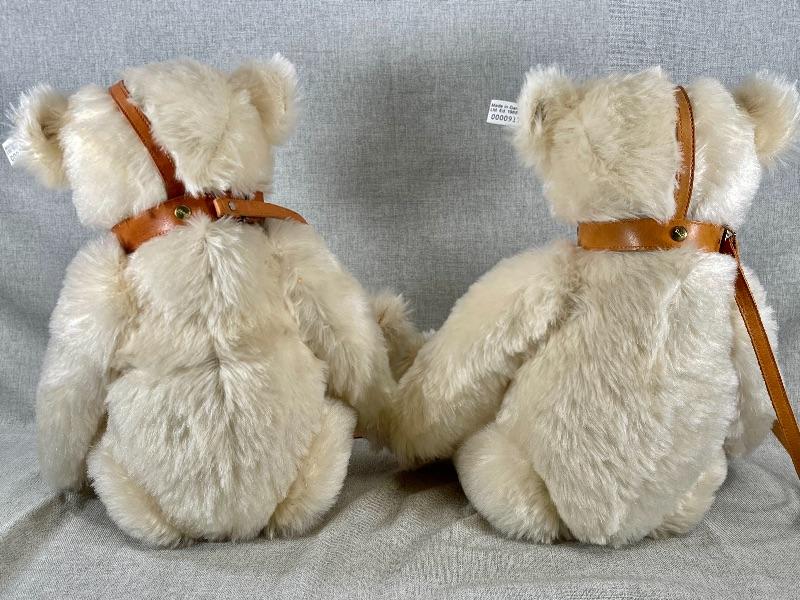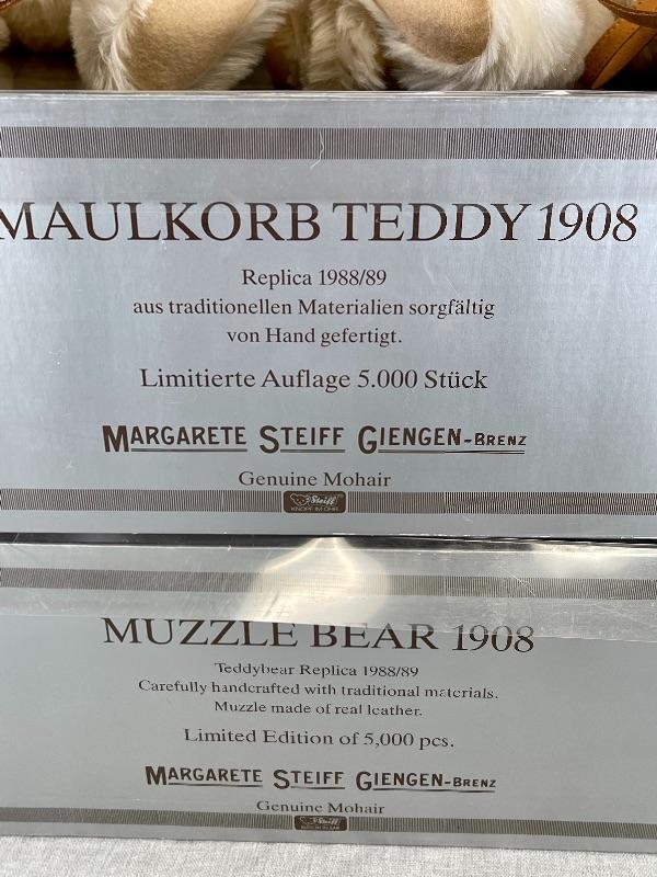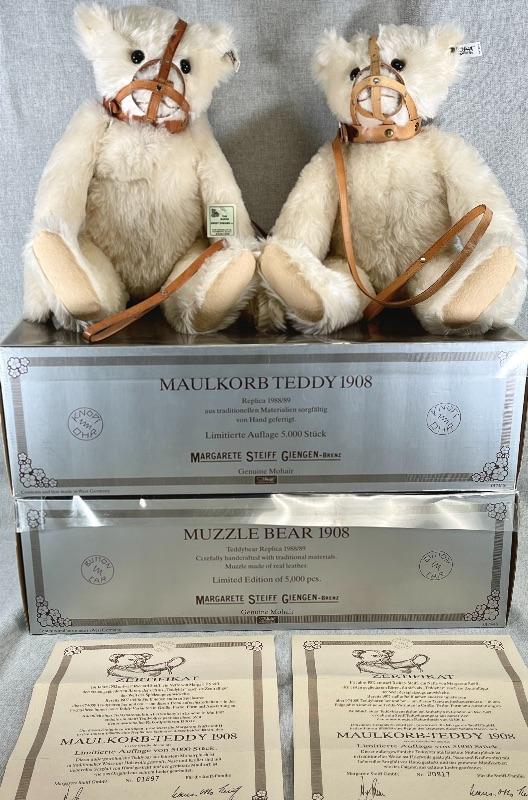 They are replicas of The Muzzle Bear 1908 designed by Margarete Steiff, made in Germany c. 1988/89. The bears are 18" in size and come with their limited edition certificates (5000 made). As was the original these exceptional teddy bears are covered in a coat of the finest mohair plush and stuffed with excelsior; the nose and the claws are embroidered by hand with loving care and the riveted muzzles are made of genuine leather. #020-01107a1