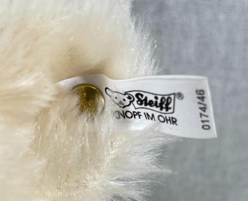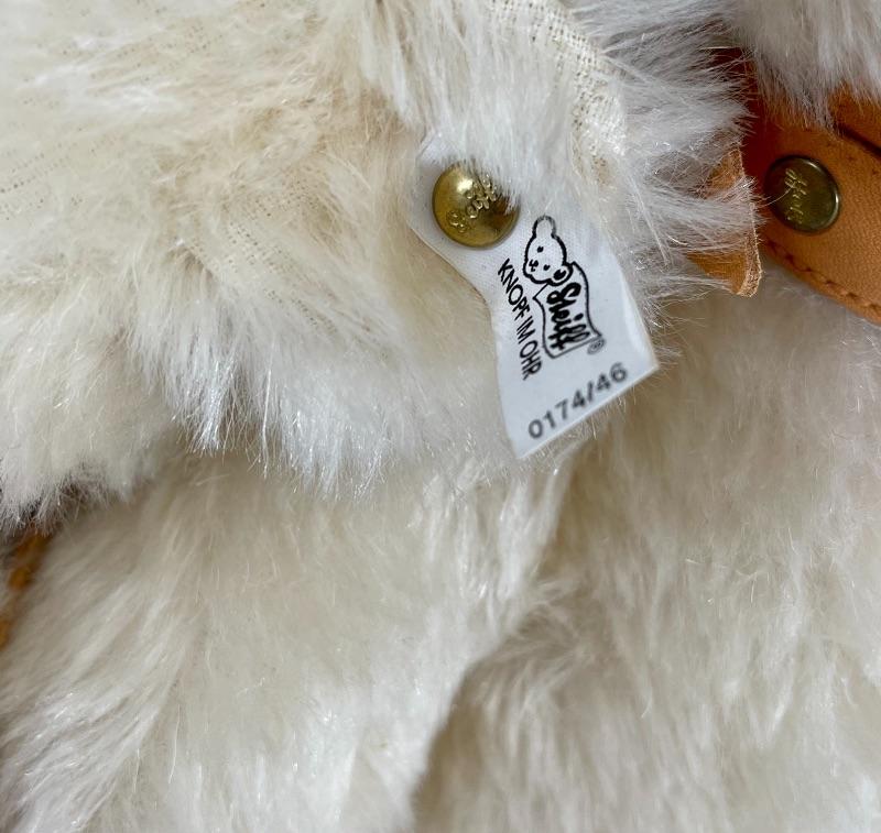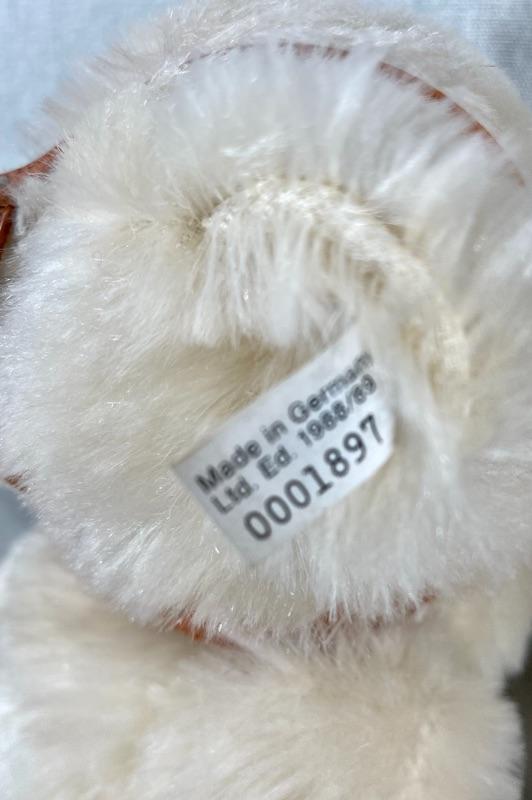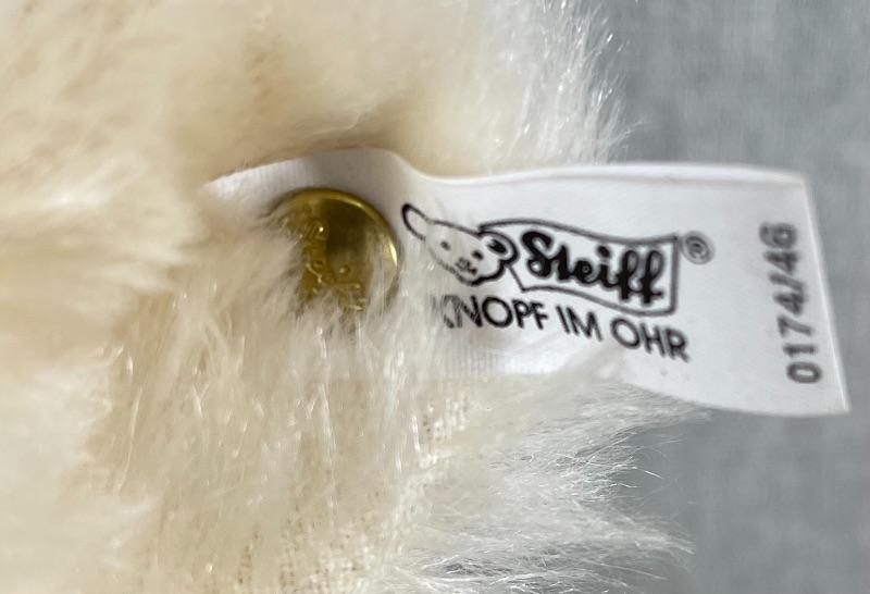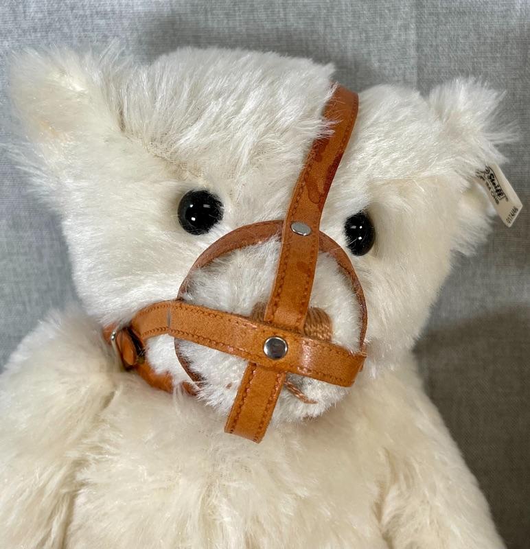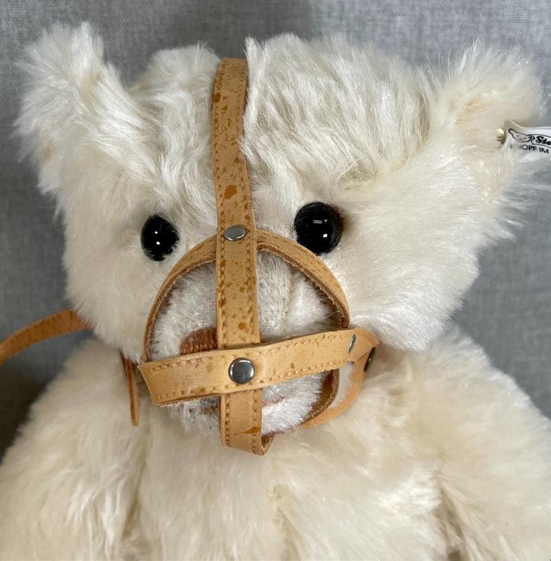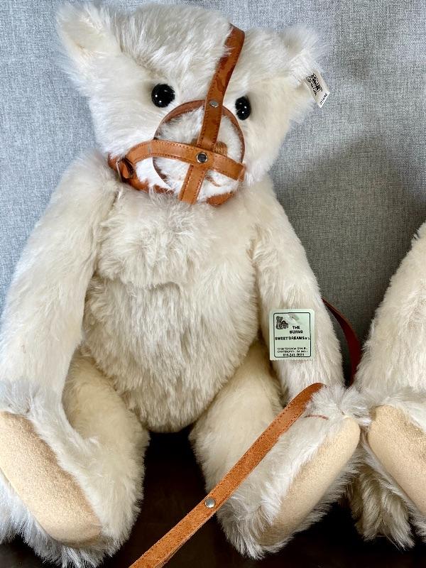 They are replicas of The Muzzle Bear 1908 designed by Margarete Steiff, made in Germany c. 1988/89. The bears are 18" in size and come with their limited edition certificates (5000 made). As was the original these exceptional teddy bears are covered in a coat of the finest mohair plush and stuffed with excelsior; the nose and the claws are embroidered by hand with loving care and the riveted muzzles are made of genuine leather. #020-01107a1