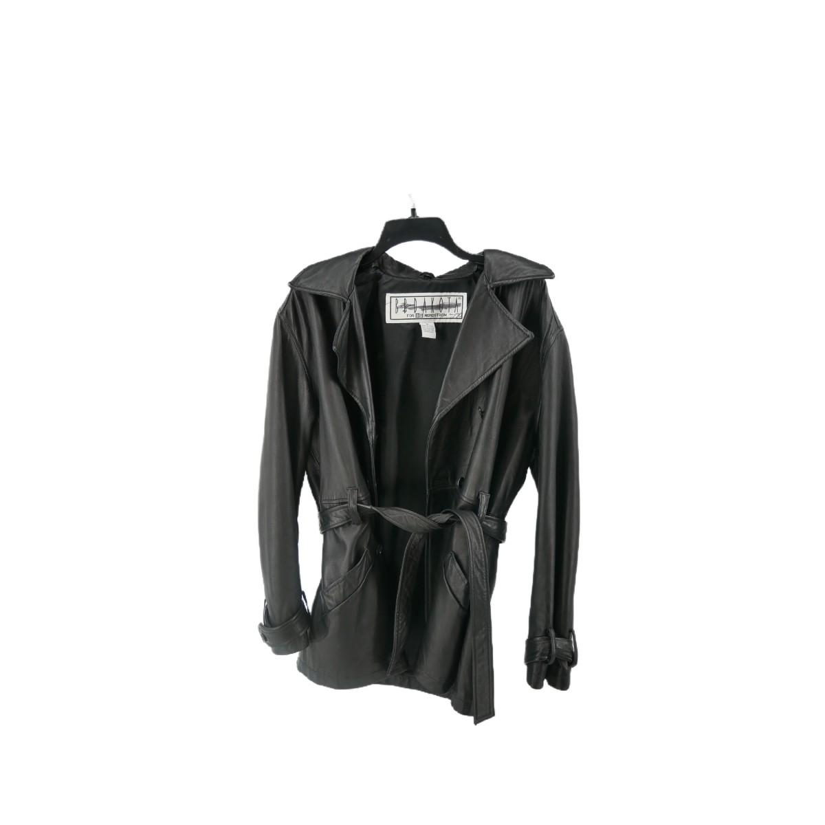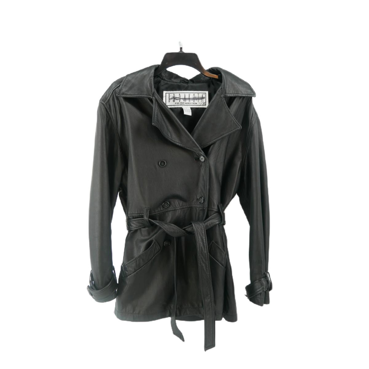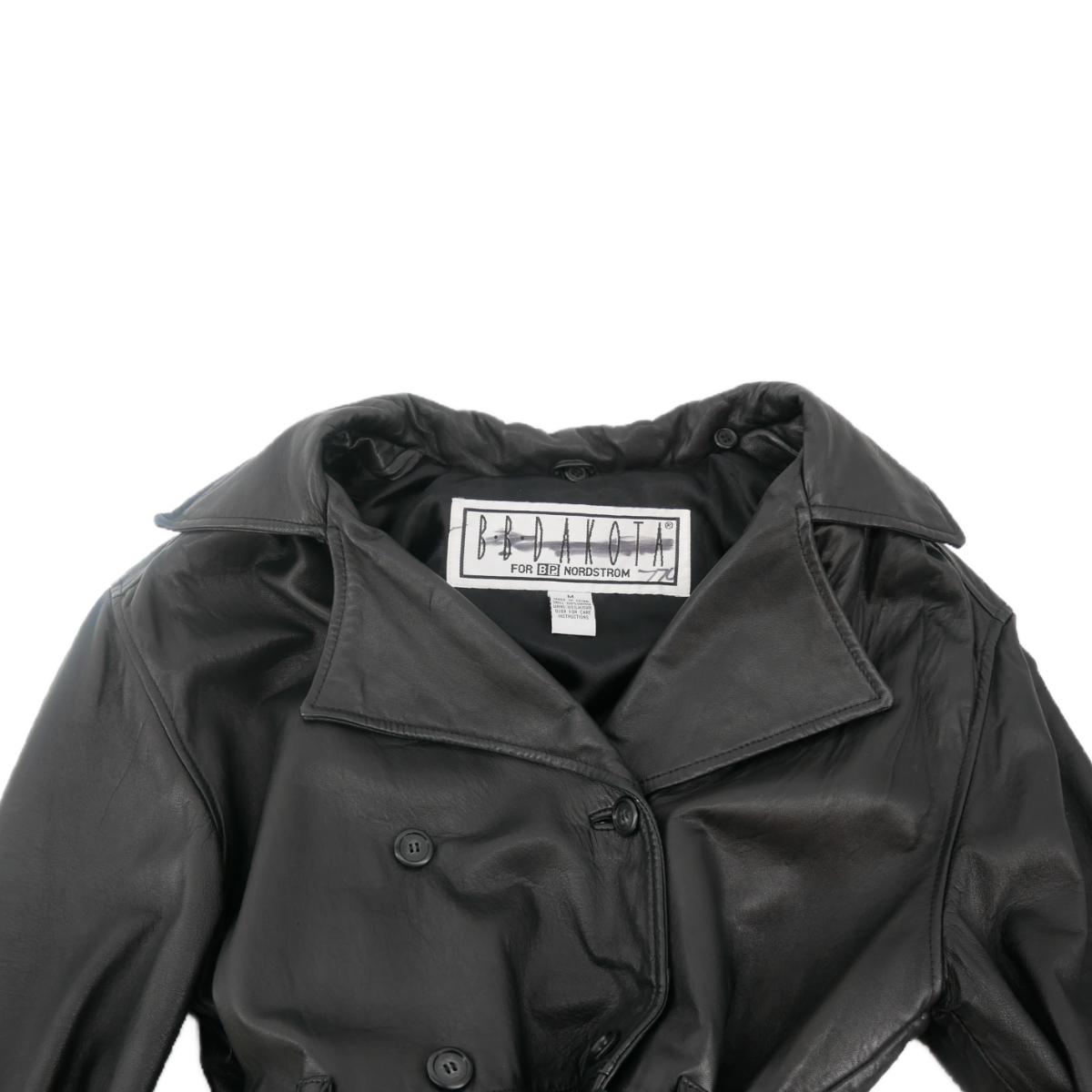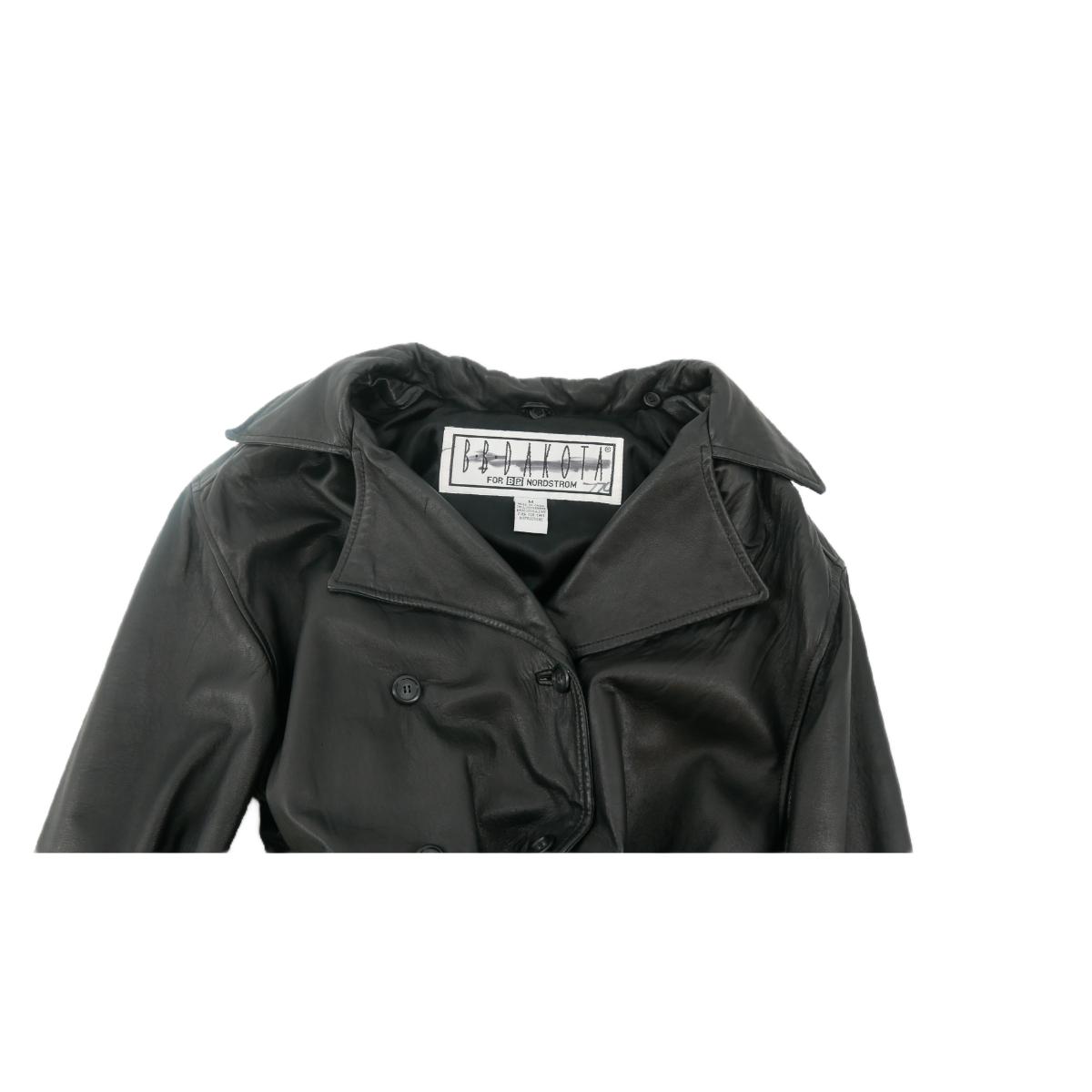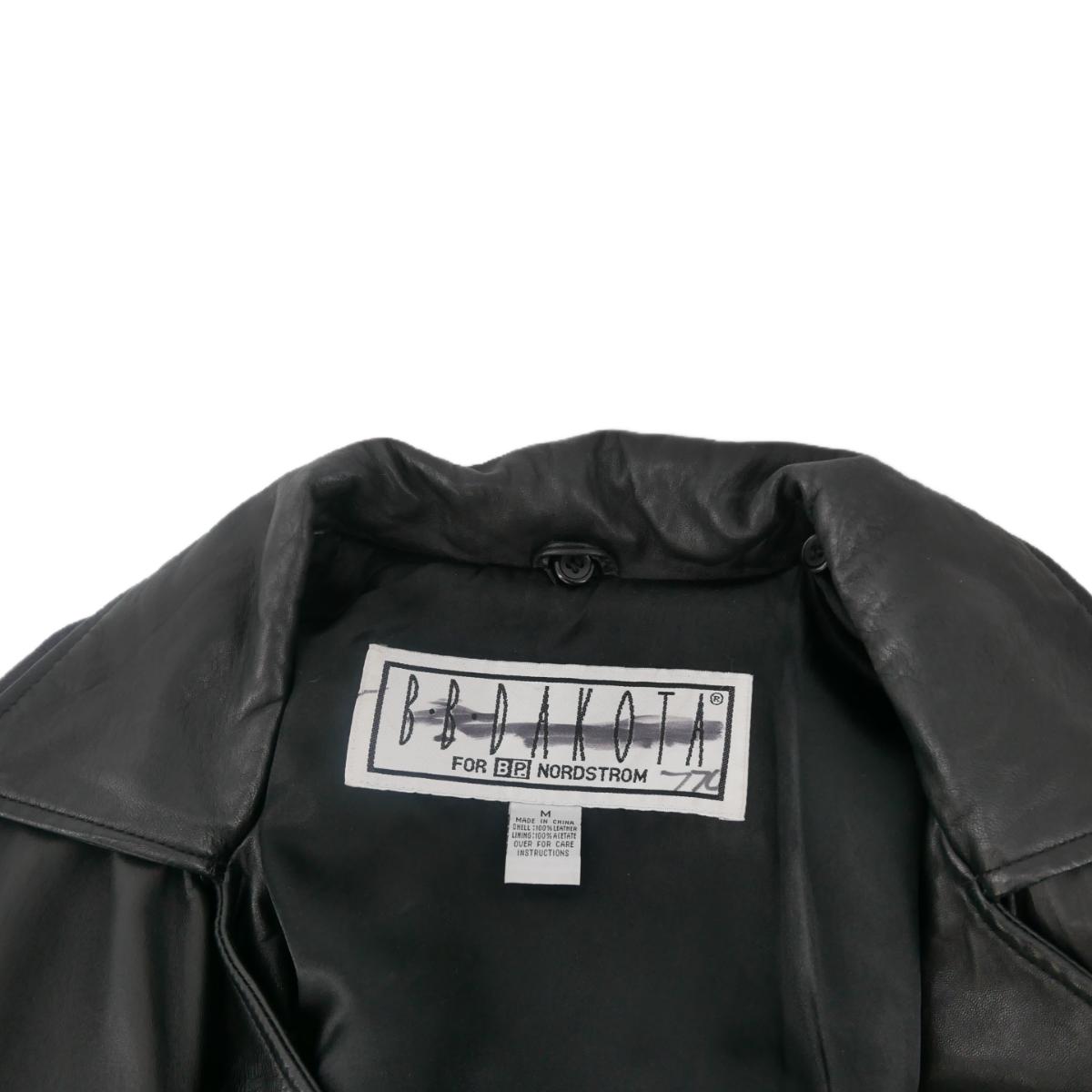 BB Dakota for B.P. Nordstrom genuine leather button down coat with waist tie. Has minimal marks, some leather stretching, and one missing button. Overall good condition. Approximate measurements: across chest 19", shoulder to bottom 27.5", arm length 23". Weighs 4lbs. (F7)