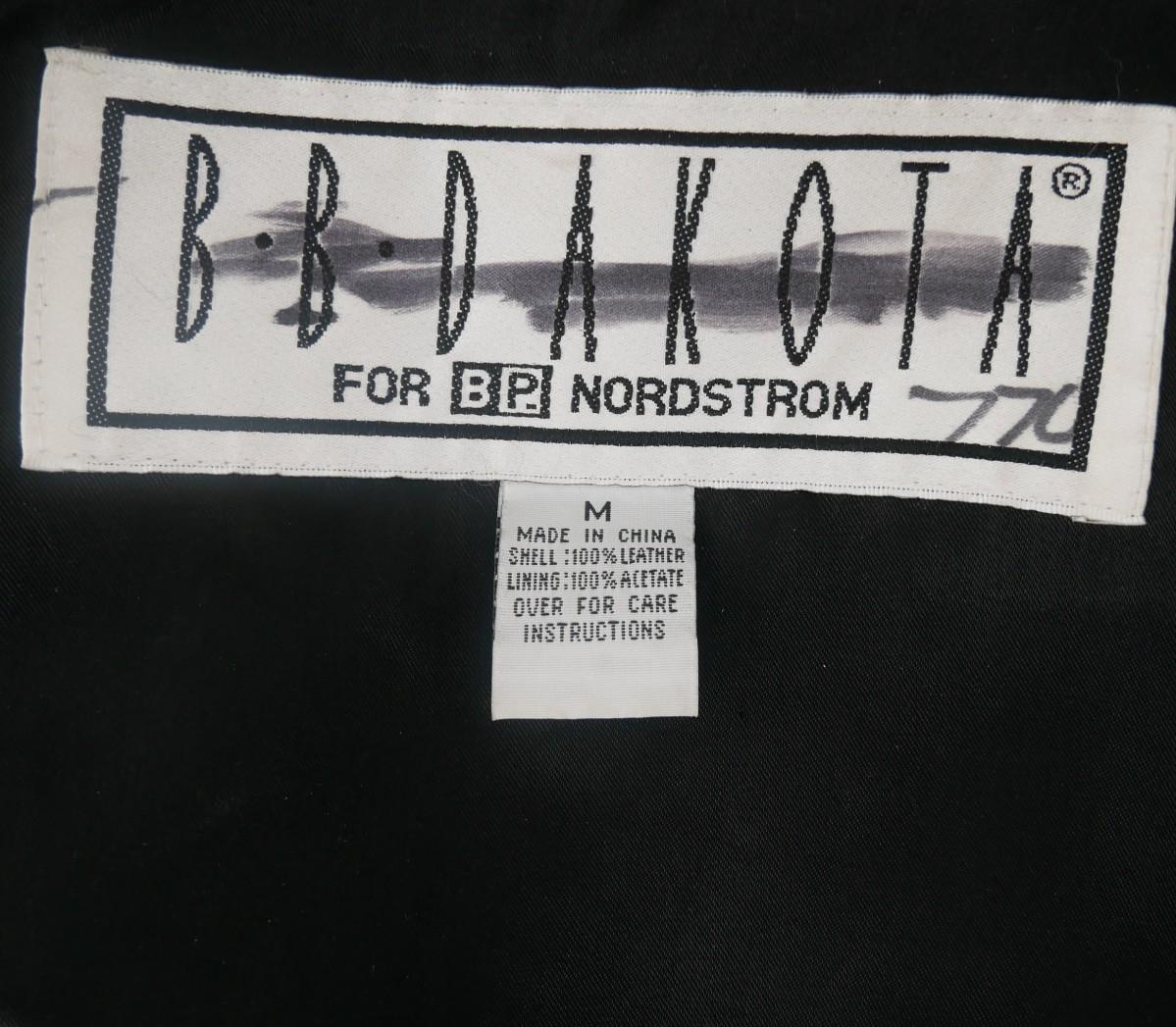 BB Dakota for B.P. Nordstrom genuine leather button down coat with waist tie. Has minimal marks, some leather stretching, and one missing button. Overall good condition. Approximate measurements: across chest 19", shoulder to bottom 27.5", arm length 23". Weighs 4lbs. (F7)