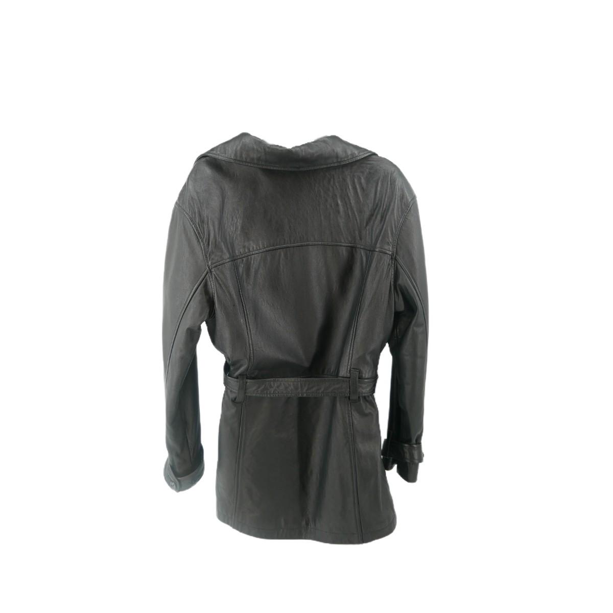 BB Dakota for B.P. Nordstrom genuine leather button down coat with waist tie. Has minimal marks, some leather stretching, and one missing button. Overall good condition. Approximate measurements: across chest 19", shoulder to bottom 27.5", arm length 23". Weighs 4lbs. (F7)