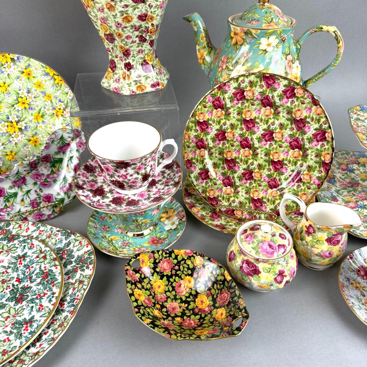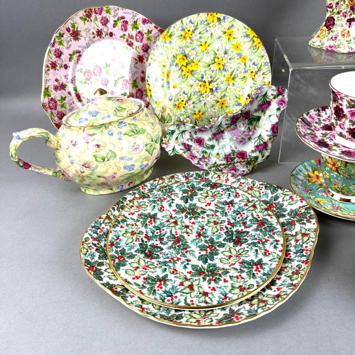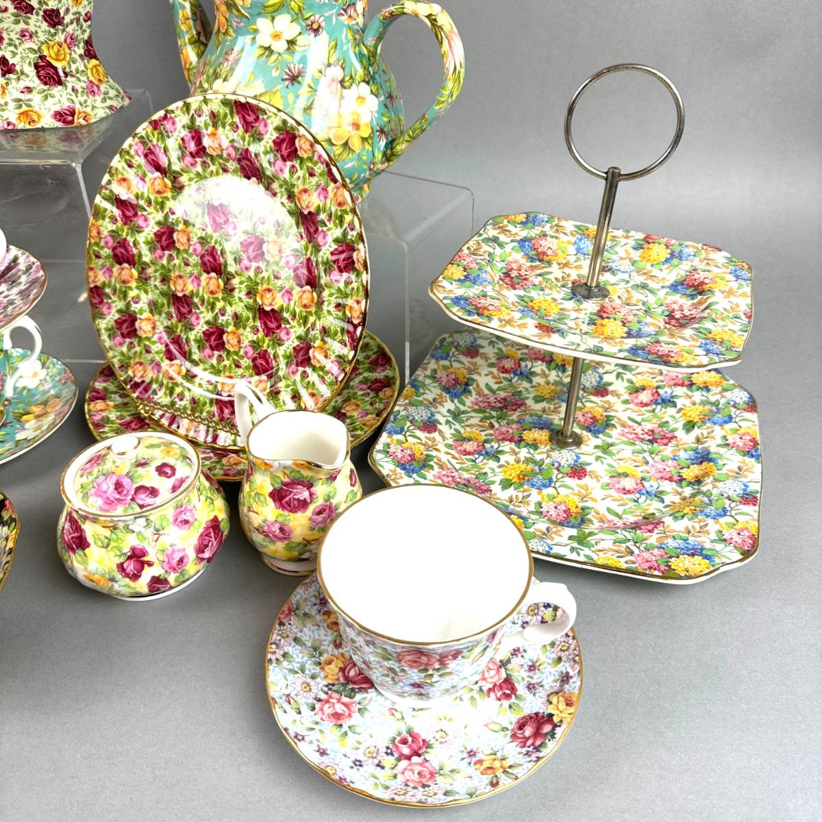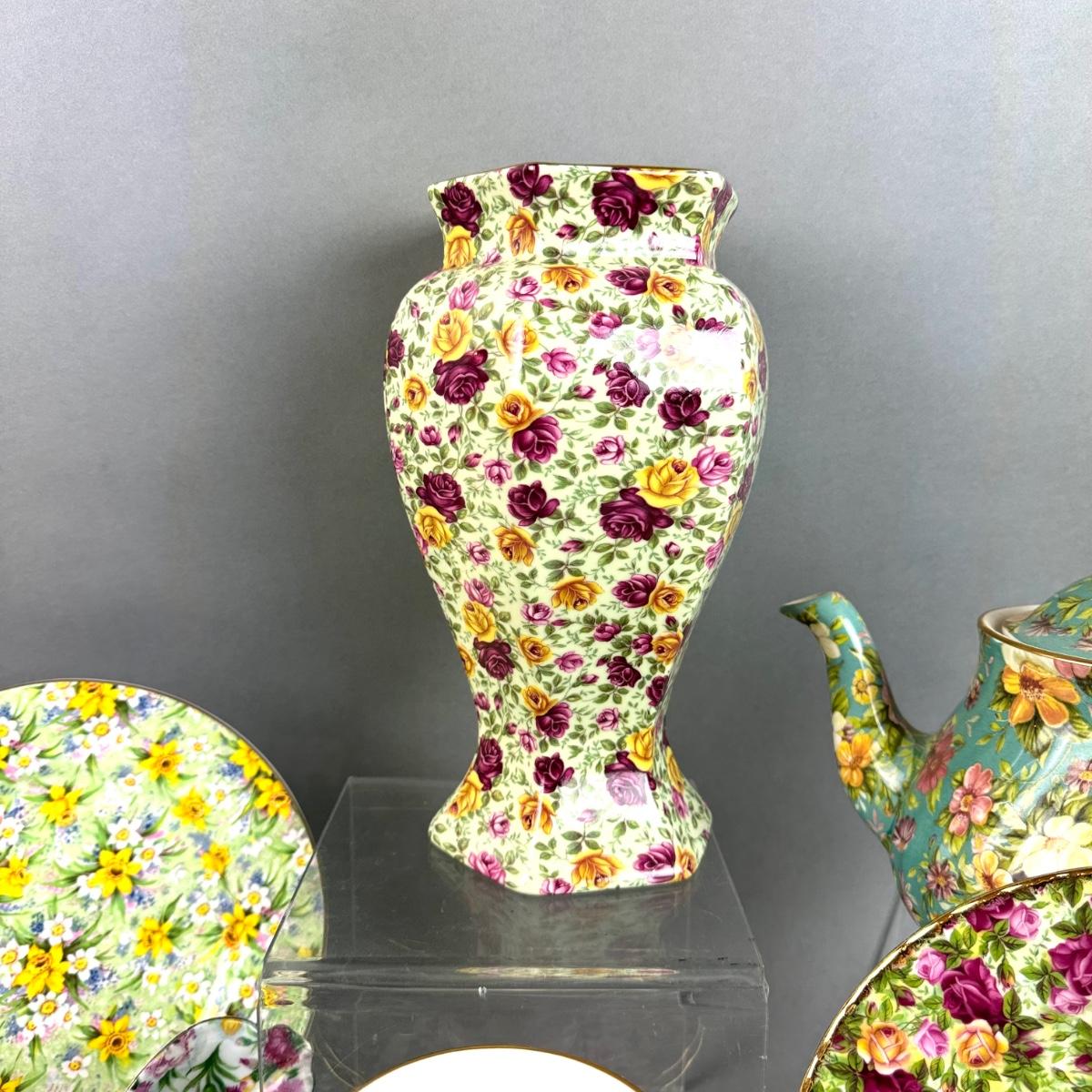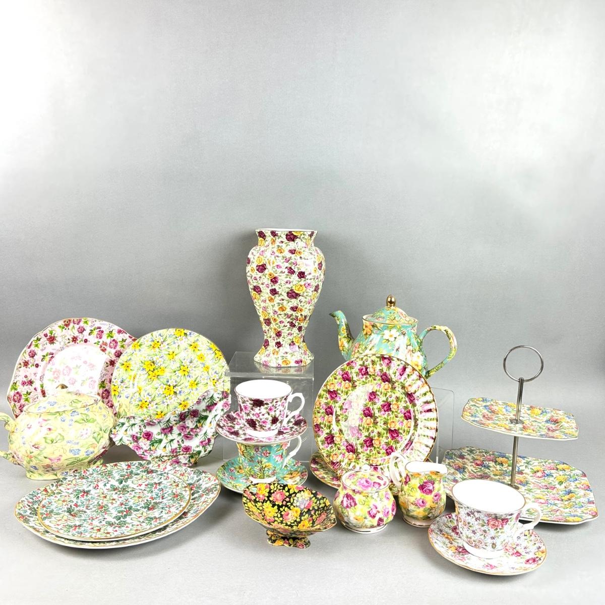 various serving dishes, vases, plates, cups and saucer, cream and sugar