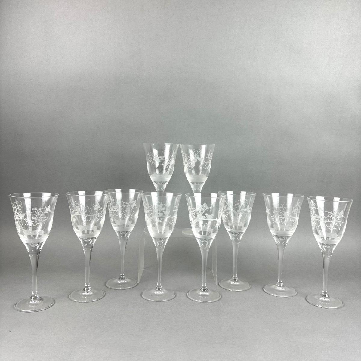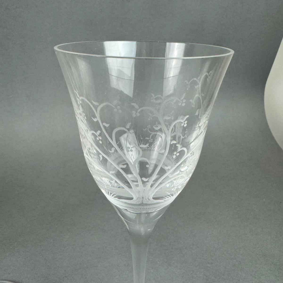 beautiful etched 8" stemware with Tree branch and birds in pattern name "Nesting"