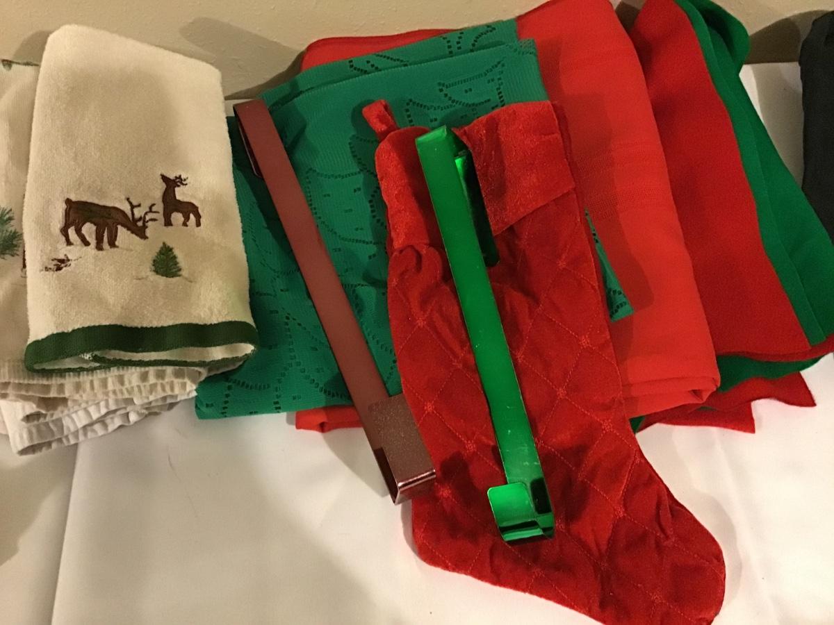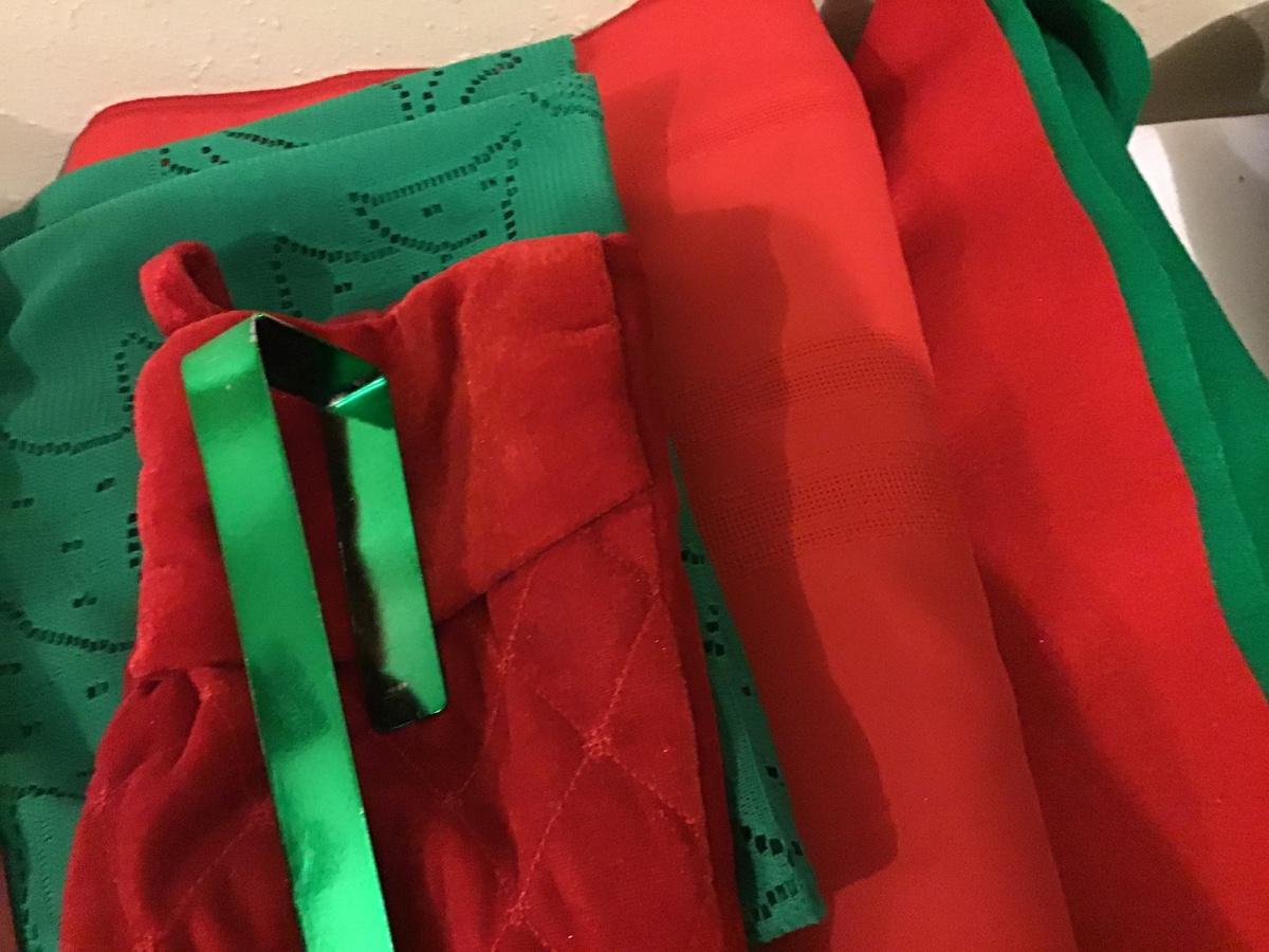 Red Rectangular tablecloth, Green round tablecloth, felt, towels, 2 wreath hangers