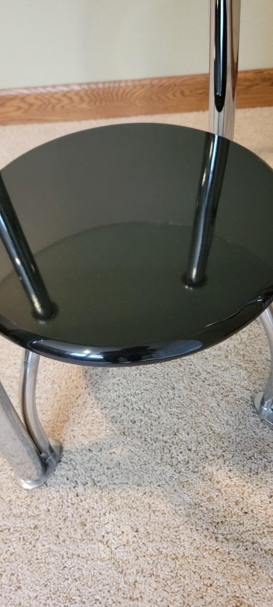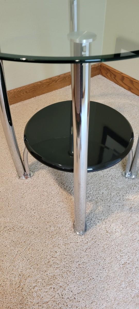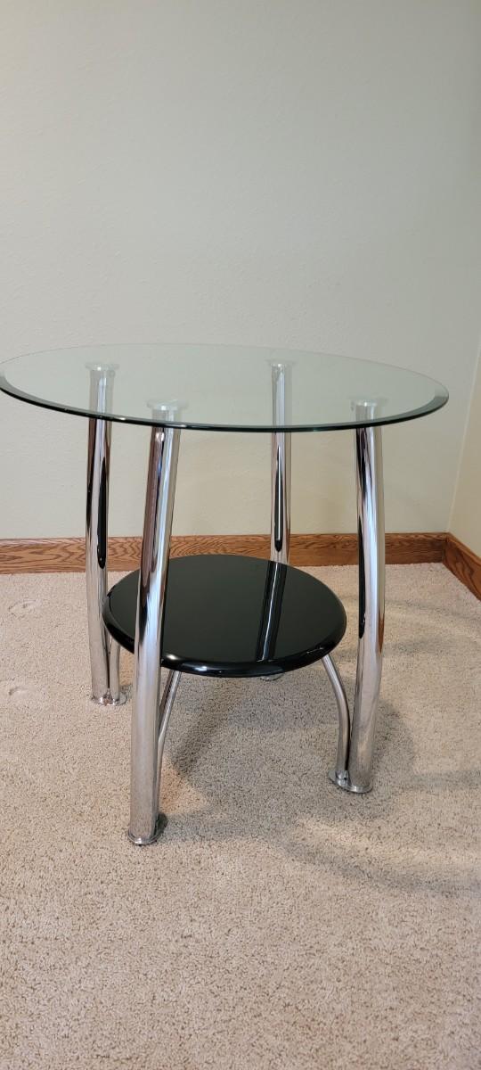 BB-41 Modern style cool beveled glass top occesional table. 26" beveled glass round, 25" H, lacquer round.