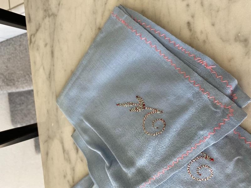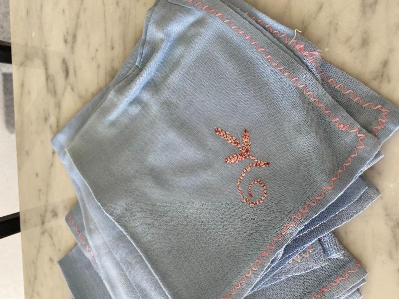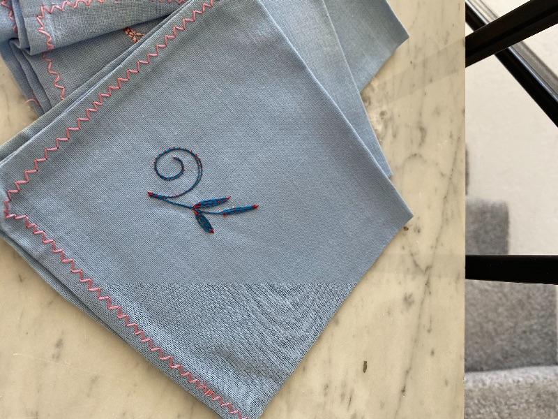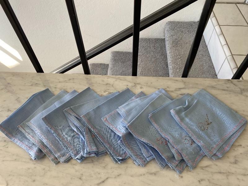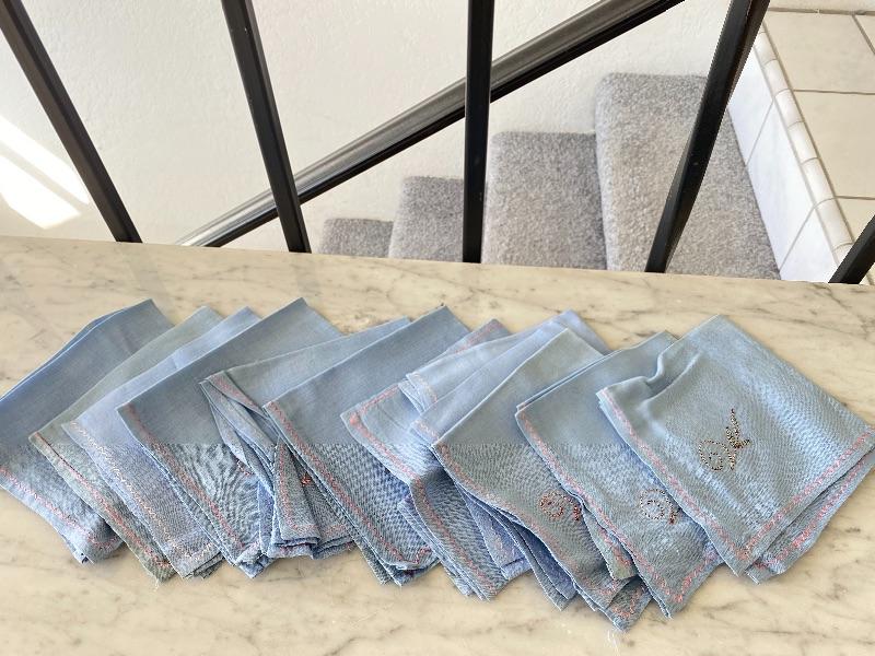 Set of vintage embroidered cloth napkins. Light blue color. dainty stitched design. Smaller then normal cloth napkins, more for tea or dessert probably. May have discolor from age.