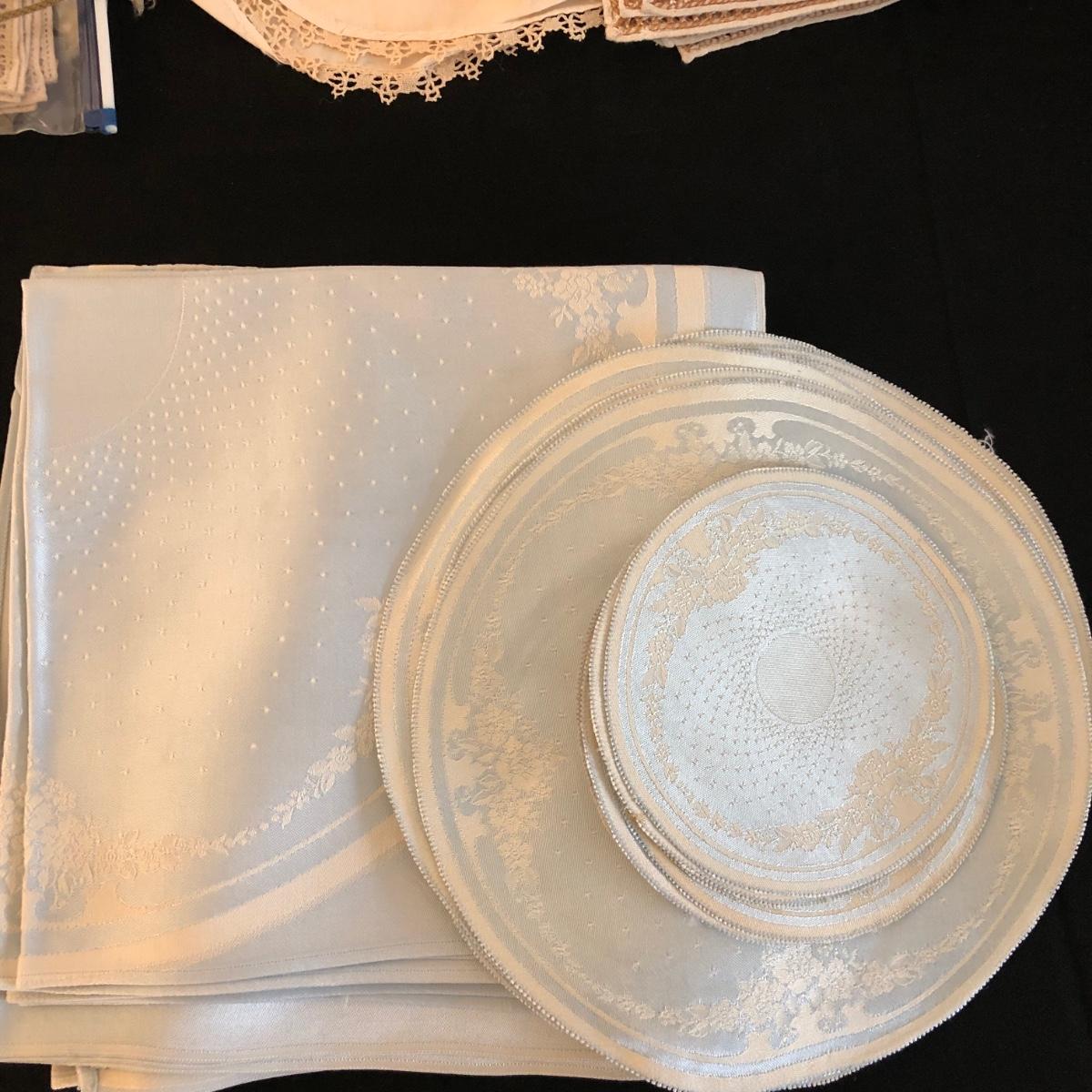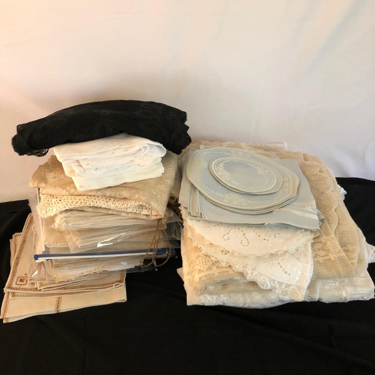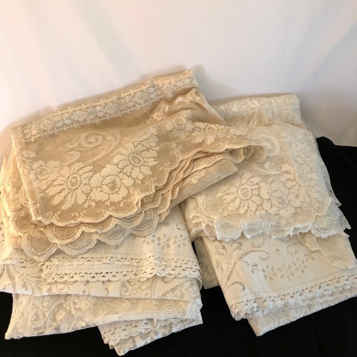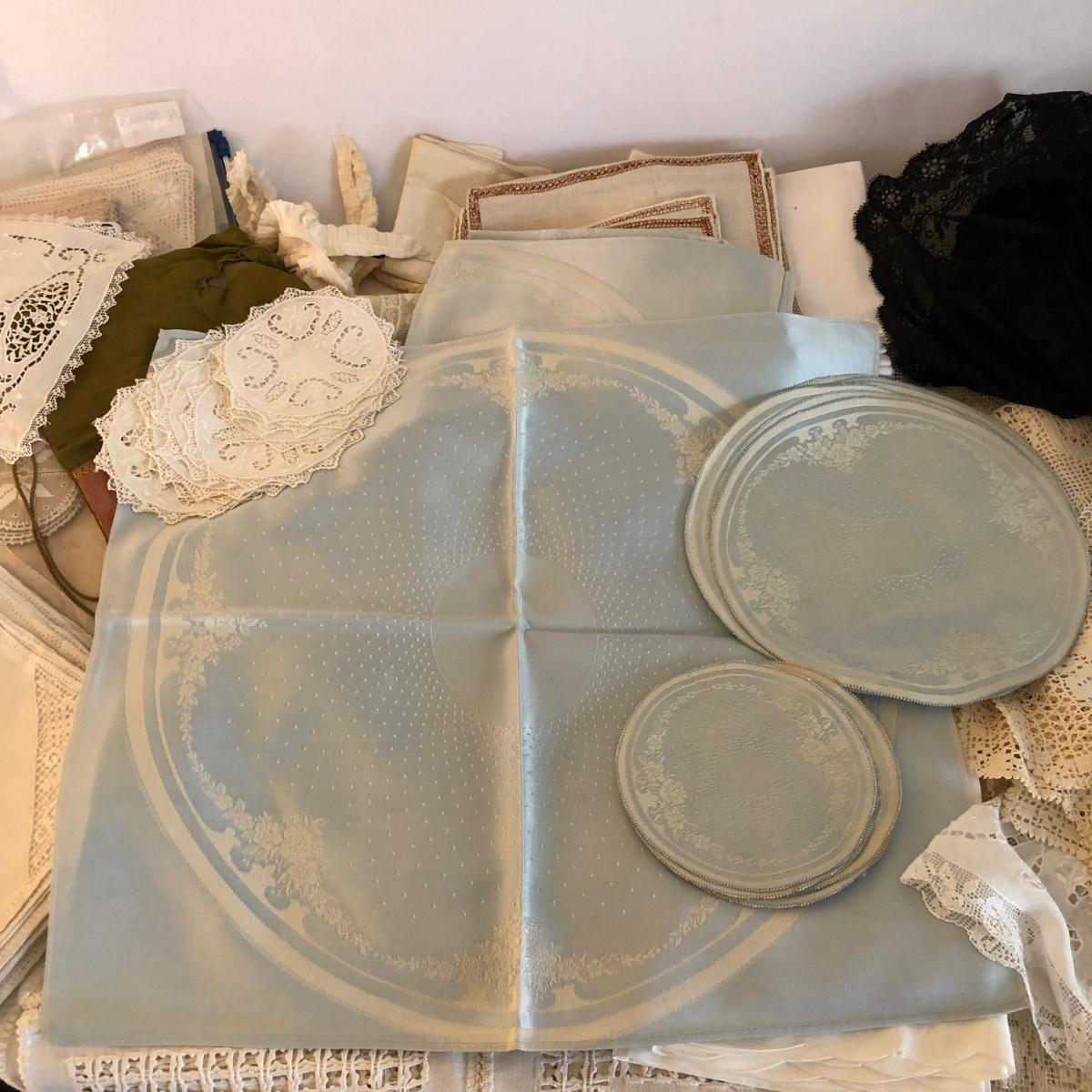 This collection includes over 125 vintage table settings with lace tablecloths, napkins, doilies, table runners, and more. There are 4 tablecloths. Some of the lace is handmade and some is machine made. In the blue damask pattern, there are 8 small circles, 8 large circles, and 7 rectangles. The small circles measure 6” in diameter and the rectangles are 21” x 19.5”. Vintage fabric like this does naturally carry a vintage smell. Shipping available.