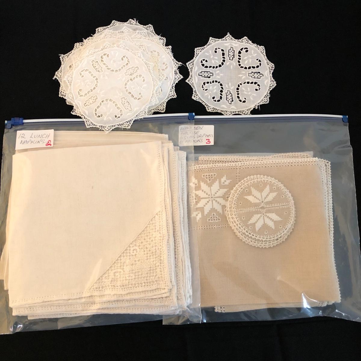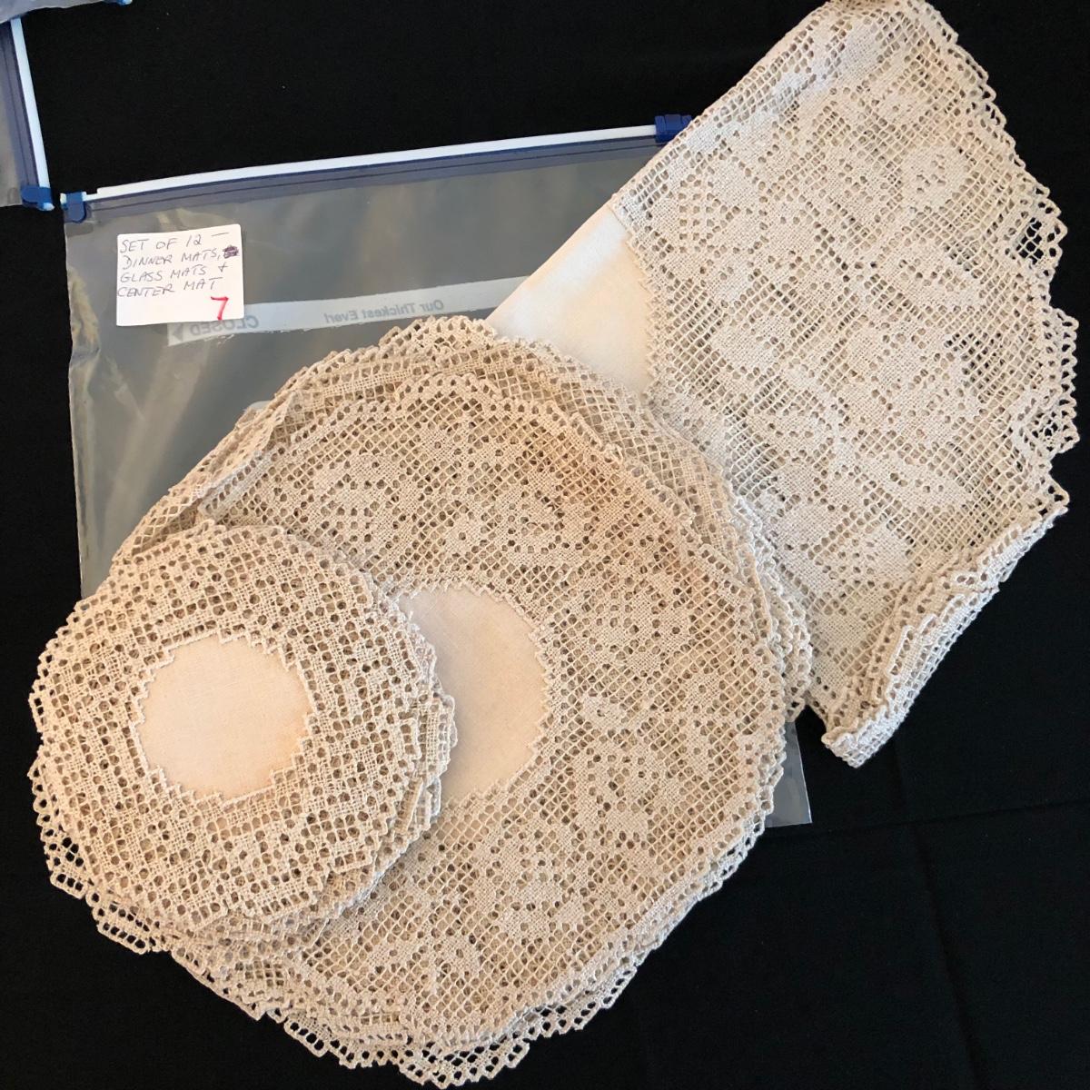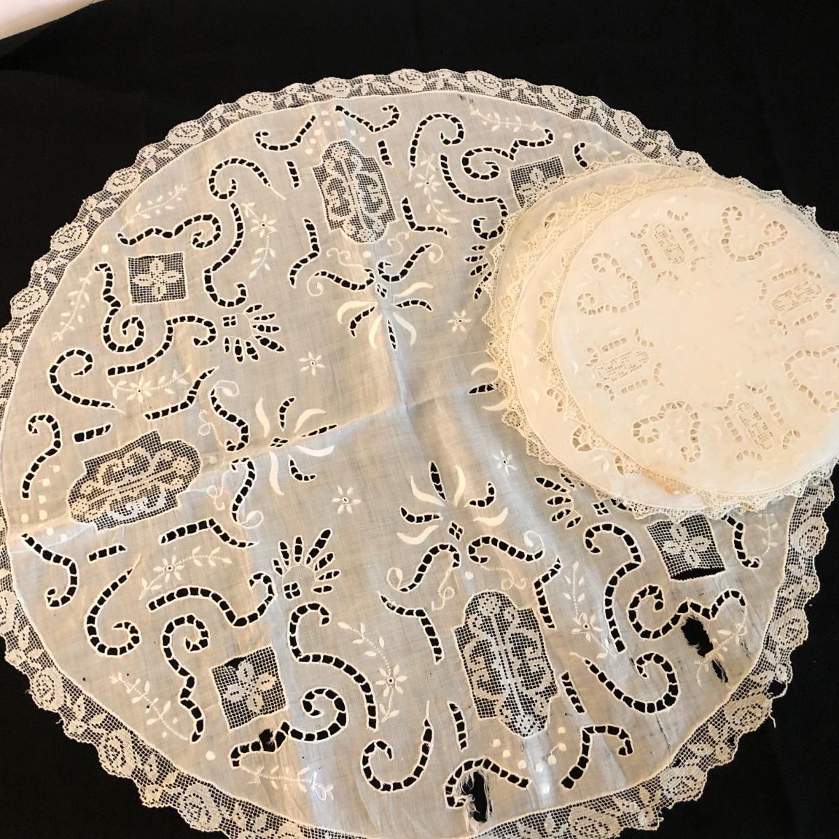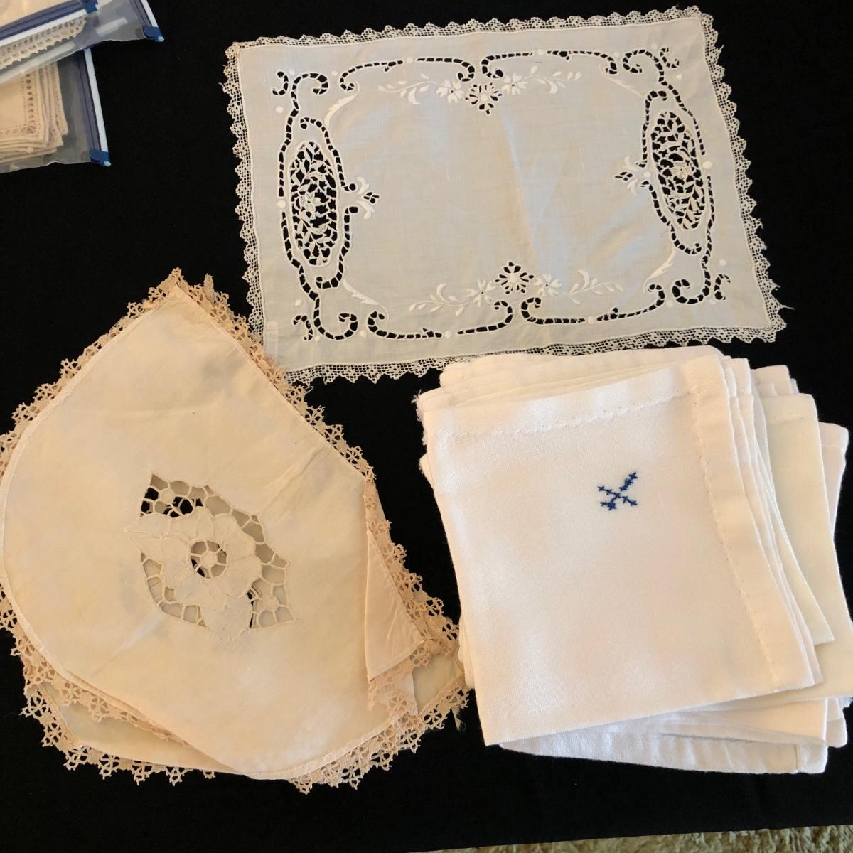 This collection includes over 125 vintage table settings with lace tablecloths, napkins, doilies, table runners, and more. There are 4 tablecloths. Some of the lace is handmade and some is machine made. In the blue damask pattern, there are 8 small circles, 8 large circles, and 7 rectangles. The small circles measure 6” in diameter and the rectangles are 21” x 19.5”. Vintage fabric like this does naturally carry a vintage smell. Shipping available.