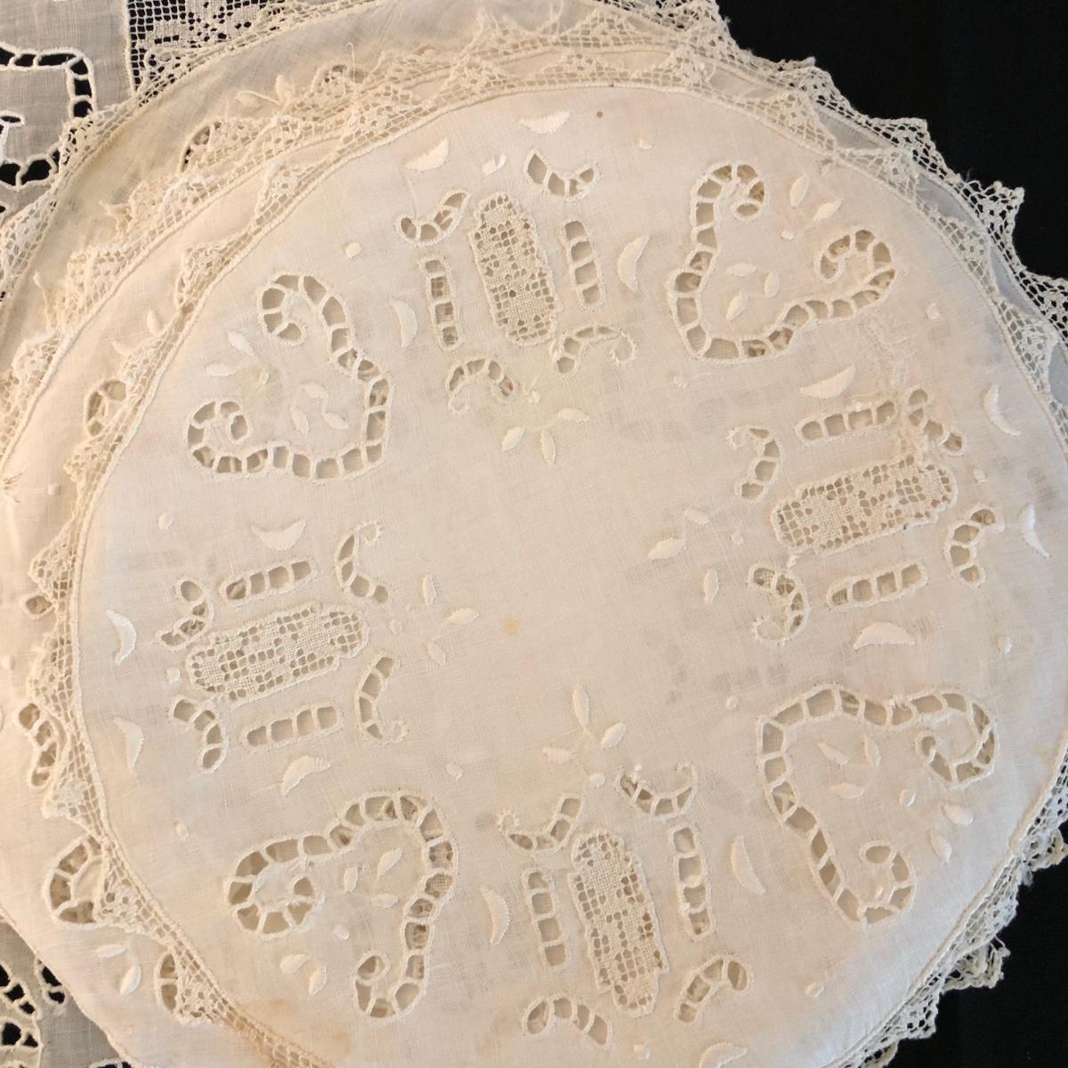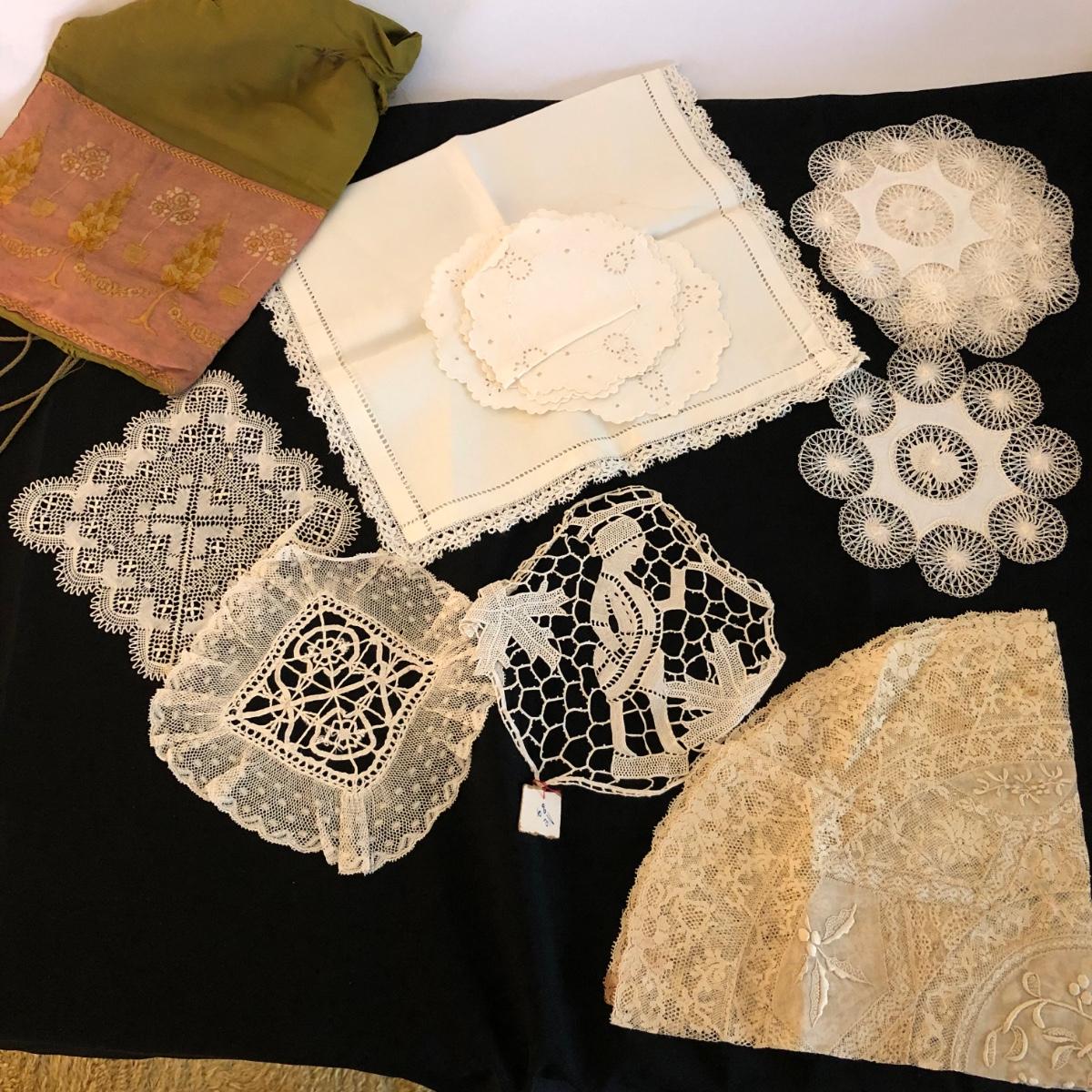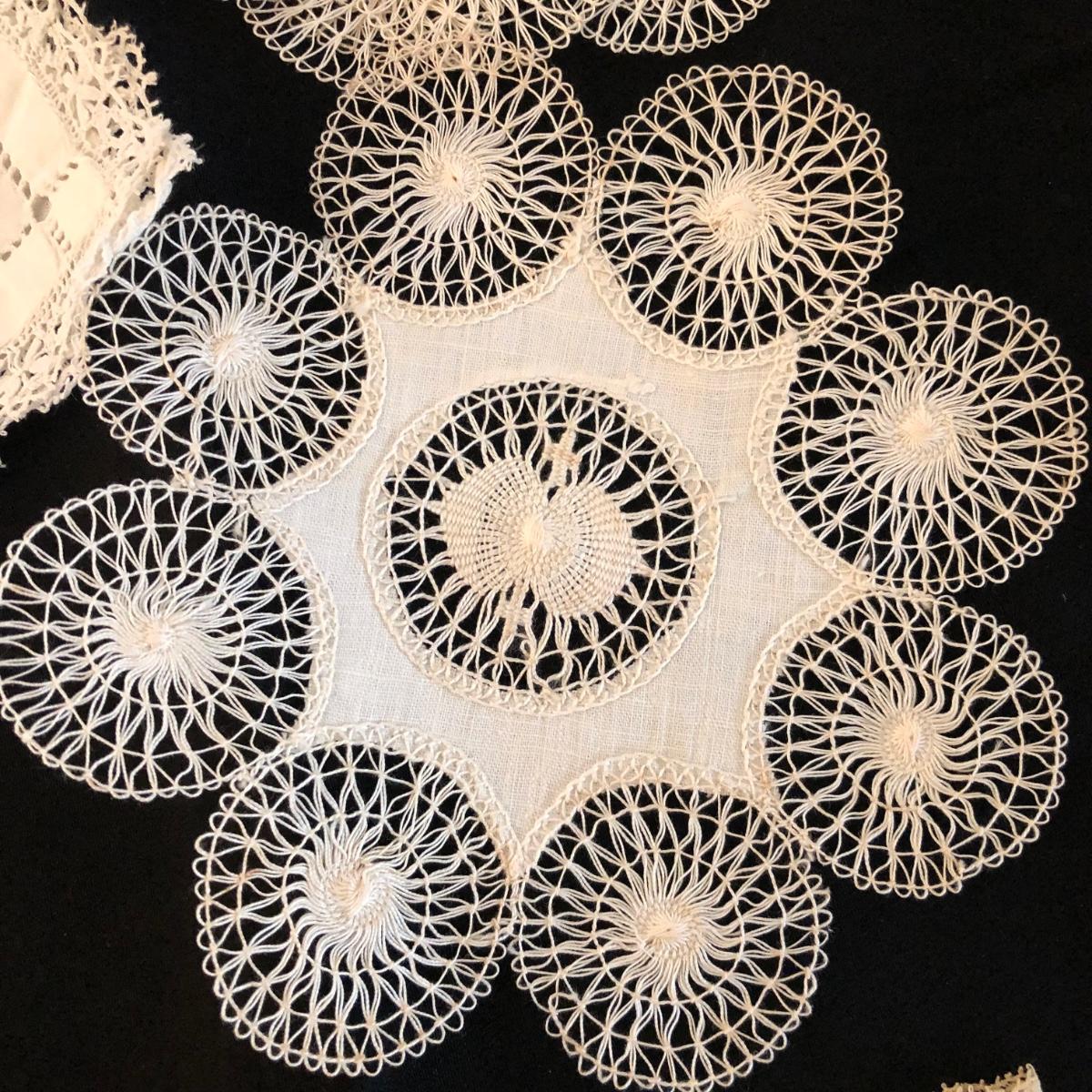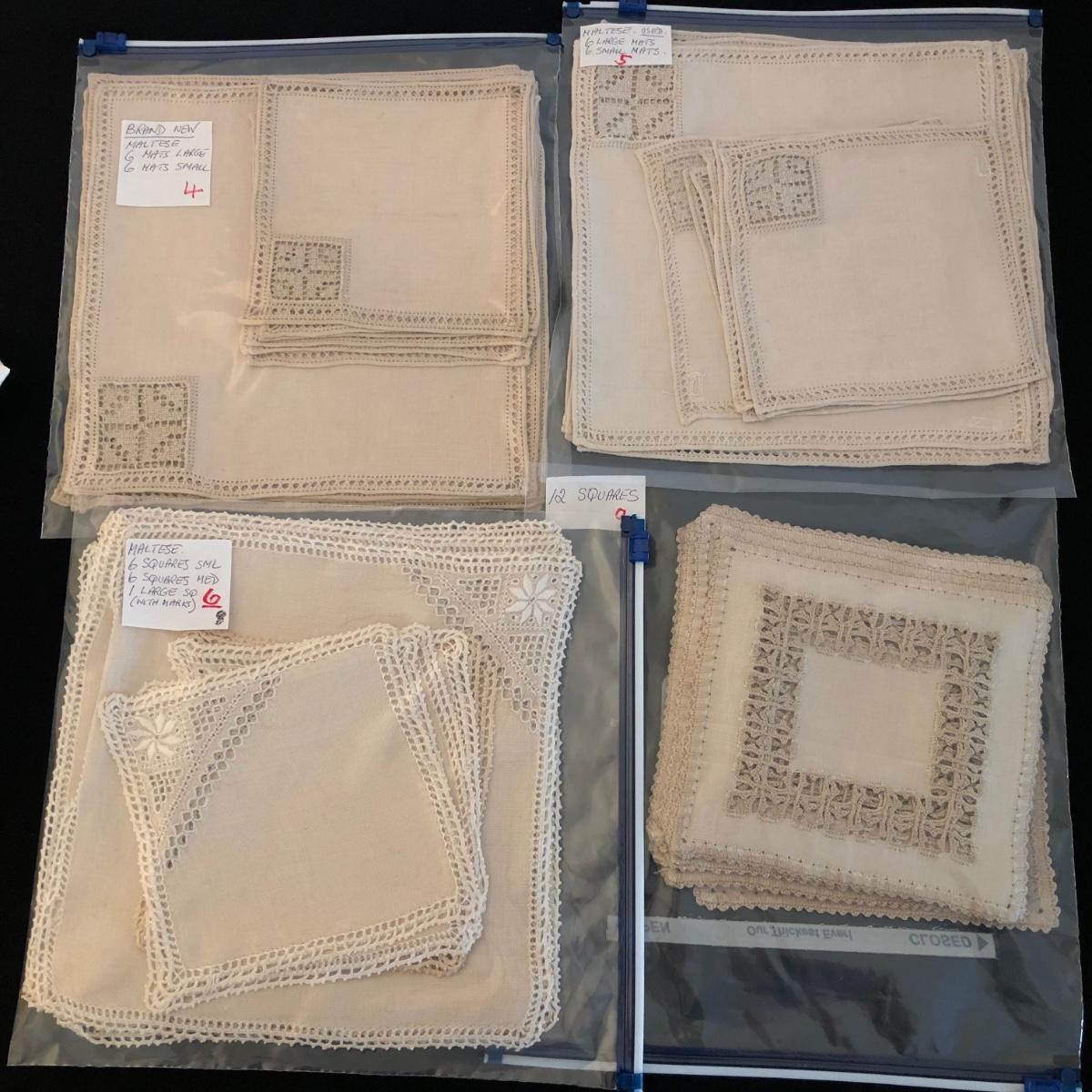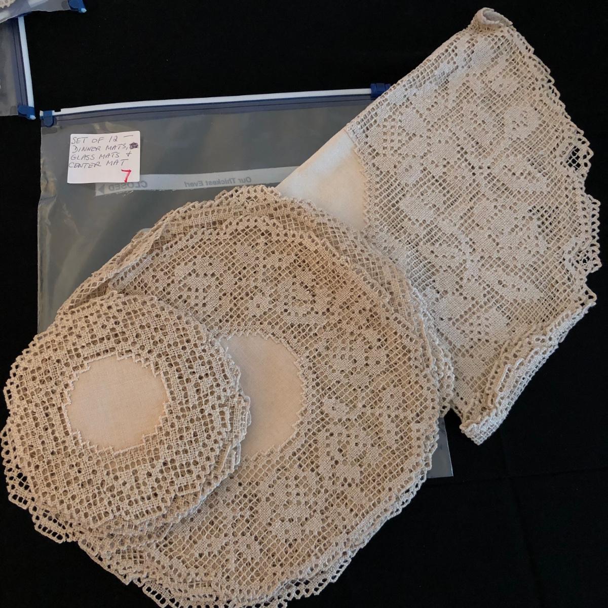 This collection includes over 125 vintage table settings with lace tablecloths, napkins, doilies, table runners, and more. There are 4 tablecloths. Some of the lace is handmade and some is machine made. In the blue damask pattern, there are 8 small circles, 8 large circles, and 7 rectangles. The small circles measure 6” in diameter and the rectangles are 21” x 19.5”. Vintage fabric like this does naturally carry a vintage smell. Shipping available.