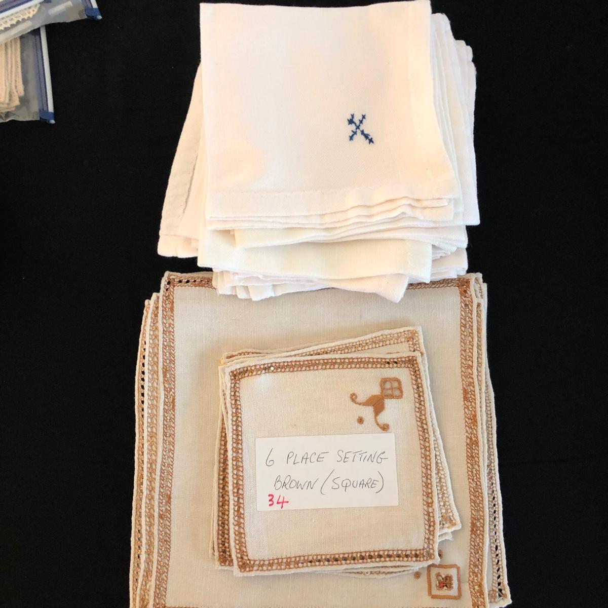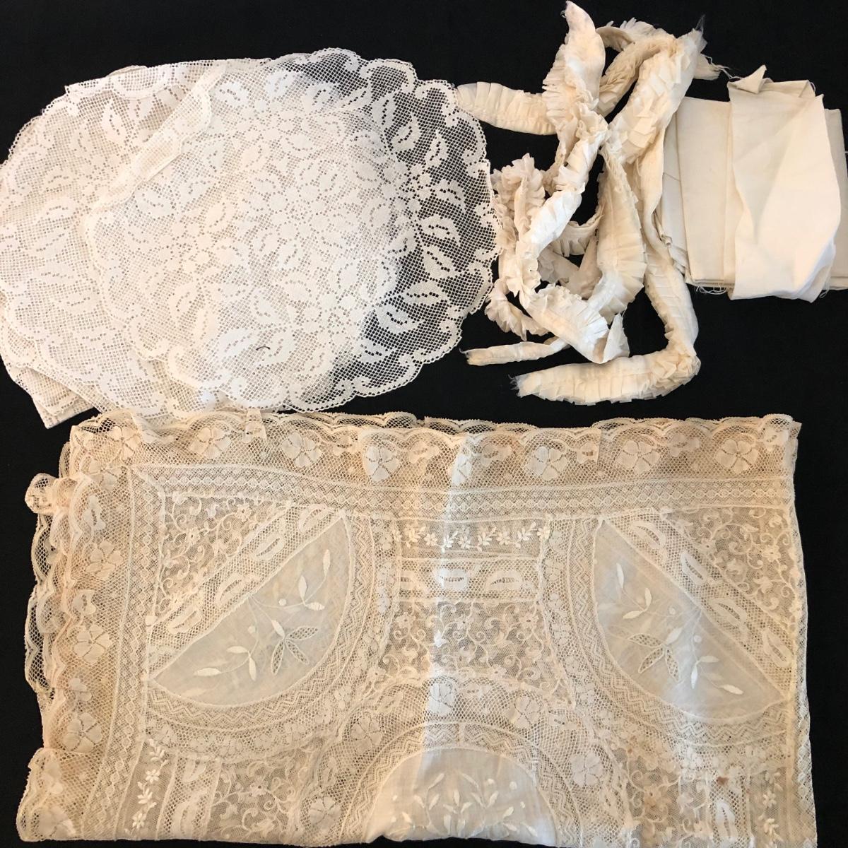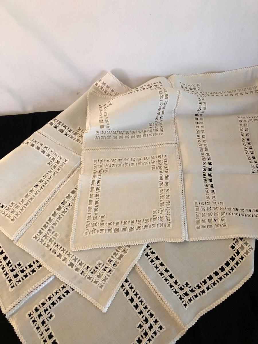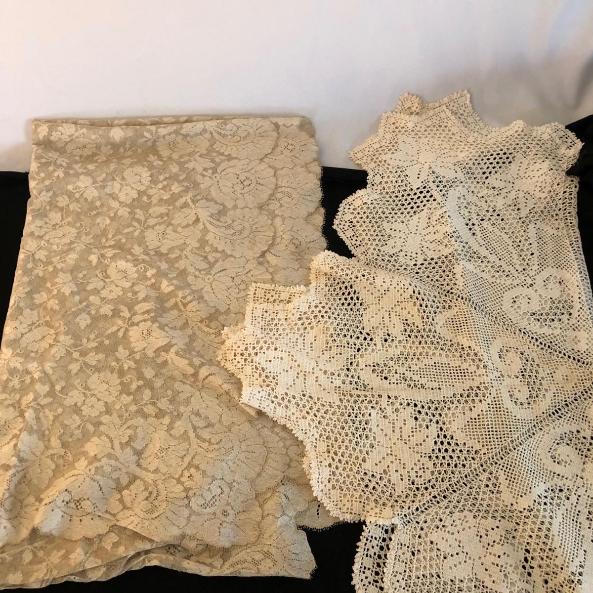 This collection includes over 125 vintage table settings with lace tablecloths, napkins, doilies, table runners, and more. There are 4 tablecloths. Some of the lace is handmade and some is machine made. In the blue damask pattern, there are 8 small circles, 8 large circles, and 7 rectangles. The small circles measure 6” in diameter and the rectangles are 21” x 19.5”. Vintage fabric like this does naturally carry a vintage smell. Shipping available.