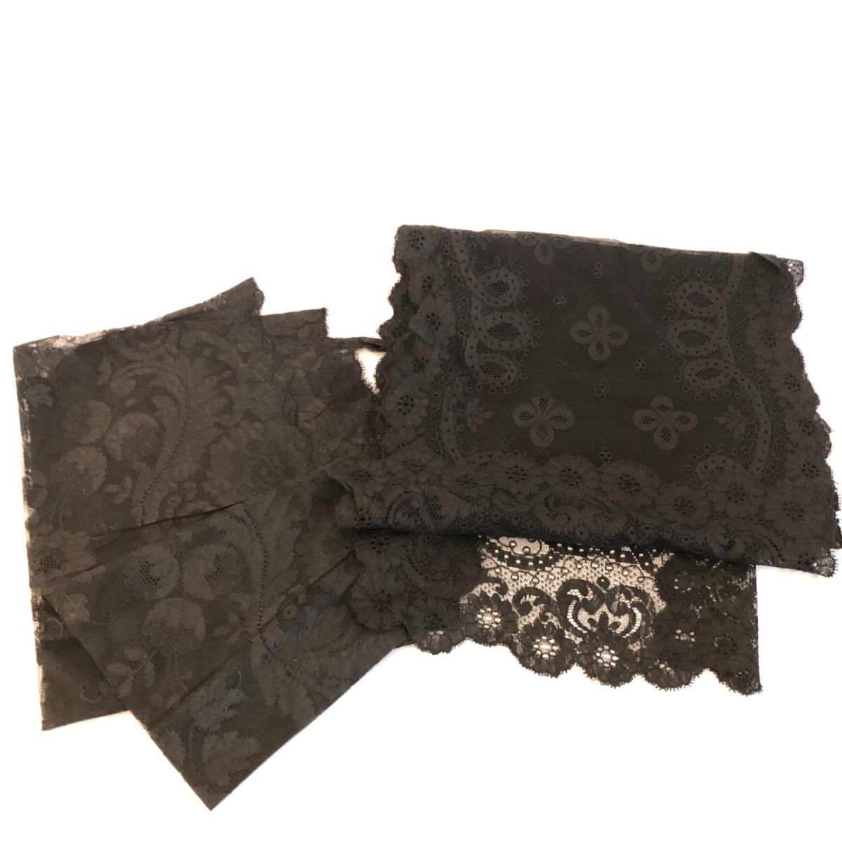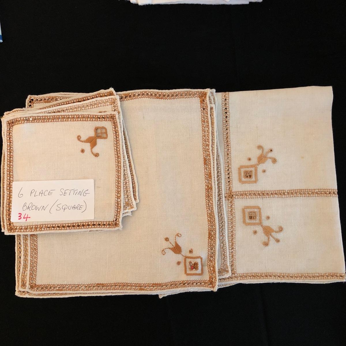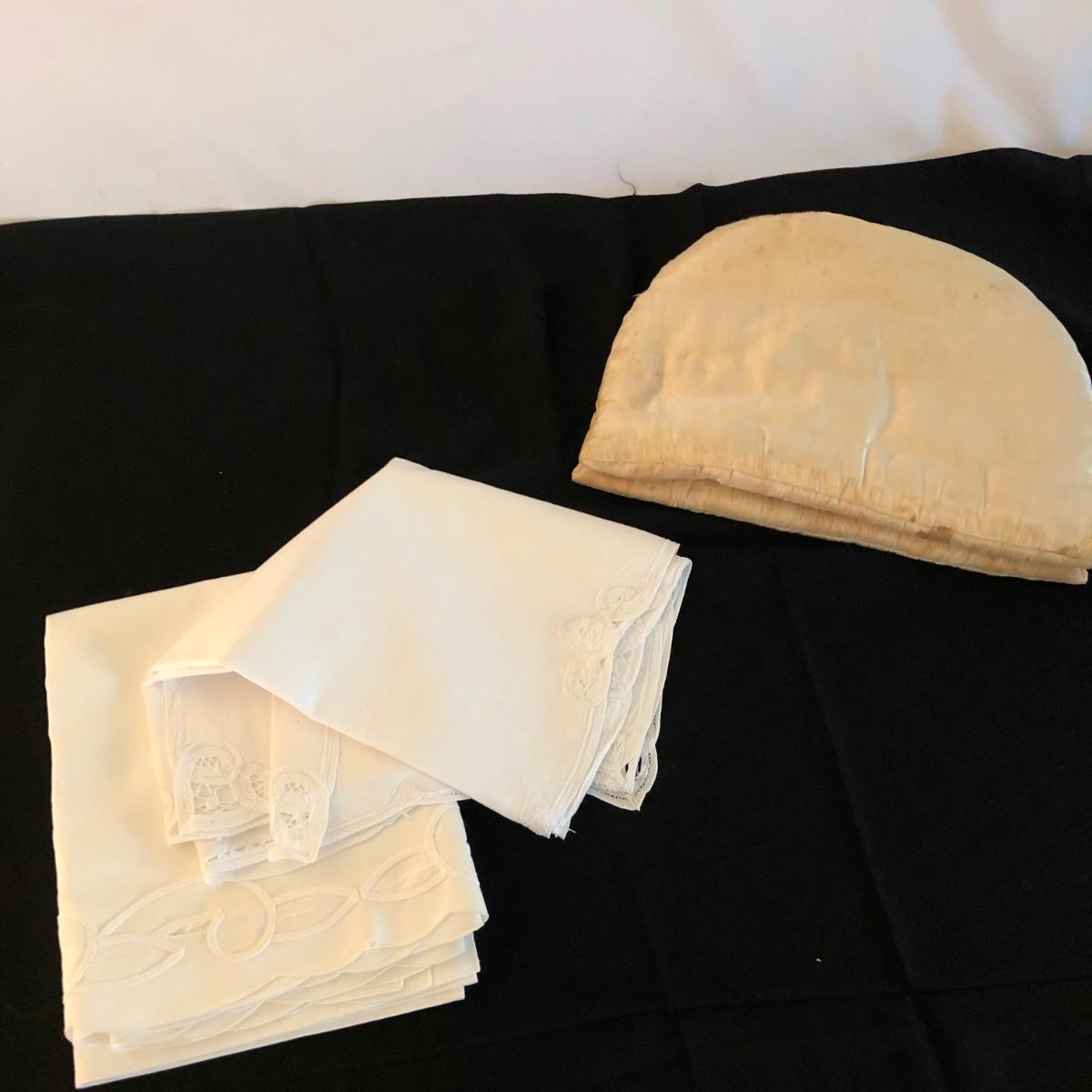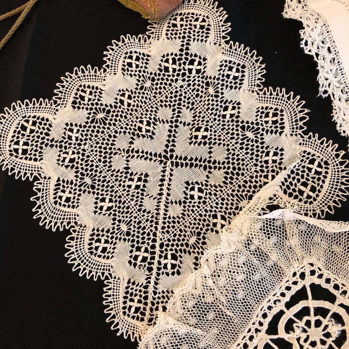 This collection includes over 125 vintage table settings with lace tablecloths, napkins, doilies, table runners, and more. There are 4 tablecloths. Some of the lace is handmade and some is machine made. In the blue damask pattern, there are 8 small circles, 8 large circles, and 7 rectangles. The small circles measure 6” in diameter and the rectangles are 21” x 19.5”. Vintage fabric like this does naturally carry a vintage smell. Shipping available.