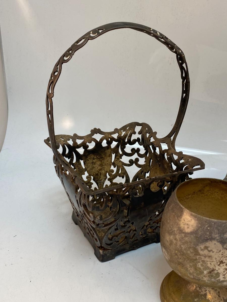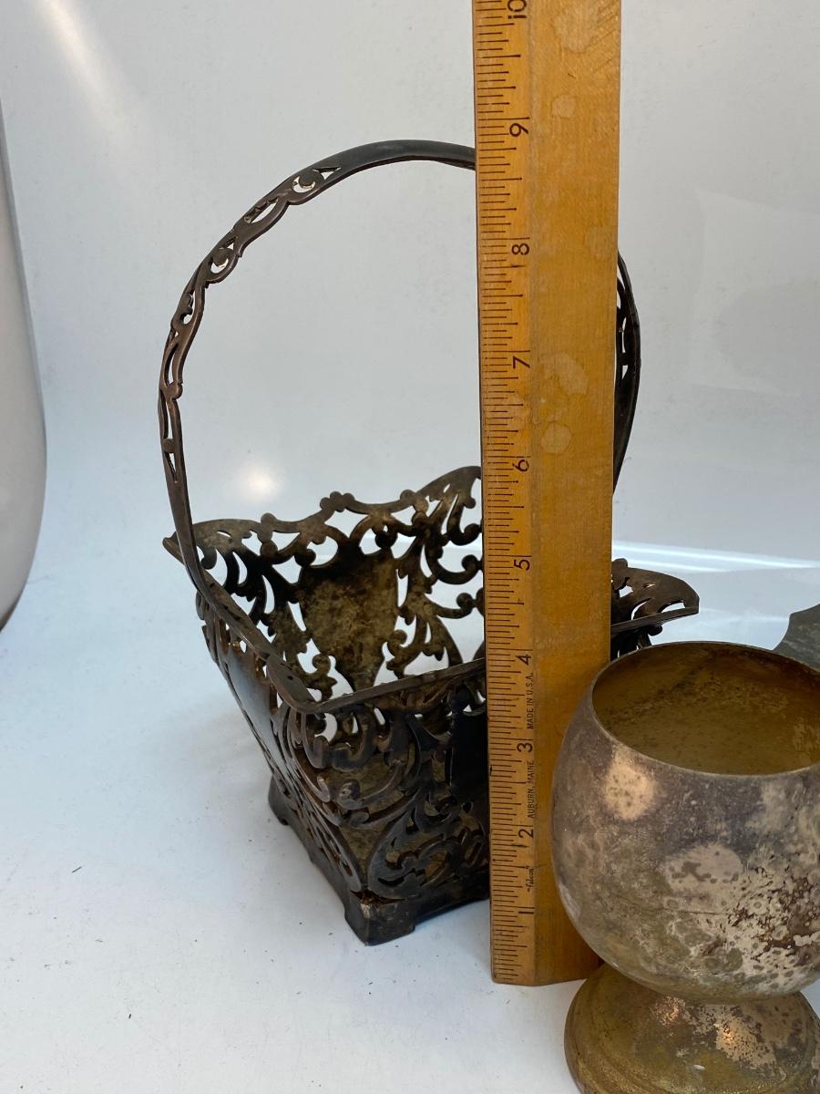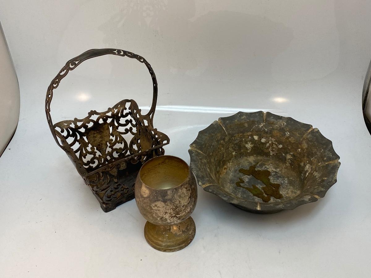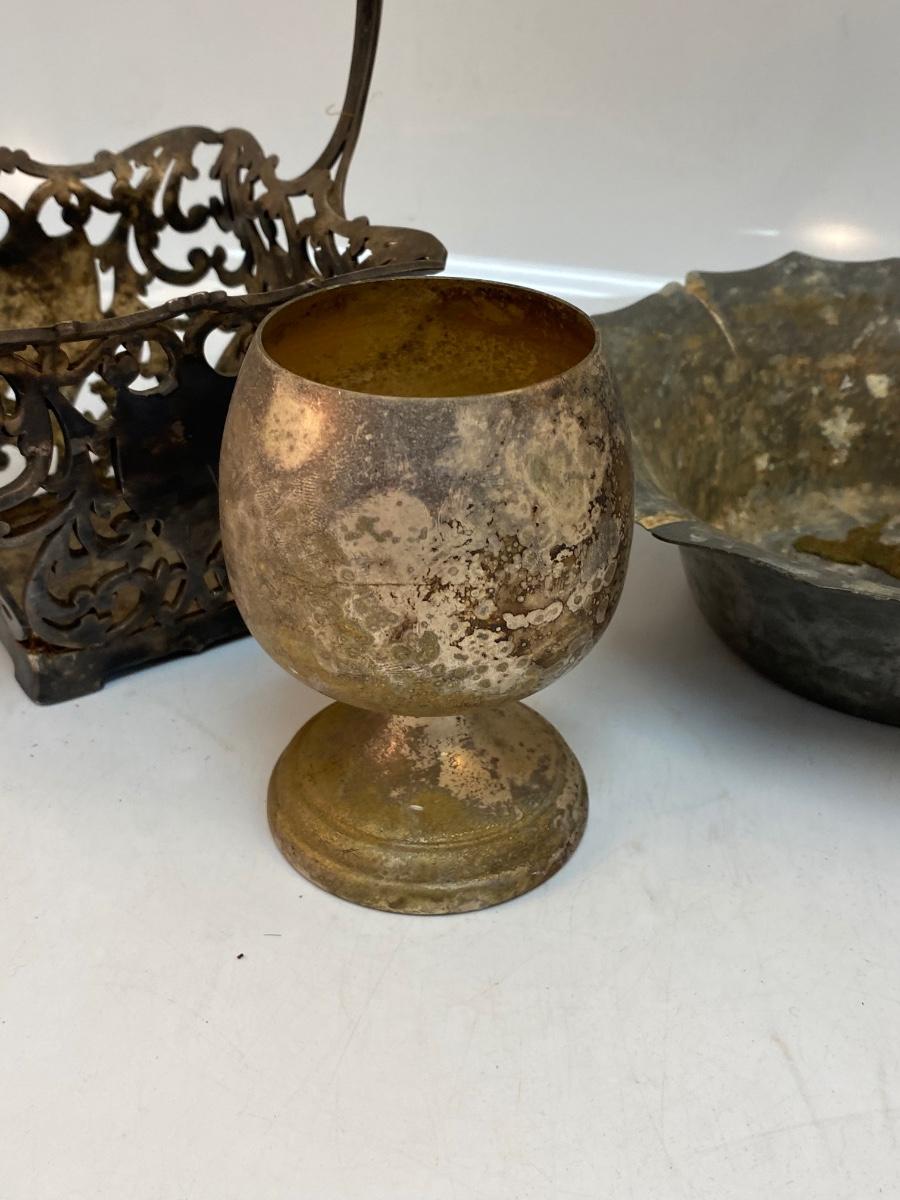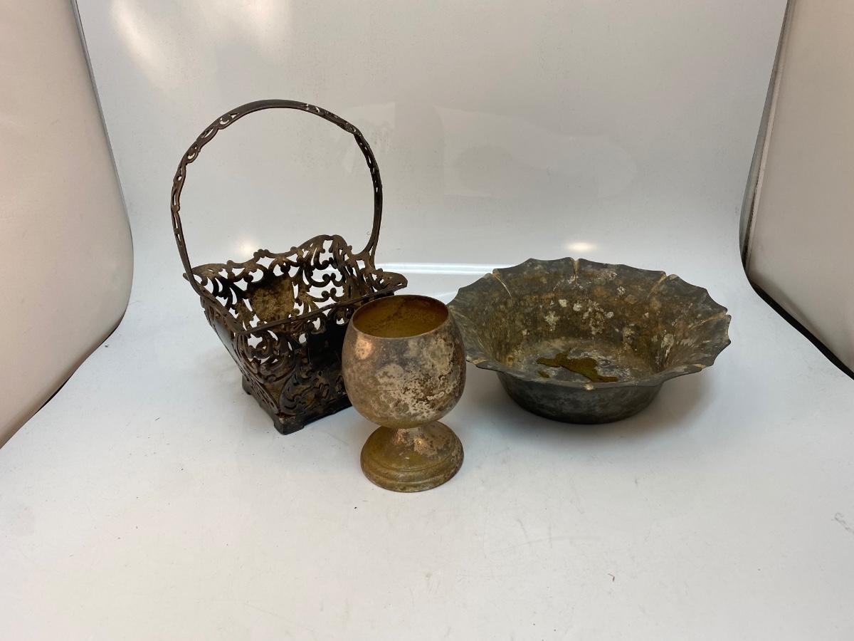 Lot of Weather Metal Decor Basket Bowl Small Goblet. Weathered silver plate and metal pieces, may polish up, not sure.