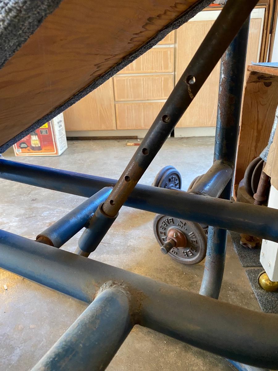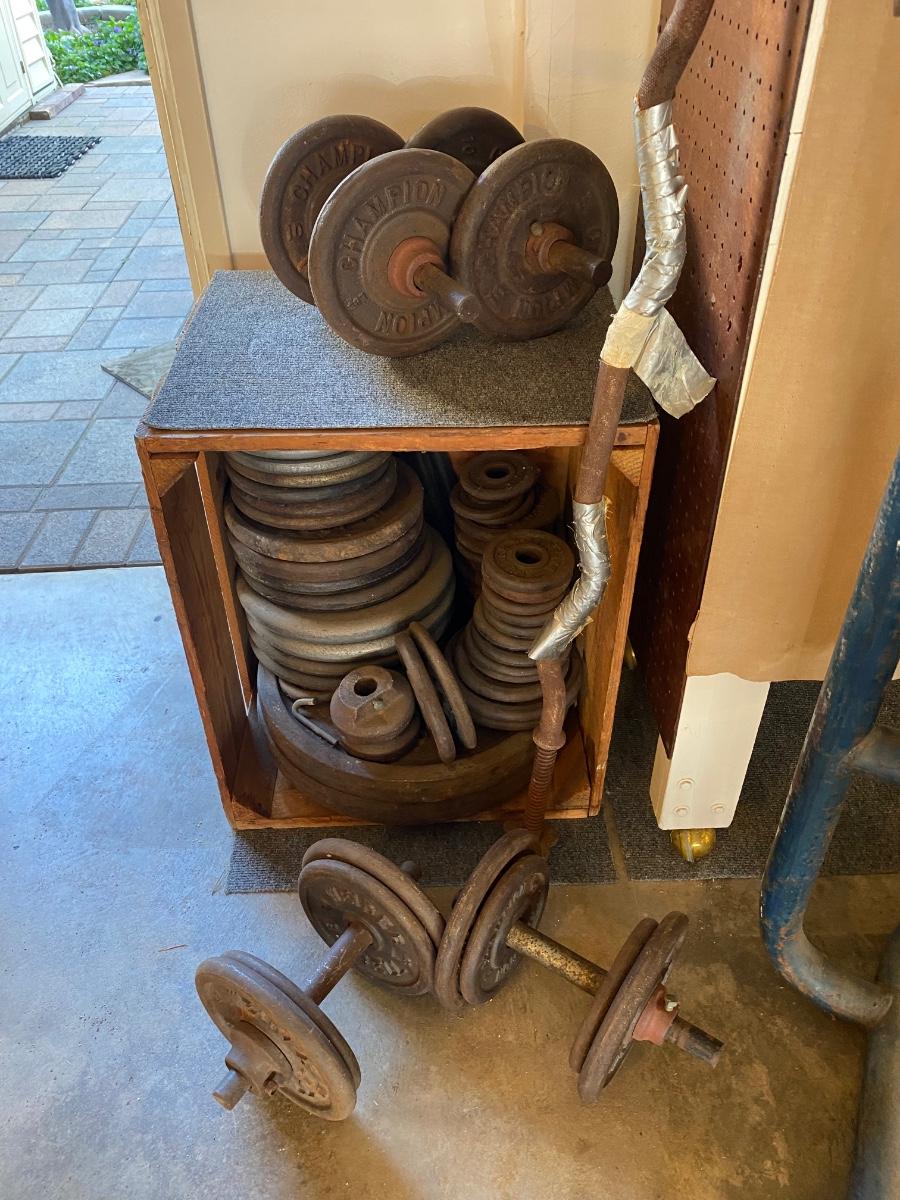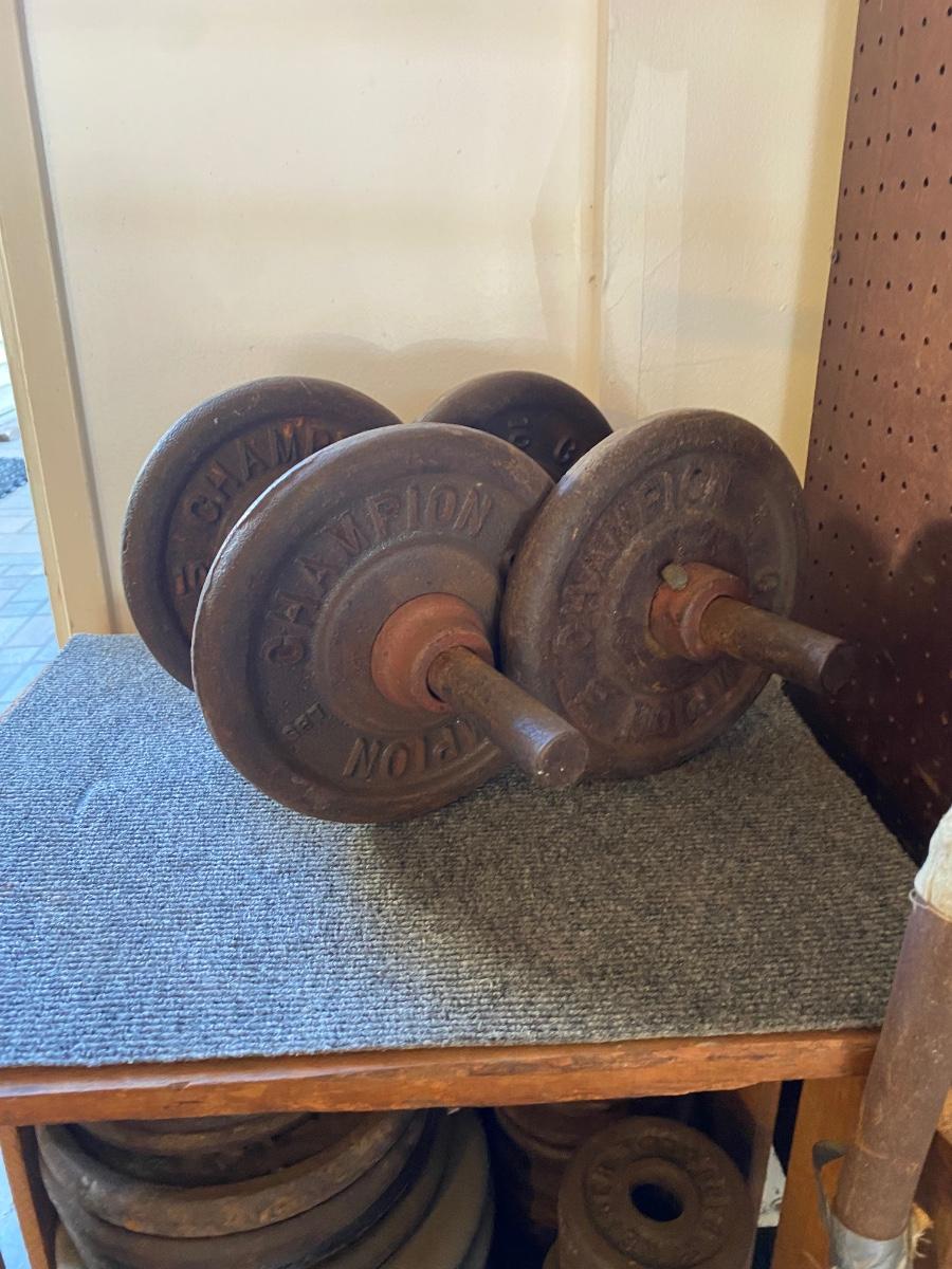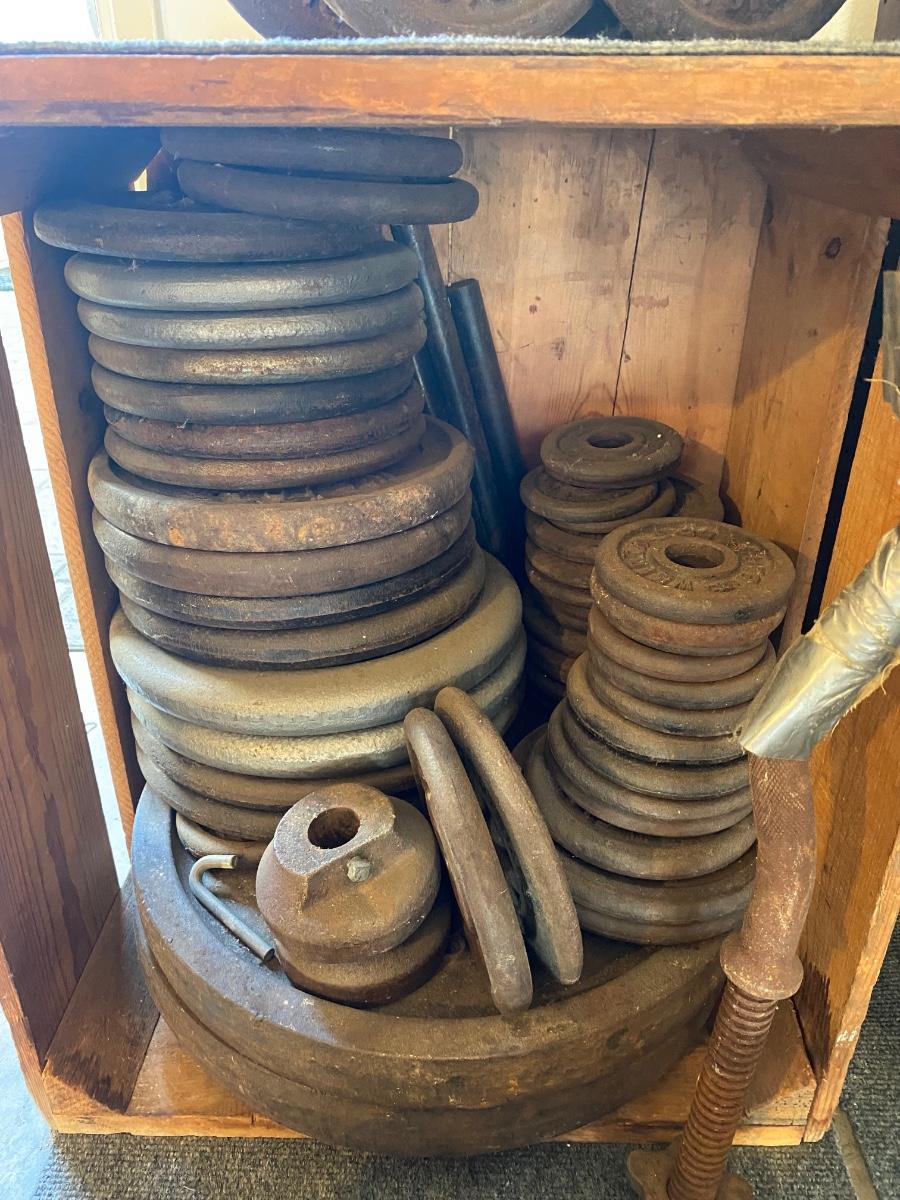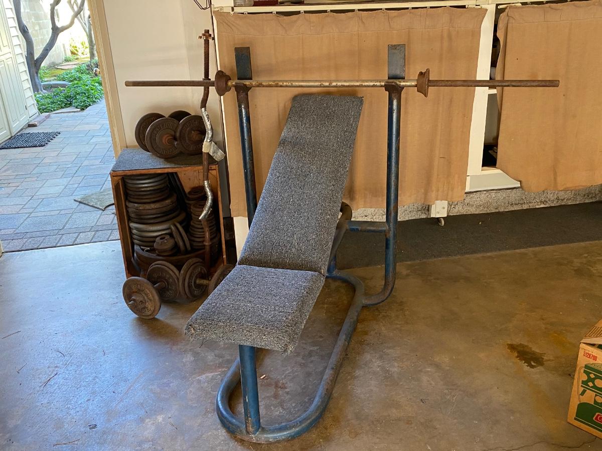 Vintage Adjustable Weight Bench with Multiple Bars Dumbbells Weight Plates