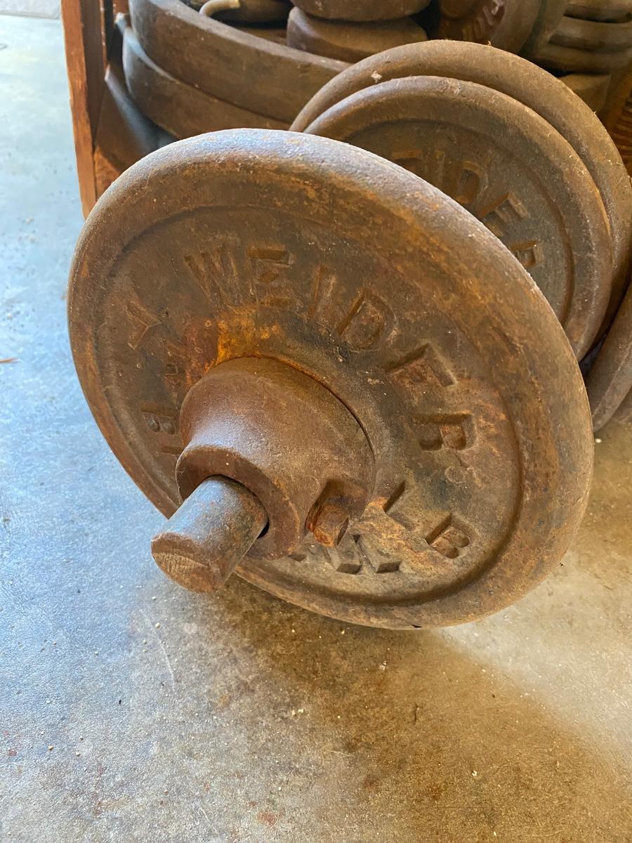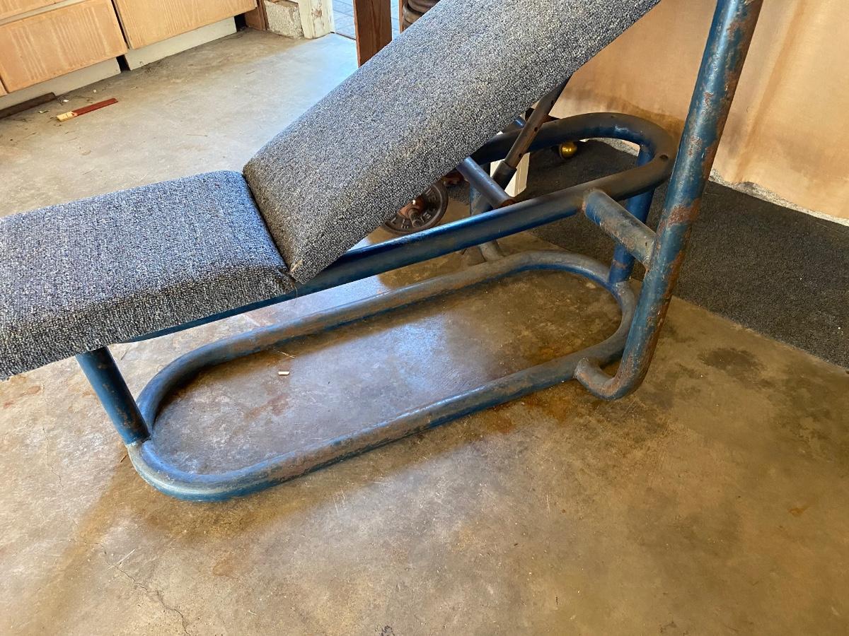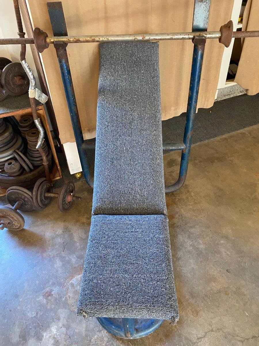 Vintage Adjustable Weight Bench with Multiple Bars Dumbbells Weight Plates. In good vintage condition. Heavy duty bench can incline at different levels with pin/bolt to hold in place. Bench has been covered with industrial carpet that is in good vintage condition. Straight bar, angled bar, two dumbbell bar sets and a lot of weights. See photos. Looks like there might be a couple 35 or 45lb on the bottom then gradually smaller. Not sure if all weights are from Weider or mixed brand, all are metal.