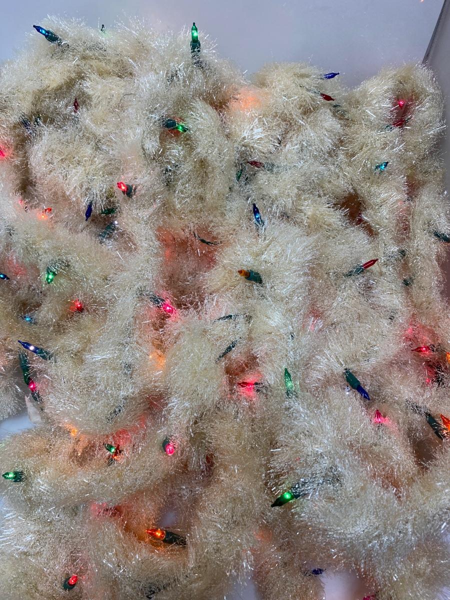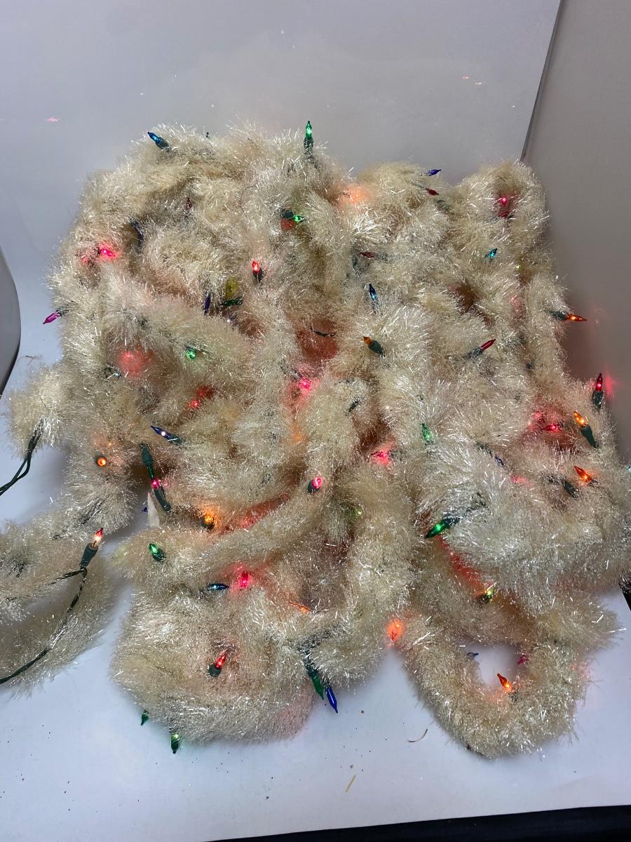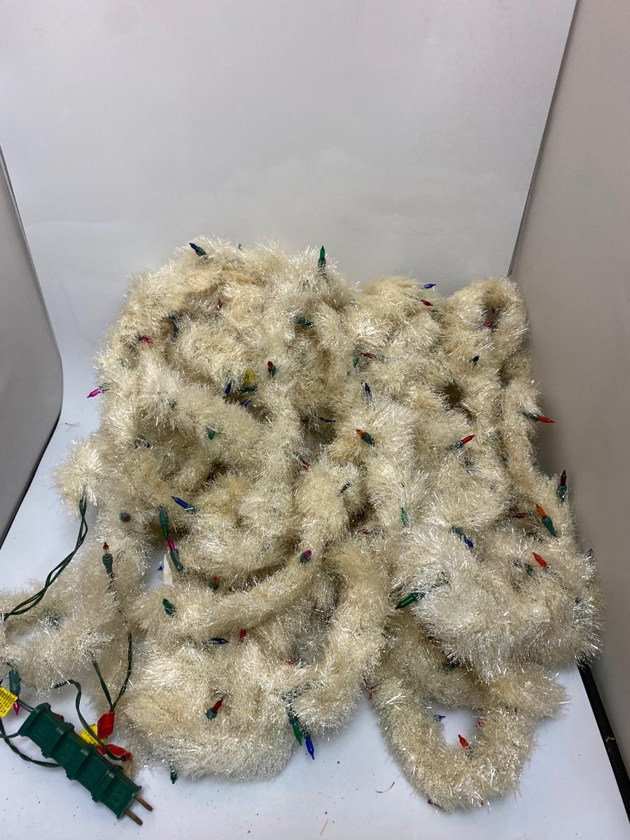 Vintage White Metallic Lighted Christmas Tree Holiday Garland. Multiple light strands. Most lights working.