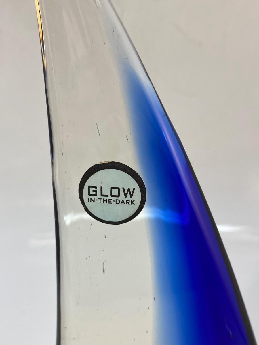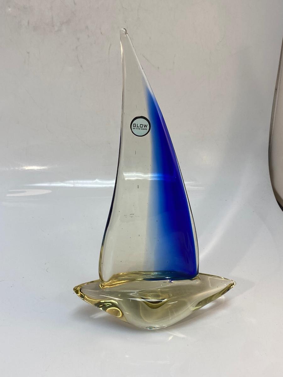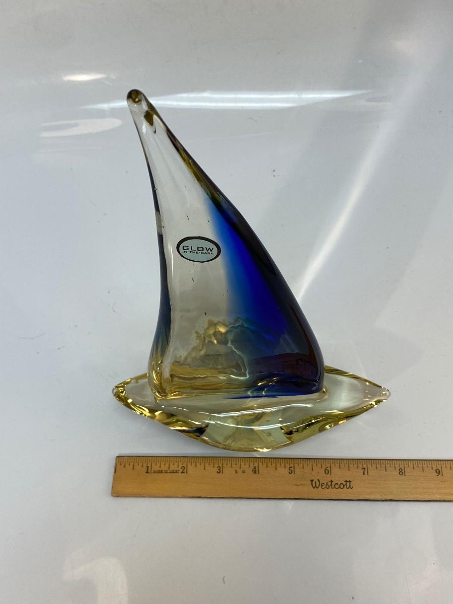 Retro Blown Art Glass Sailboat Ship Statue Figurine. In good condition. There is some bubbles in the glass but no chips. The sticker on mast says glow in the dark but we couldn't manage to get it glowing. About 13" size.