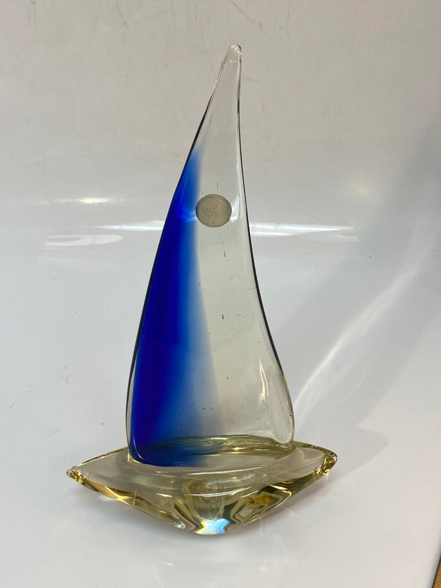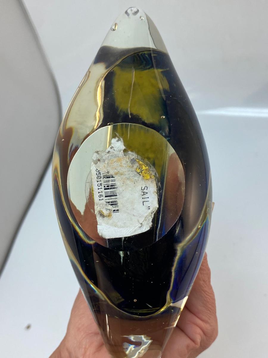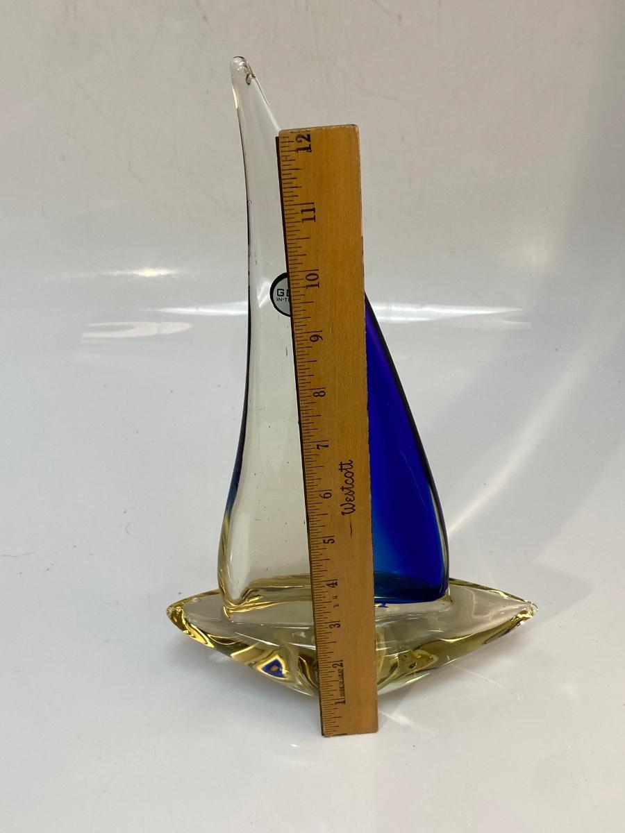 Retro Blown Art Glass Sailboat Ship Statue Figurine. In good condition. There is some bubbles in the glass but no chips. The sticker on mast says glow in the dark but we couldn't manage to get it glowing. About 13" size.