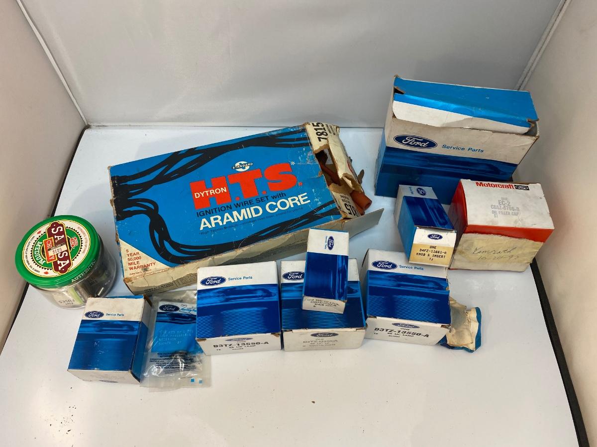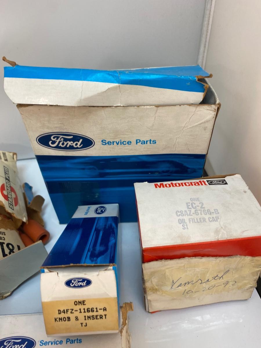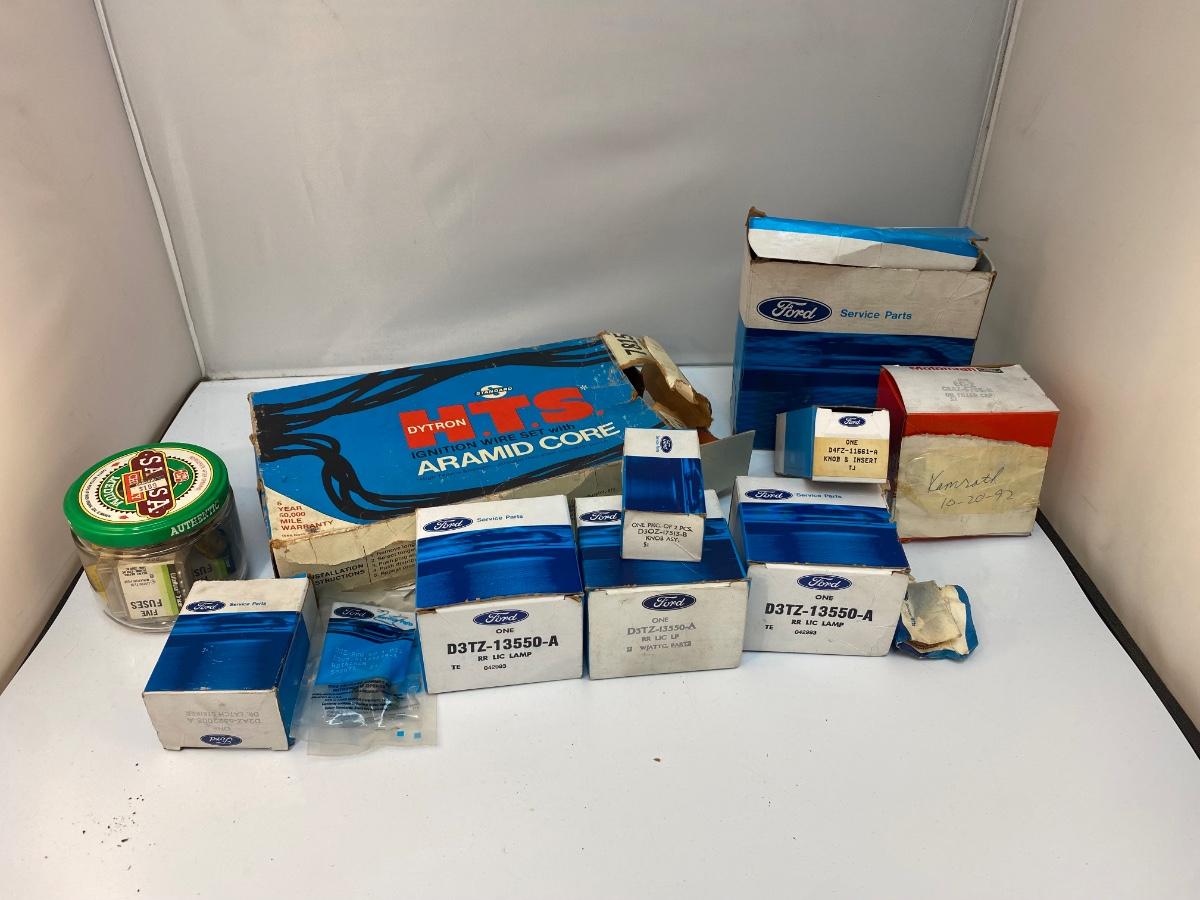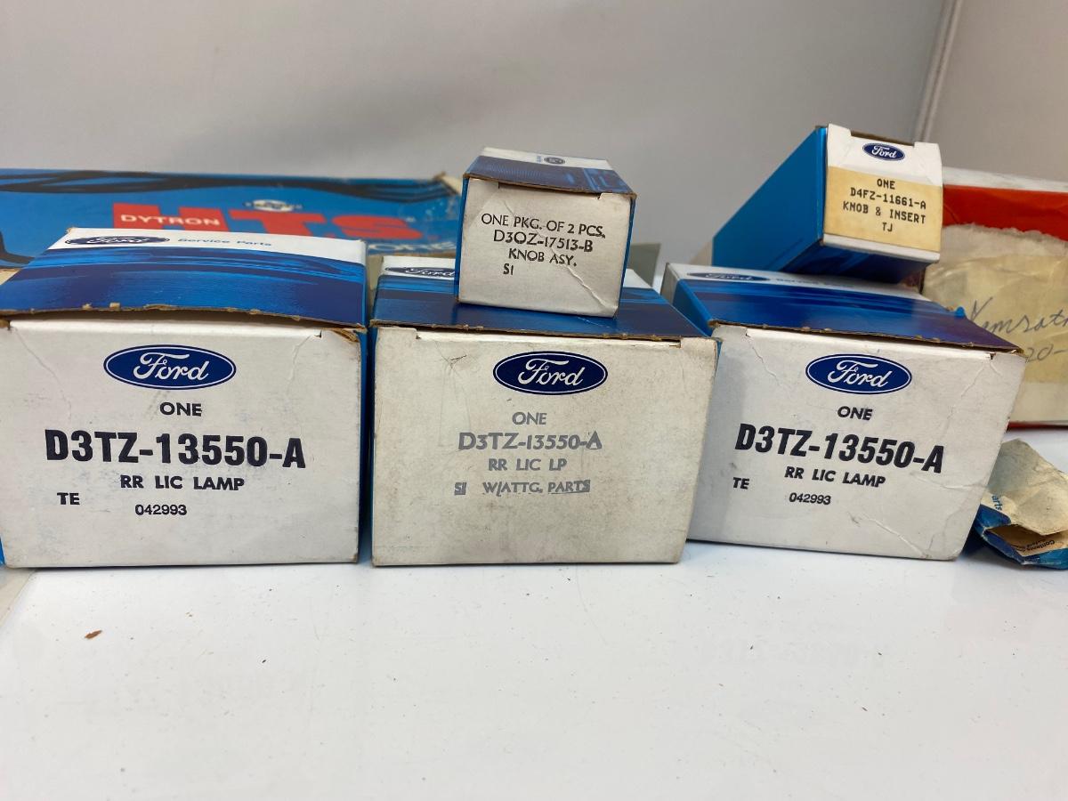 Mixed Lot of Vintage Ford Car Parts. Various parts, look unused. Part numbers come up as parts for late 1970s Broncos, F100, and F250 compatible. Headlight knobs, license plate lights, door latch all fit those years.