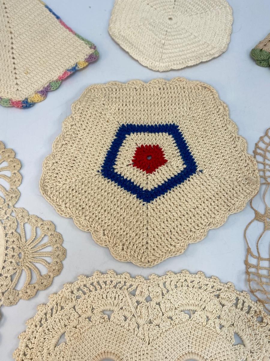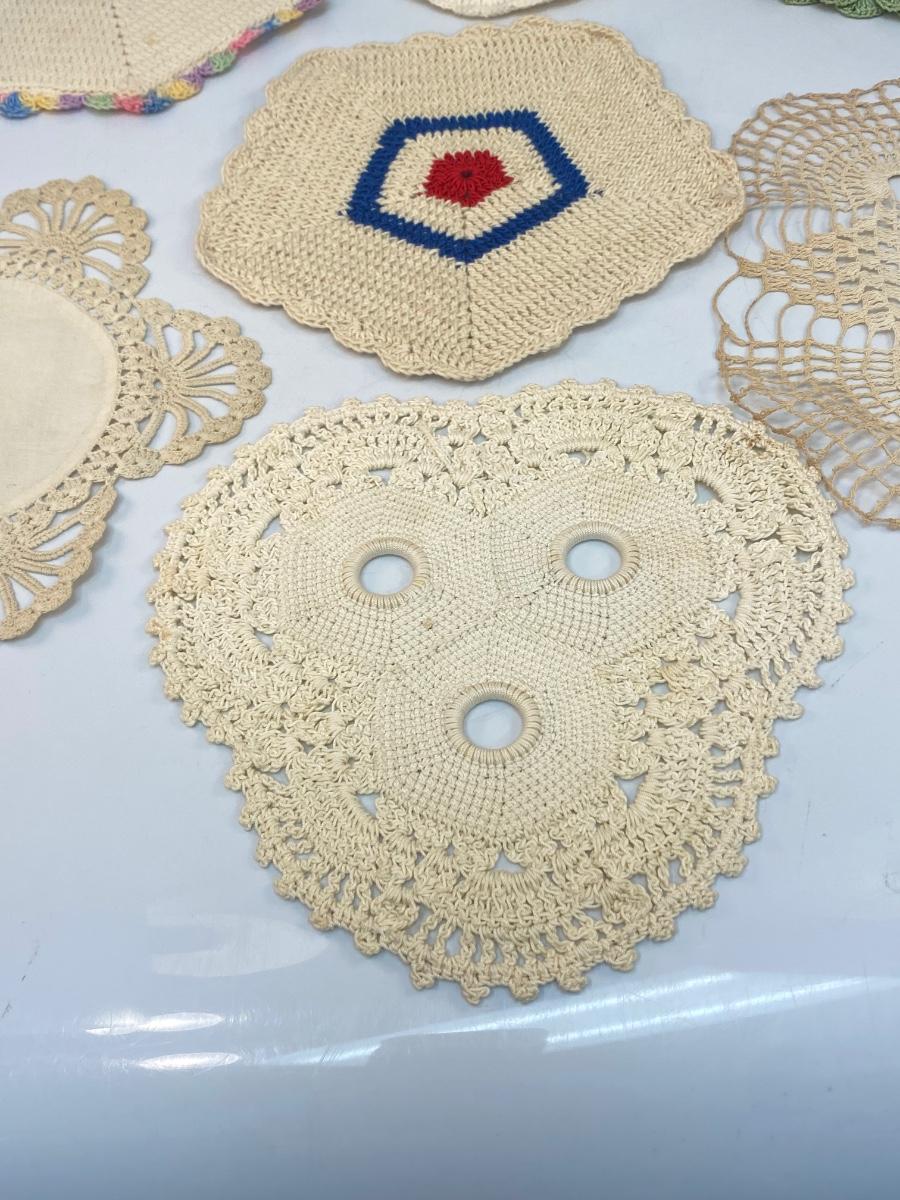 Lot of 7 Handmade Crochet Knit Tatted Doilies Coasters Table Protectors. Nicely made. Some discoloration from age and use but no major spots and stains.