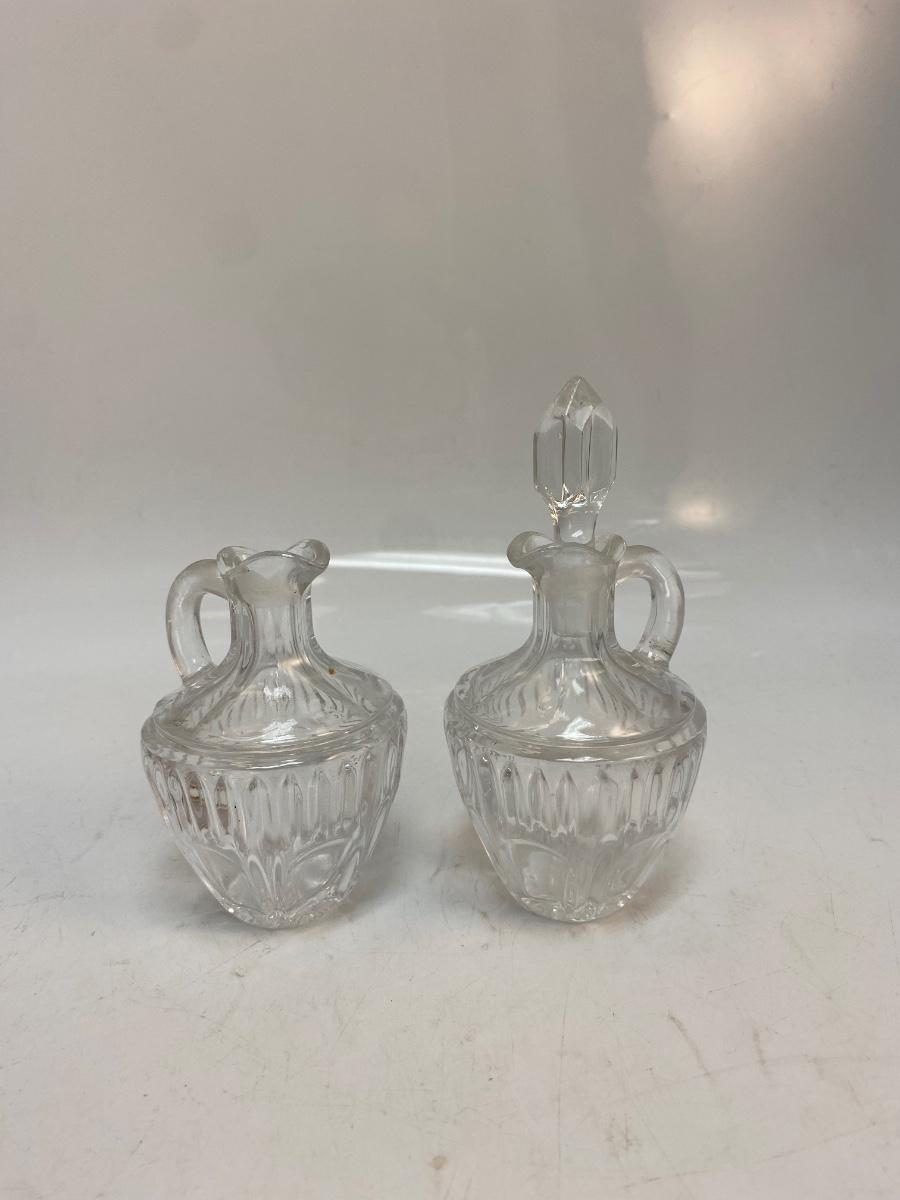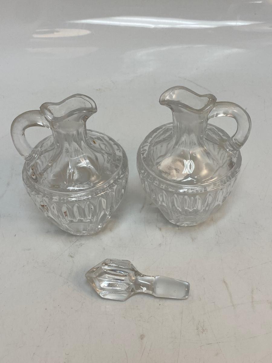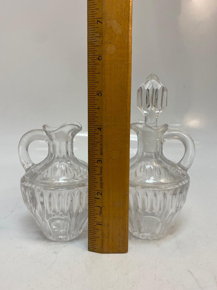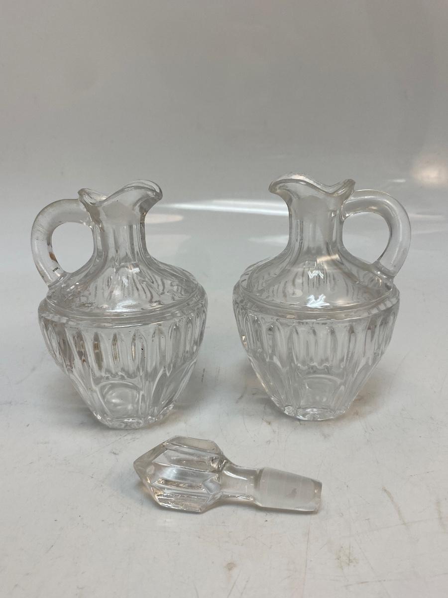 Vintage Small Clear Pressed Glass Cruet Decanter Oil Vinegar Bottles. Matching bottles, one with stopper. No chips, about 4" size.