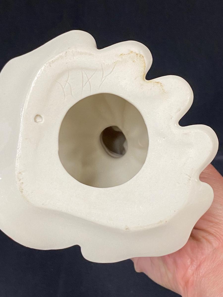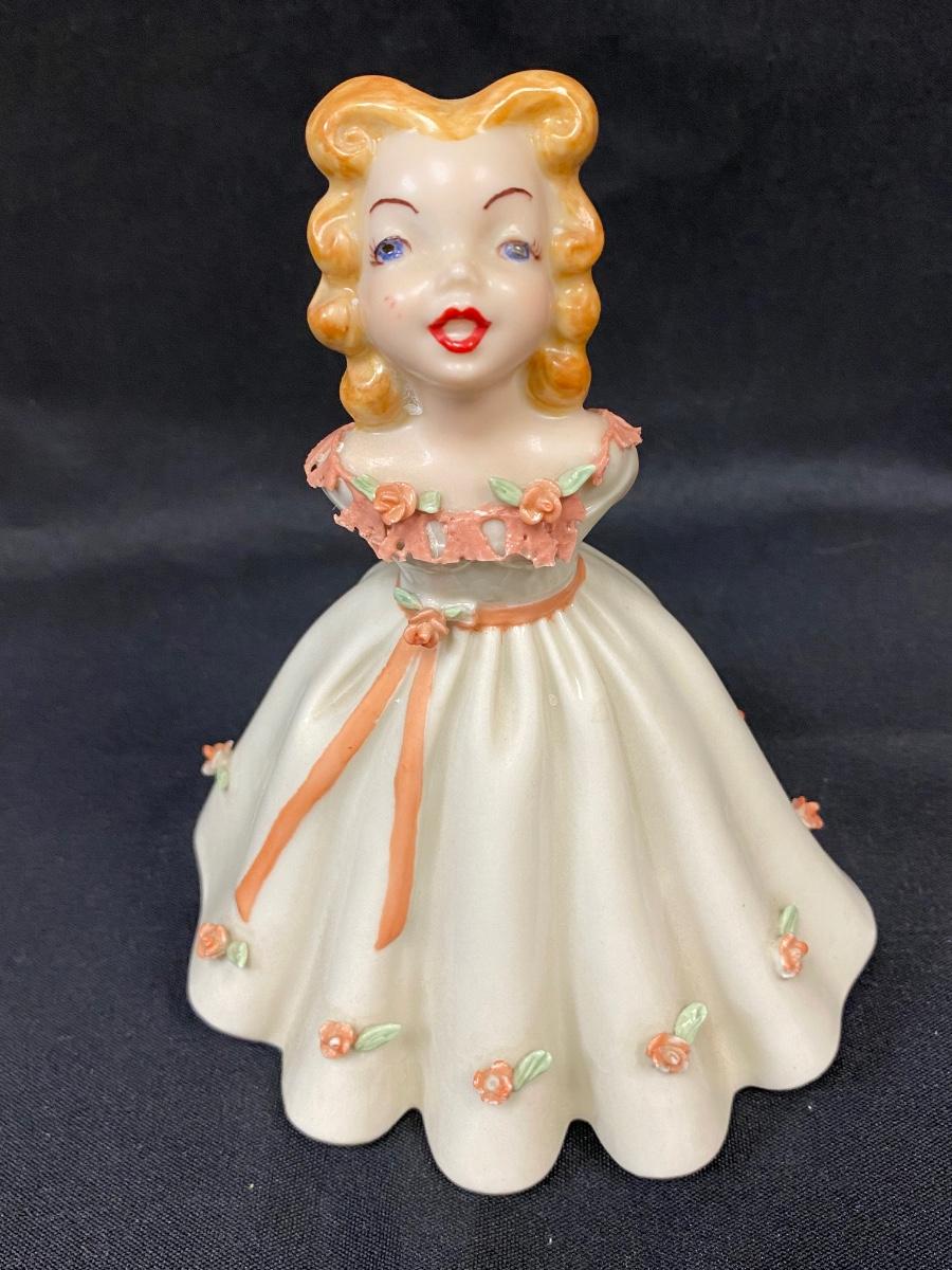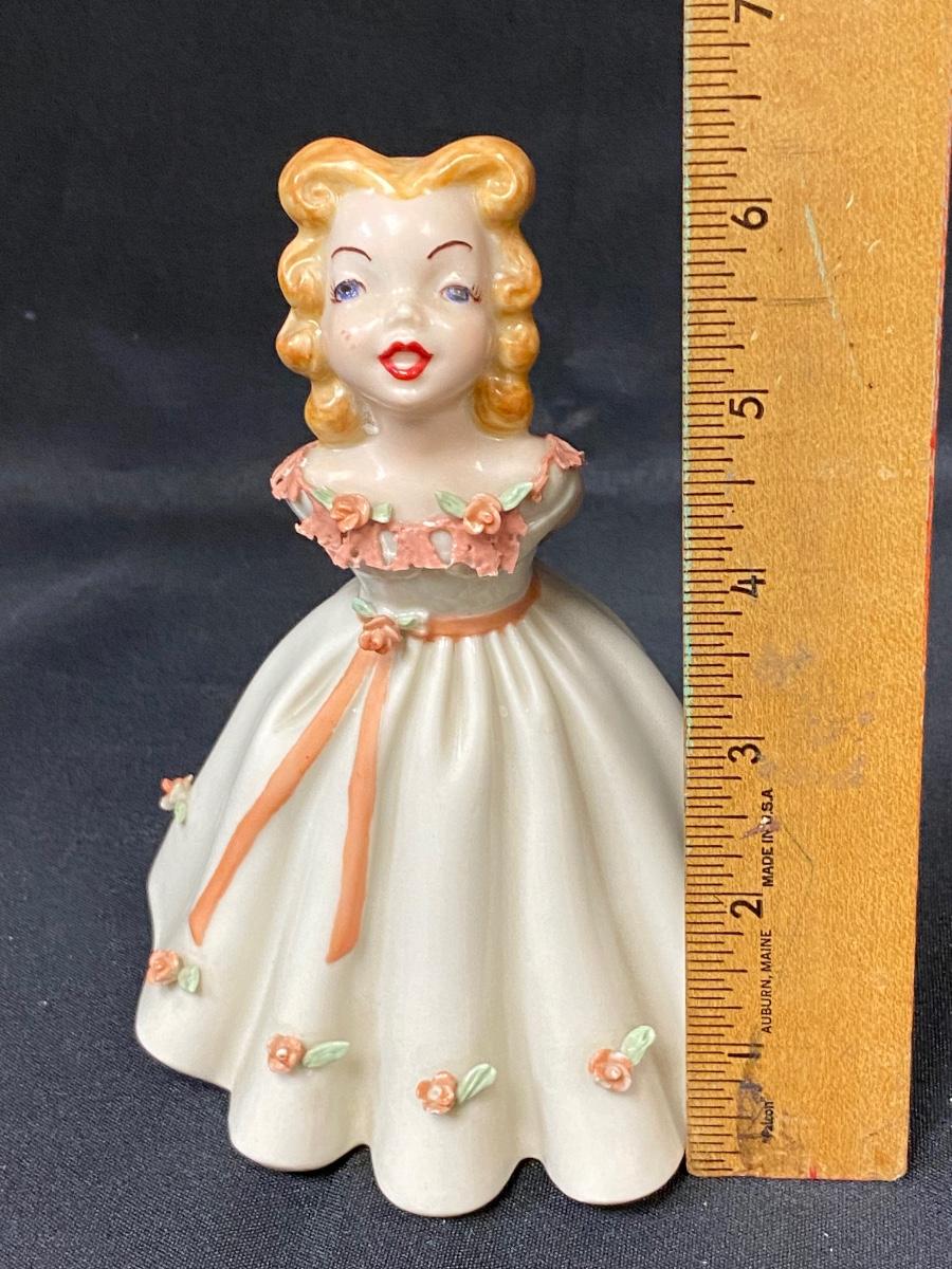 Vintage Ceramic Porcelain Girl with Flower Dress Leaning Forward Figurine. In good condition, no chips noticed not even on the flowers. No maker name but Kay scratched into bottom. About 6.5" size.