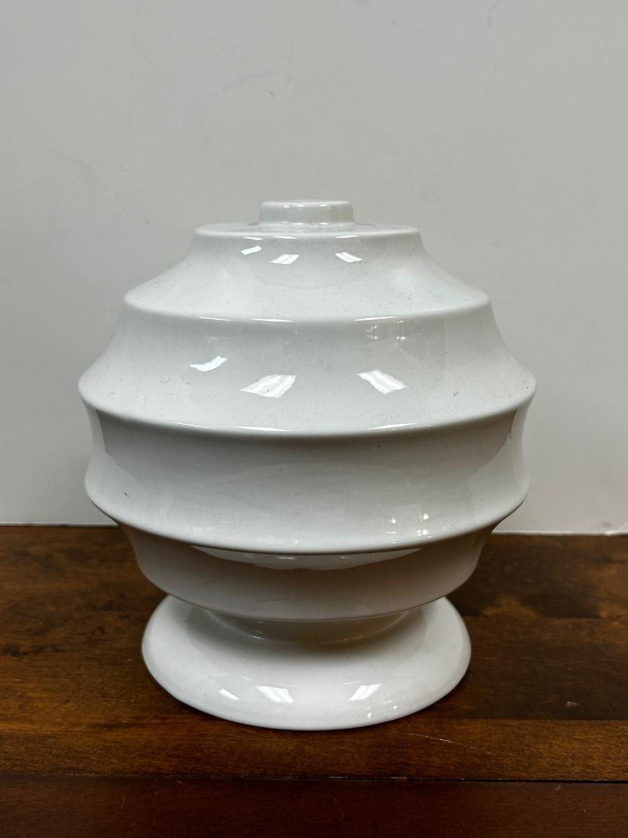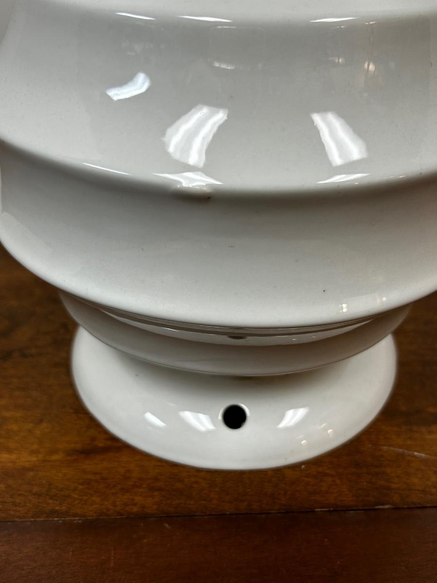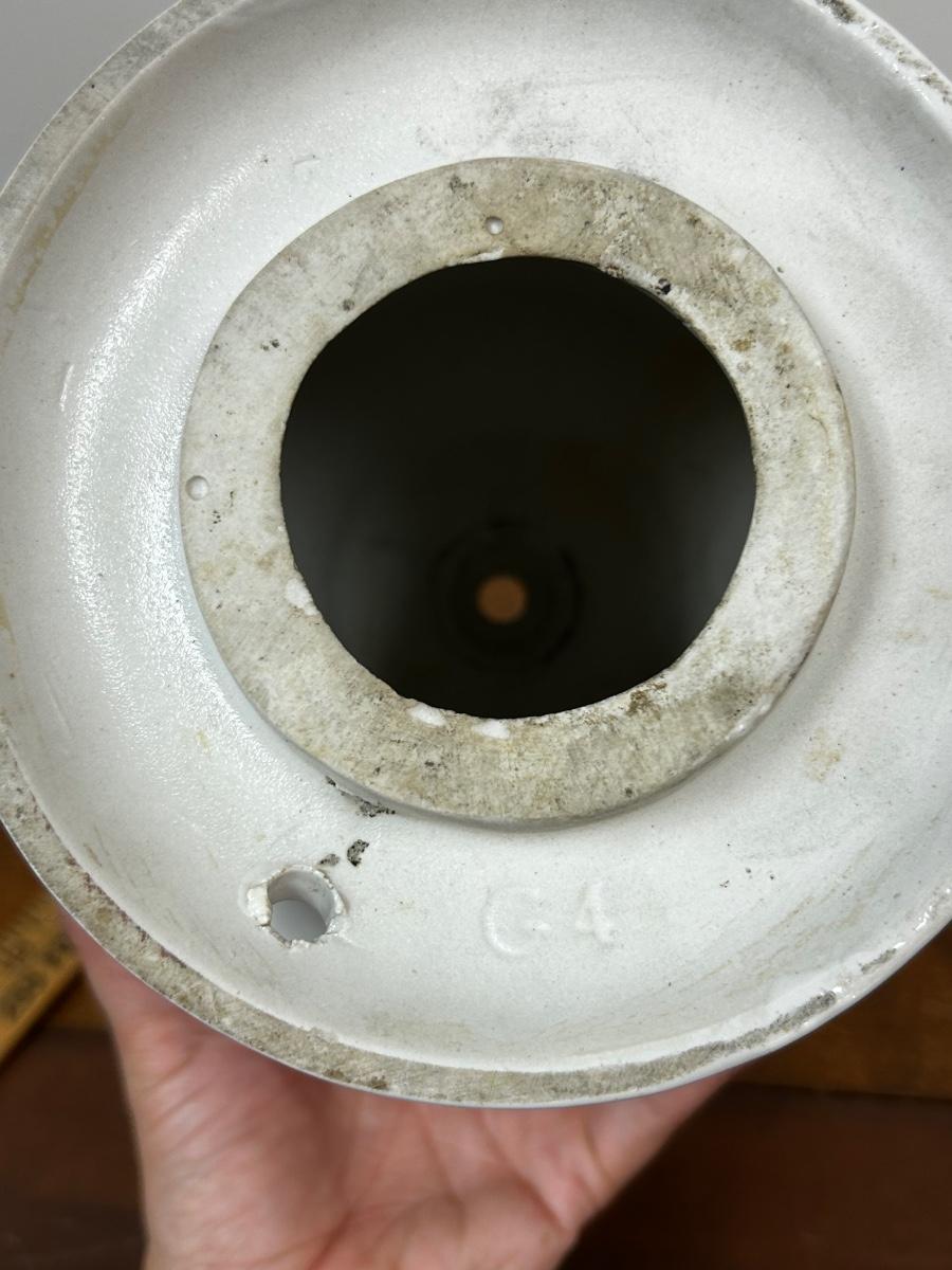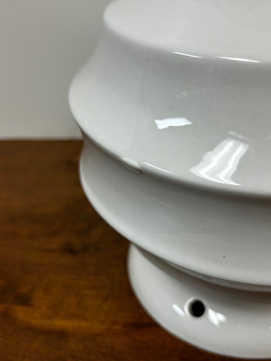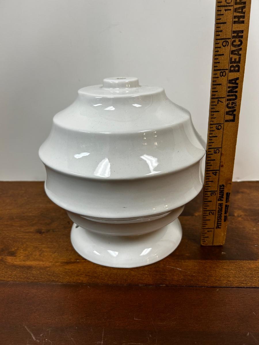 Vintage Midcentury White Ceramic Ribbed Lamp Base for Repair or Display. Has holes for lamp parts but looks cool as abstract pottery piece. No name on bottom just stamped G4. About 8" size. No chips but odd flaw along one edge.