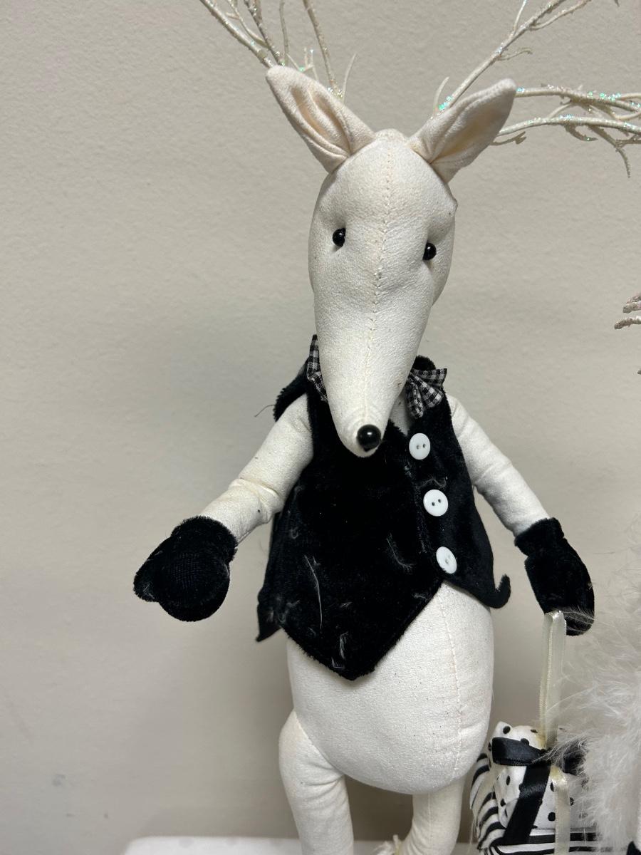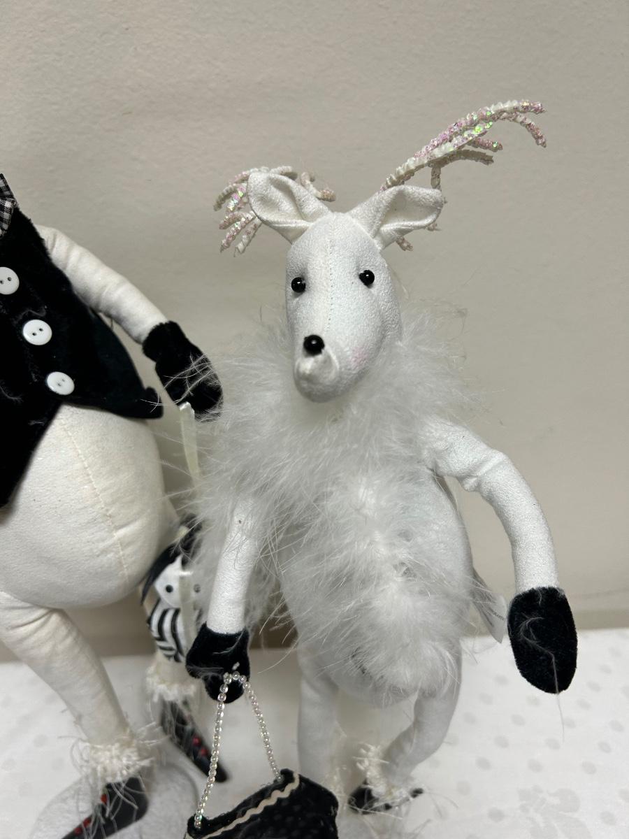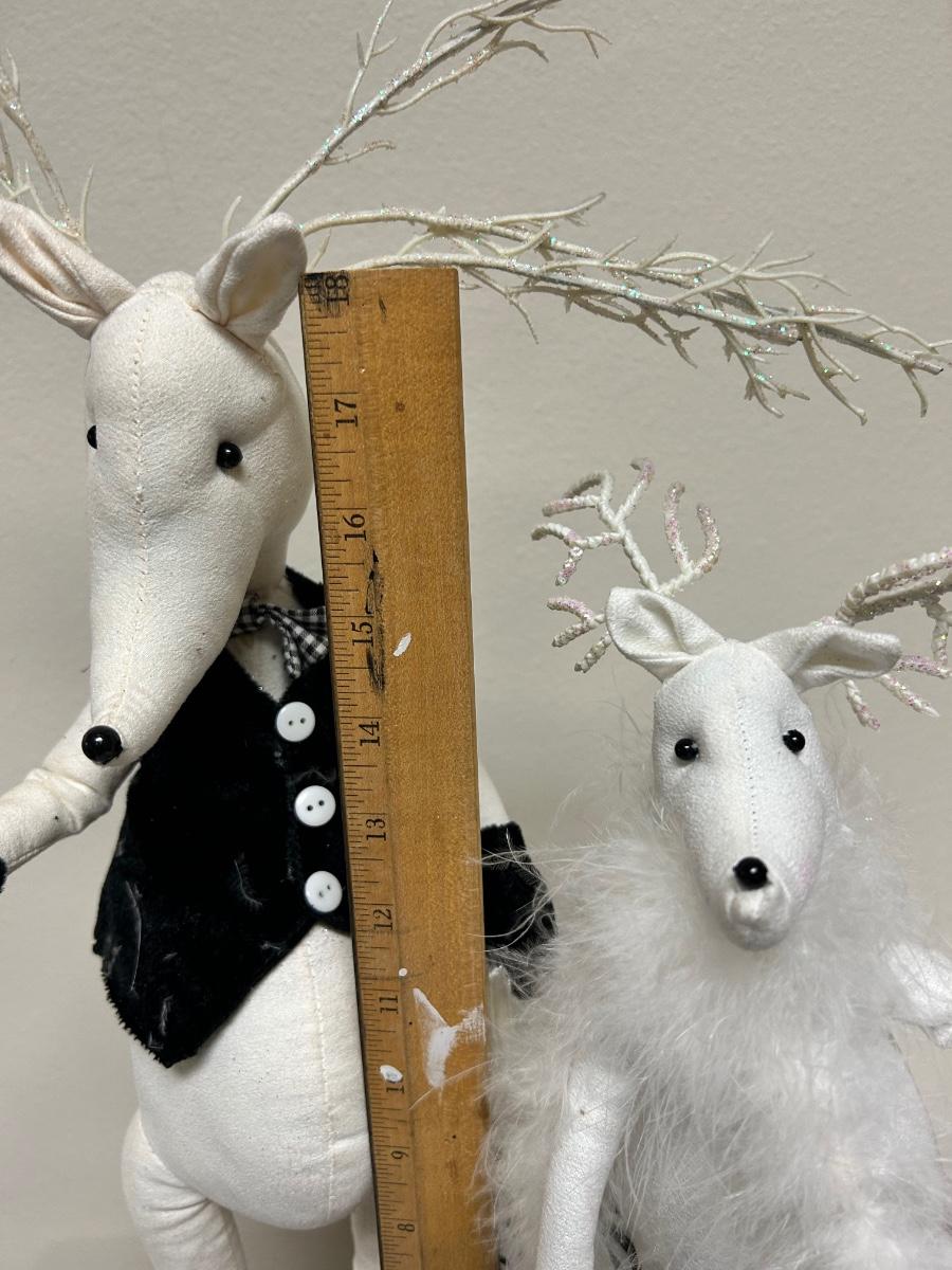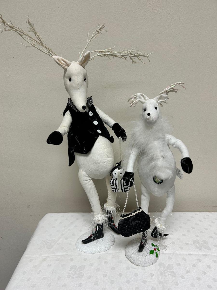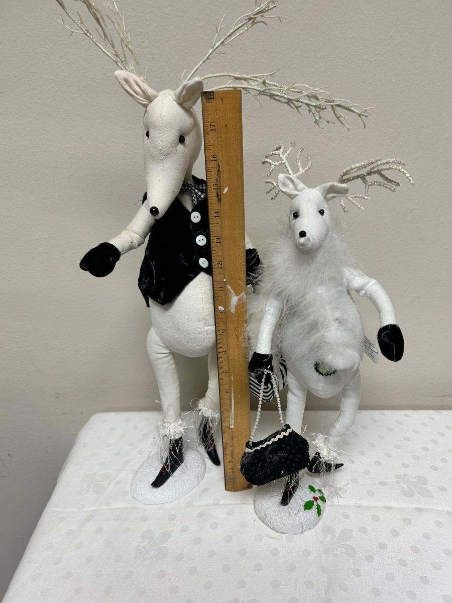 Black and White Slender Reindeer Plush Figurines Christmas Holiday Decor. In previously displayed condition, may be a little dusty.