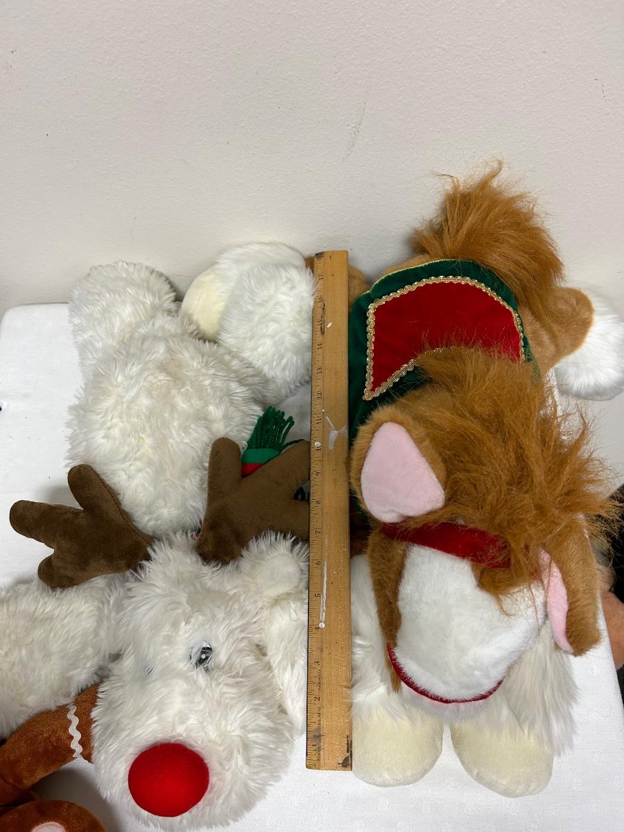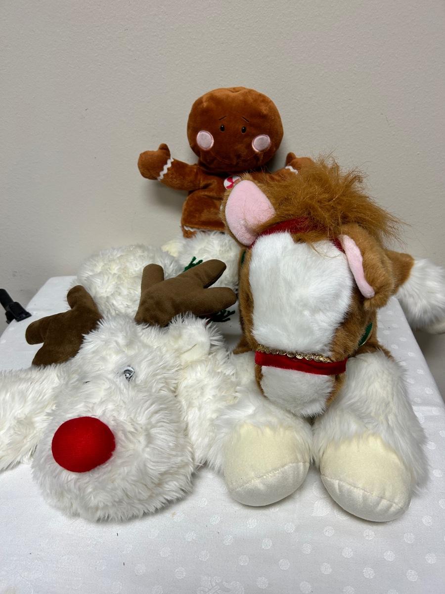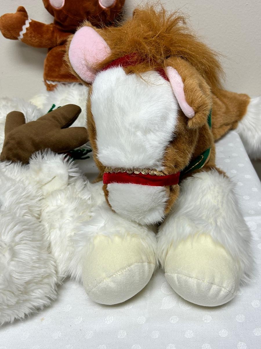 Pair of Christmas Holiday Stuffed Plush Animals. White fuzzy reindeer, horse, and a gingerbread man hand puppet. In good, displayed condition.