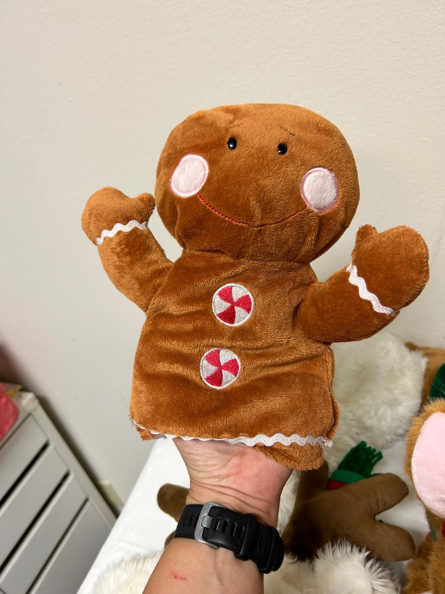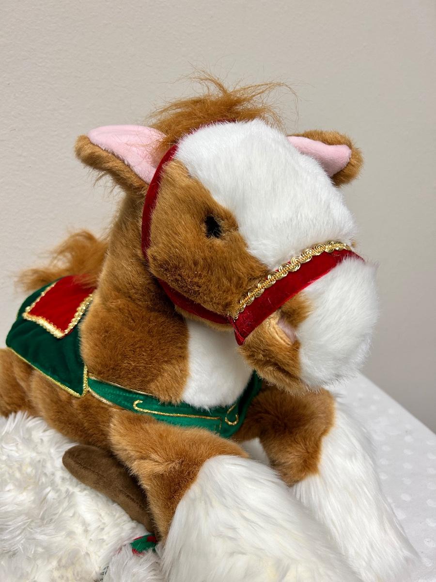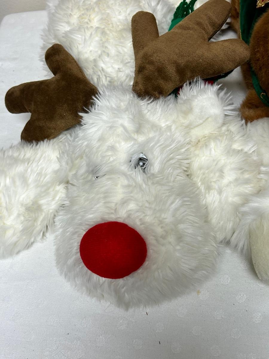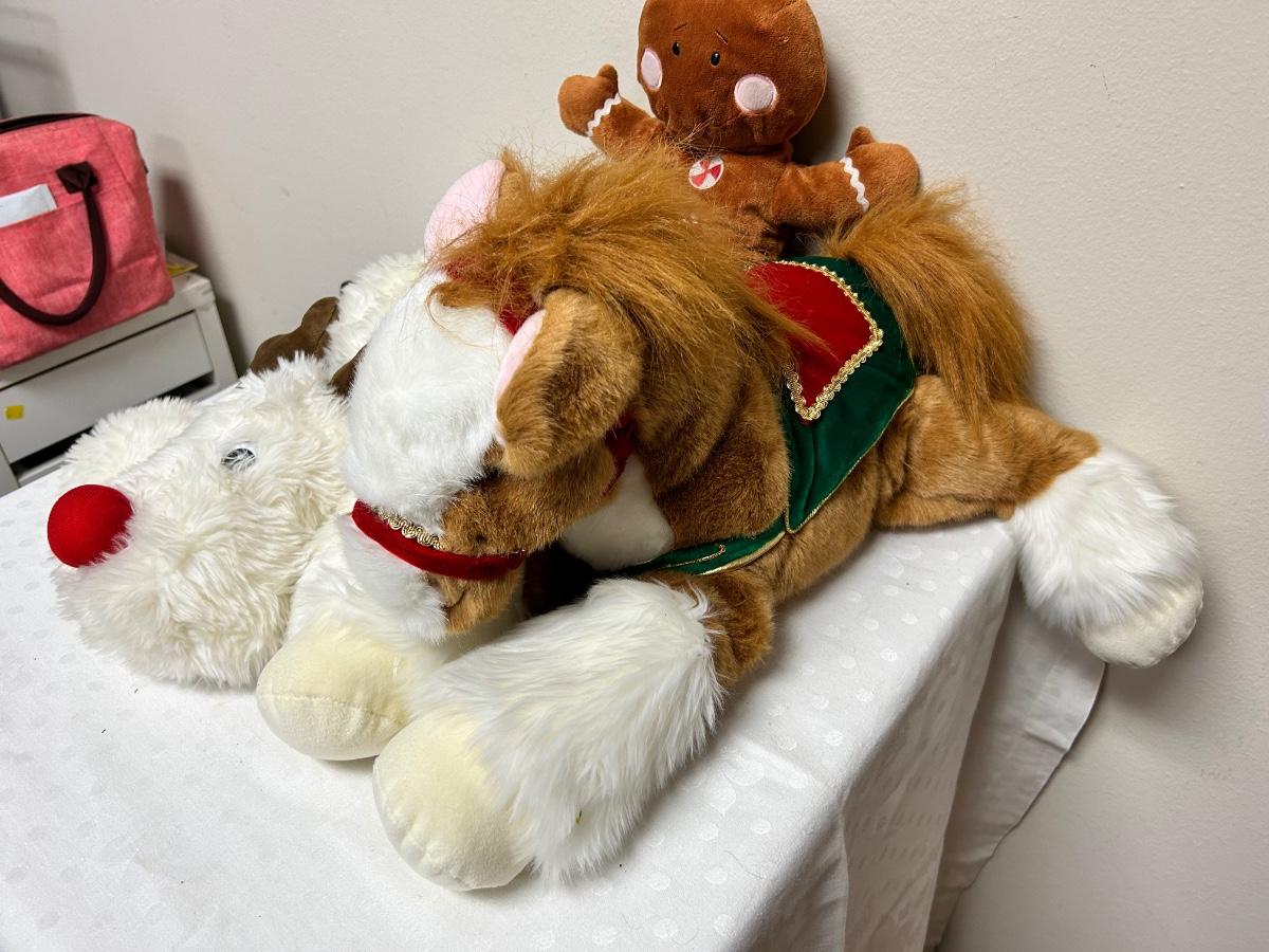 Pair of Christmas Holiday Stuffed Plush Animals. White fuzzy reindeer, horse, and a gingerbread man hand puppet. In good, displayed condition.