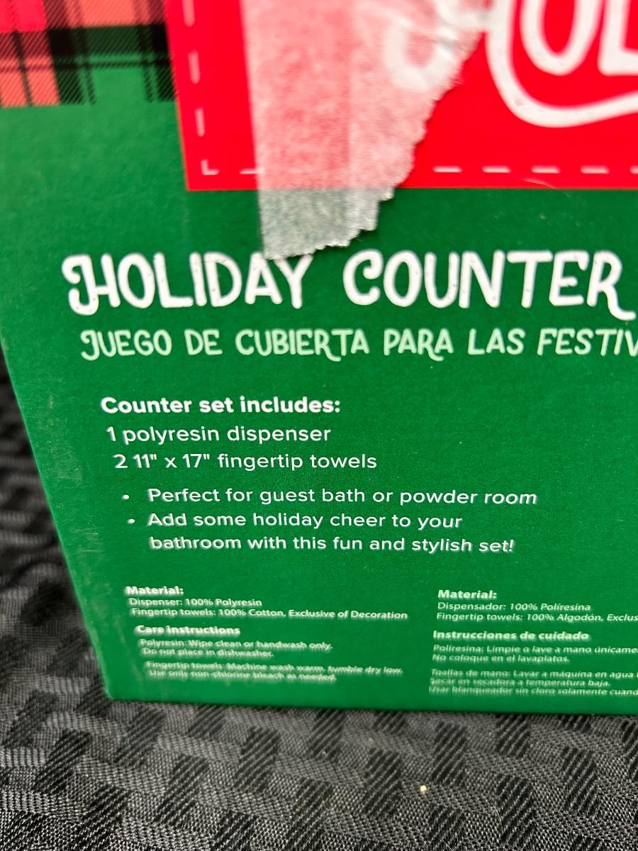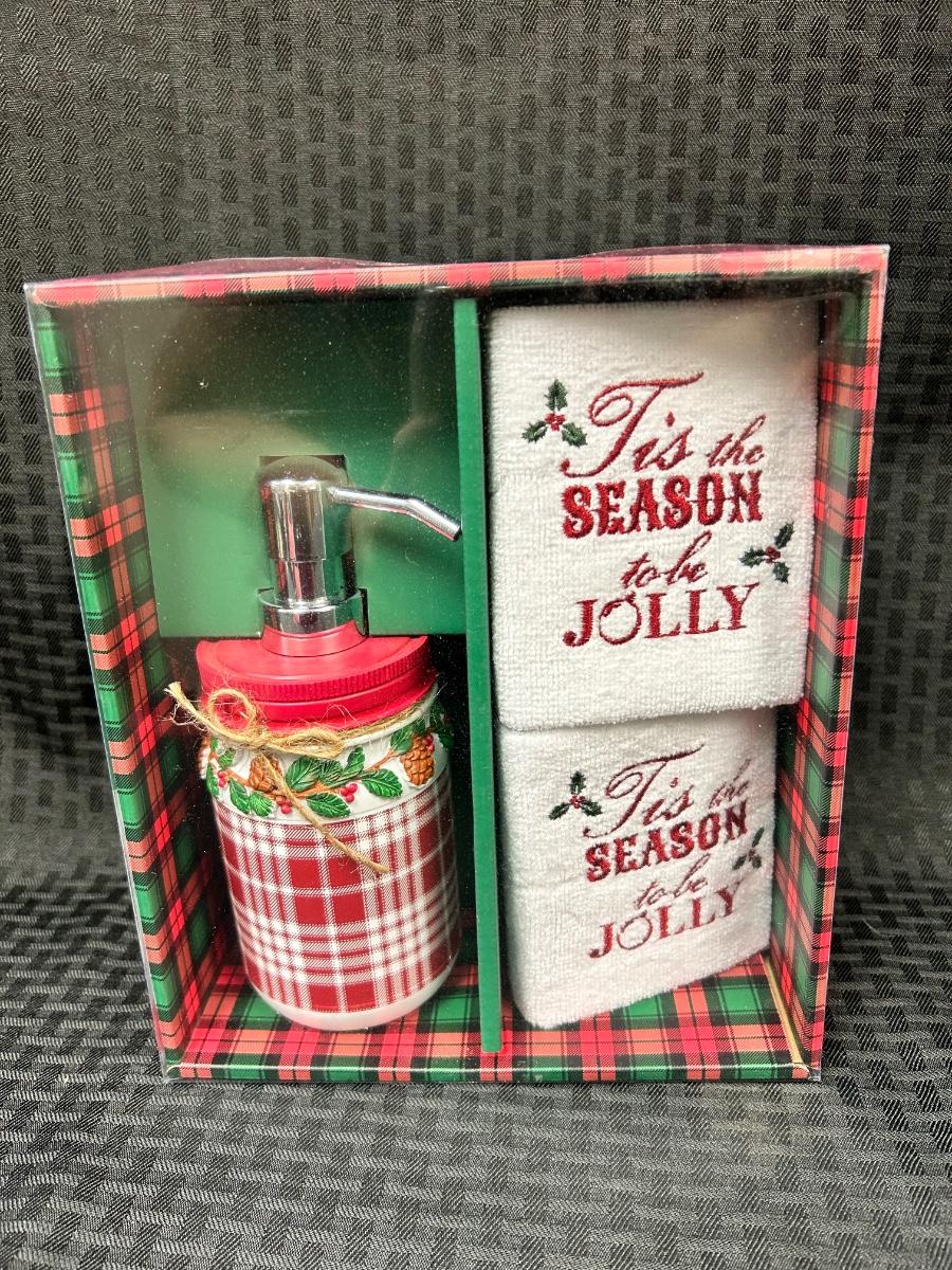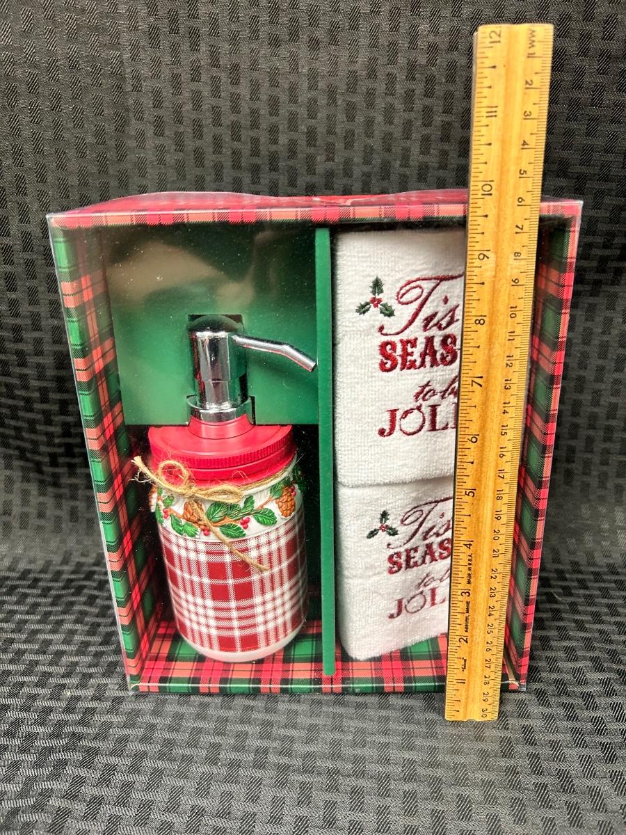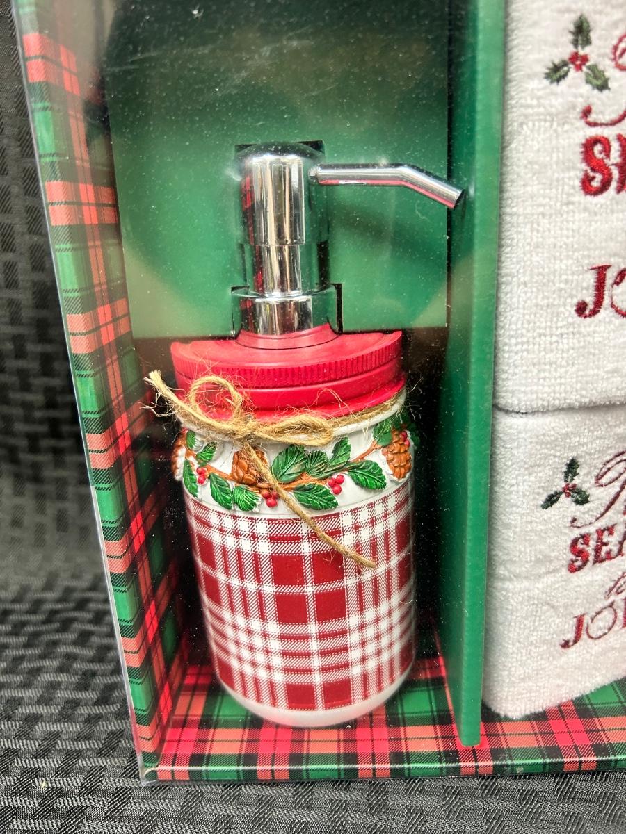New Unopened Holiday Christmas Counter Decor Soap Lotion Pump Bottle and Fingertip Towels. Good condition.