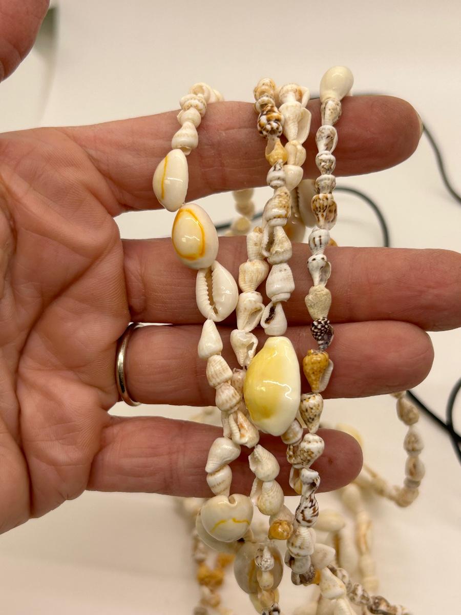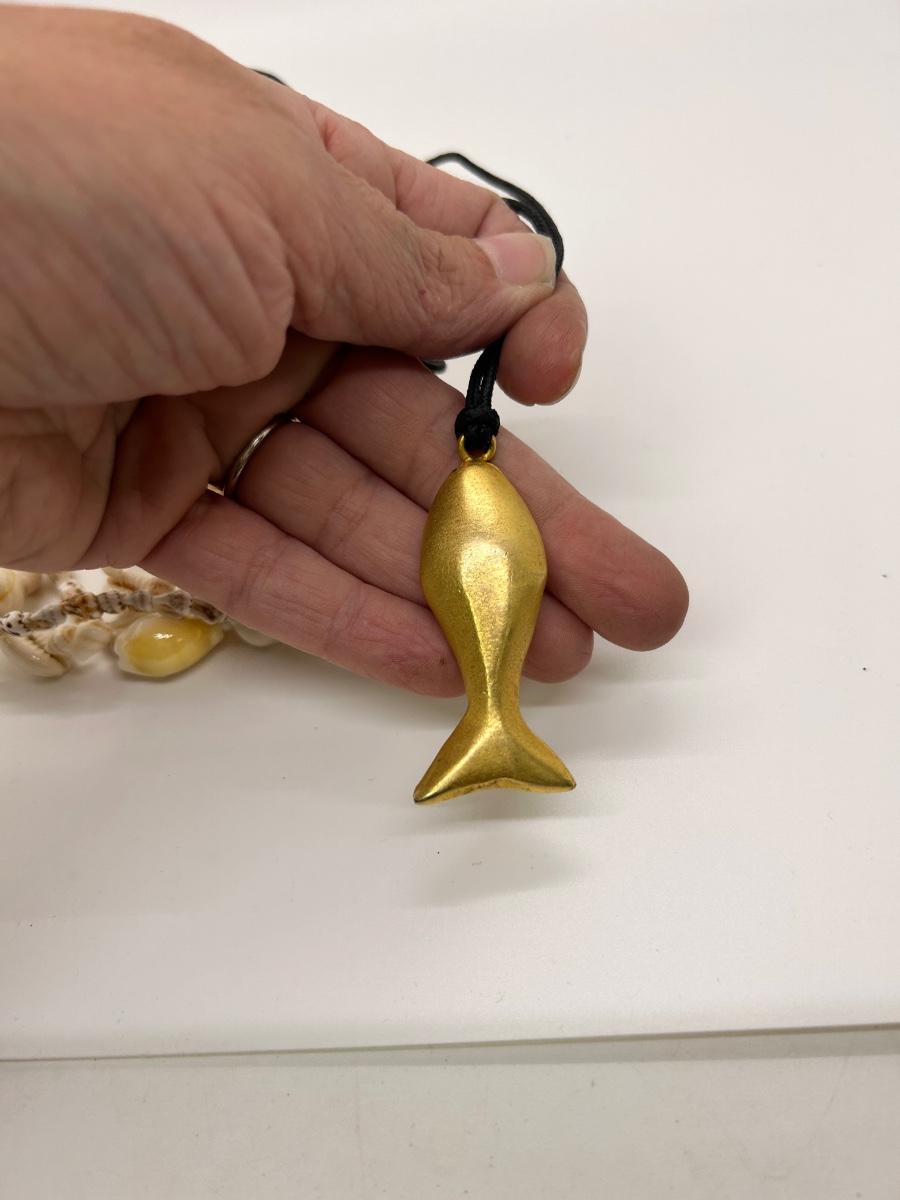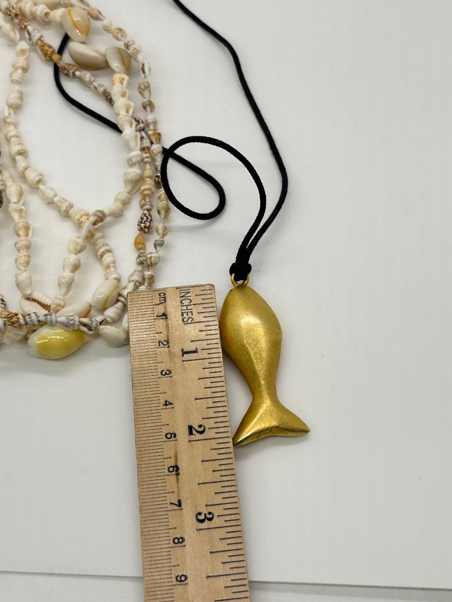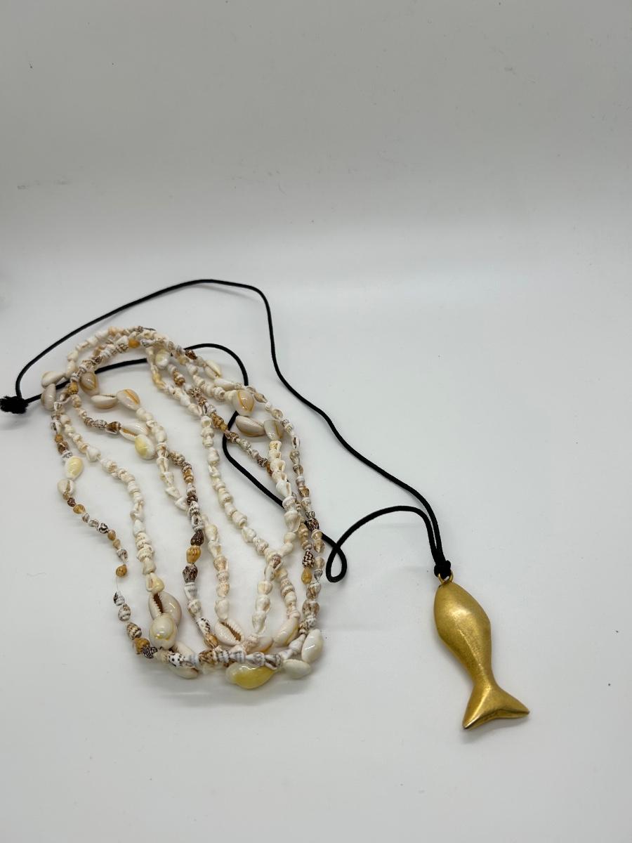 Pair of Tiny Shell Pukka Necklaces & Corded Gold Tone Fish Pendant Necklace. All in good condition.