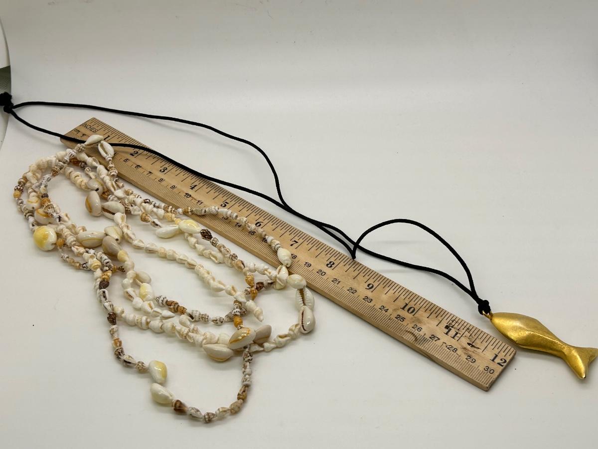 Pair of Tiny Shell Pukka Necklaces & Corded Gold Tone Fish Pendant Necklace