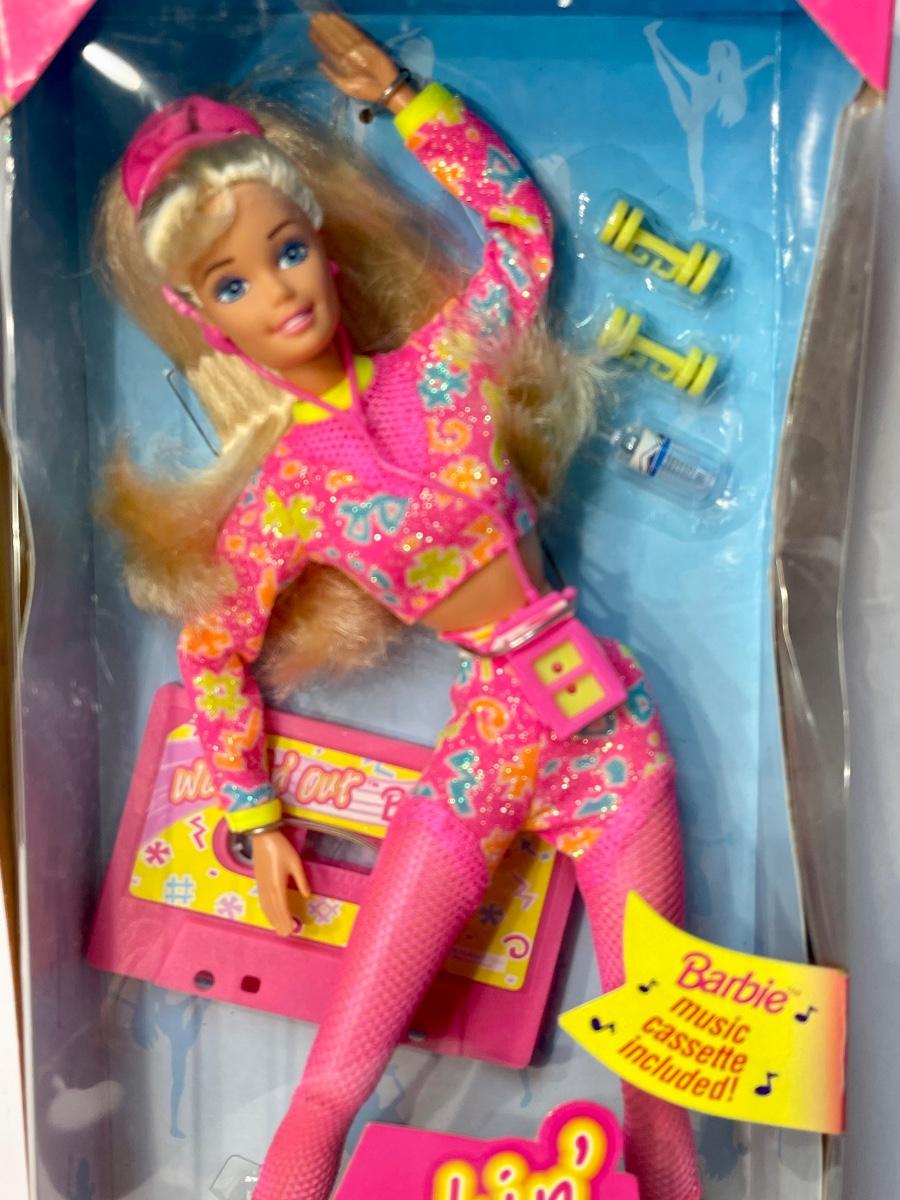 1996 edition. Includes workout dumbbells, water bottle, walkman with headphones and cassette tape of workout music. Box has some wrinkles due to storage, but is fully intact.