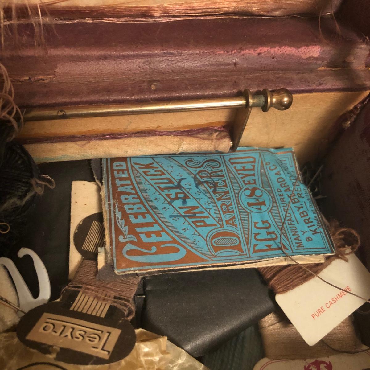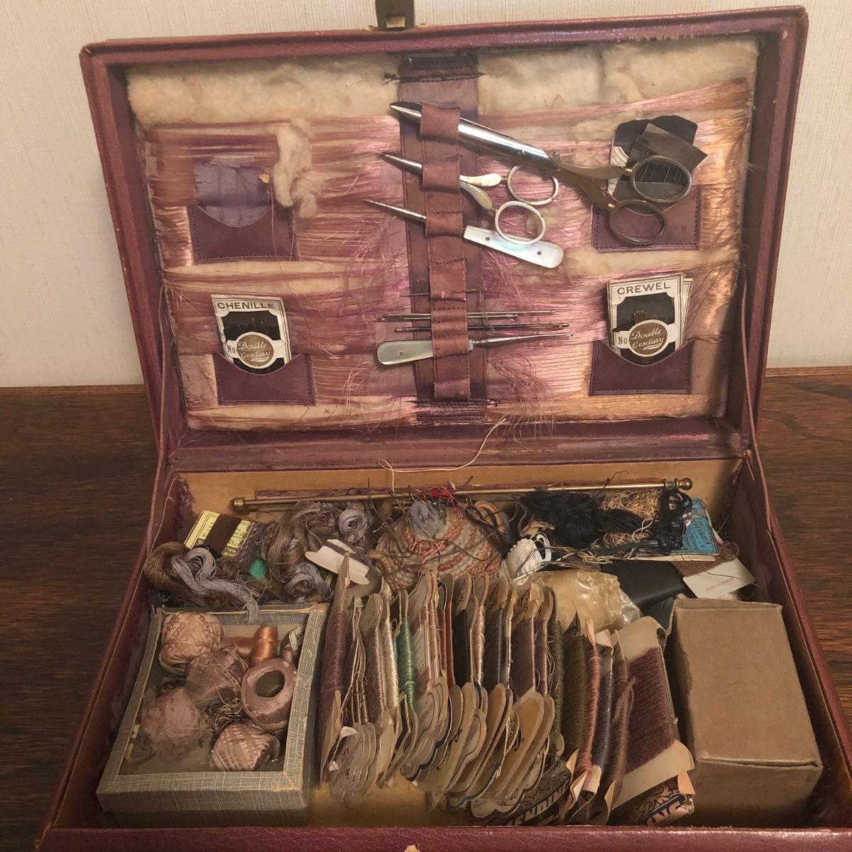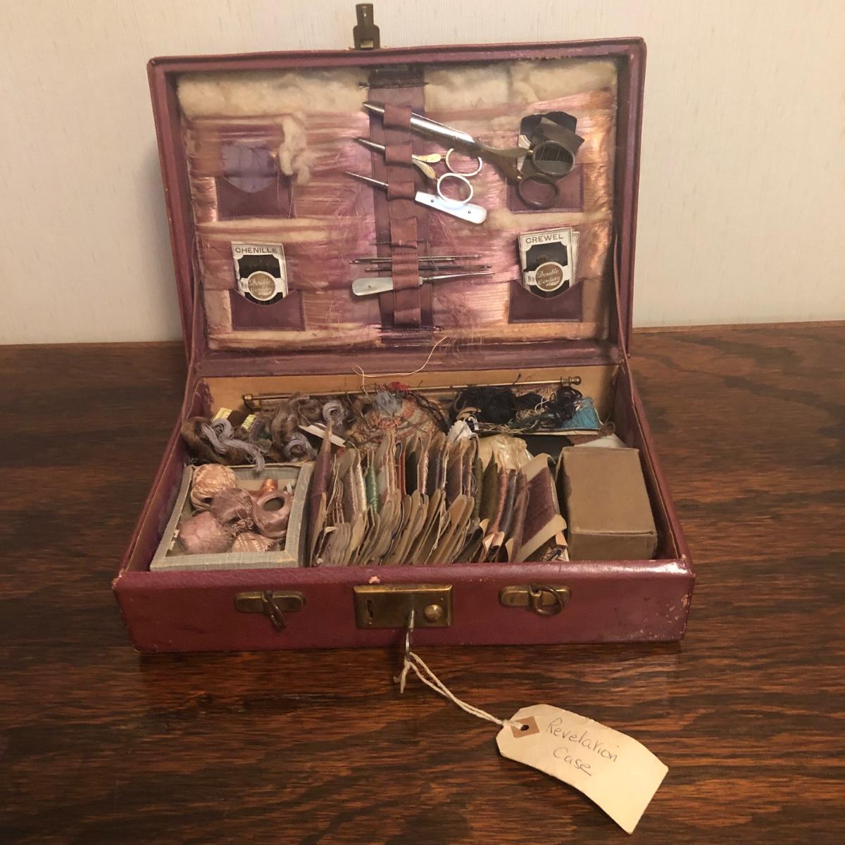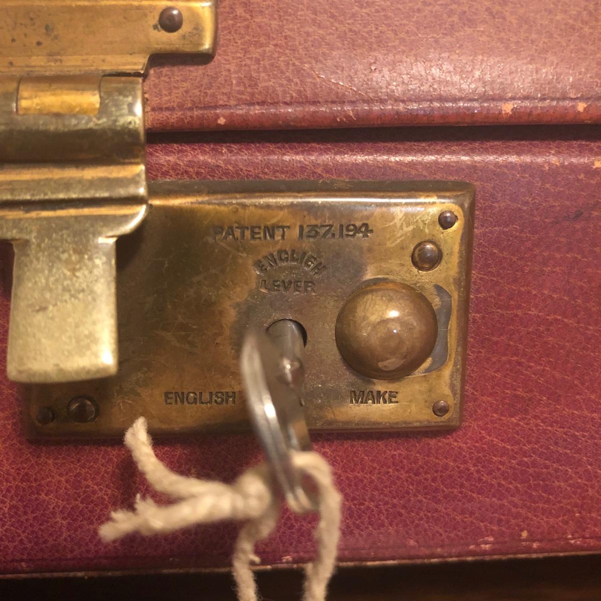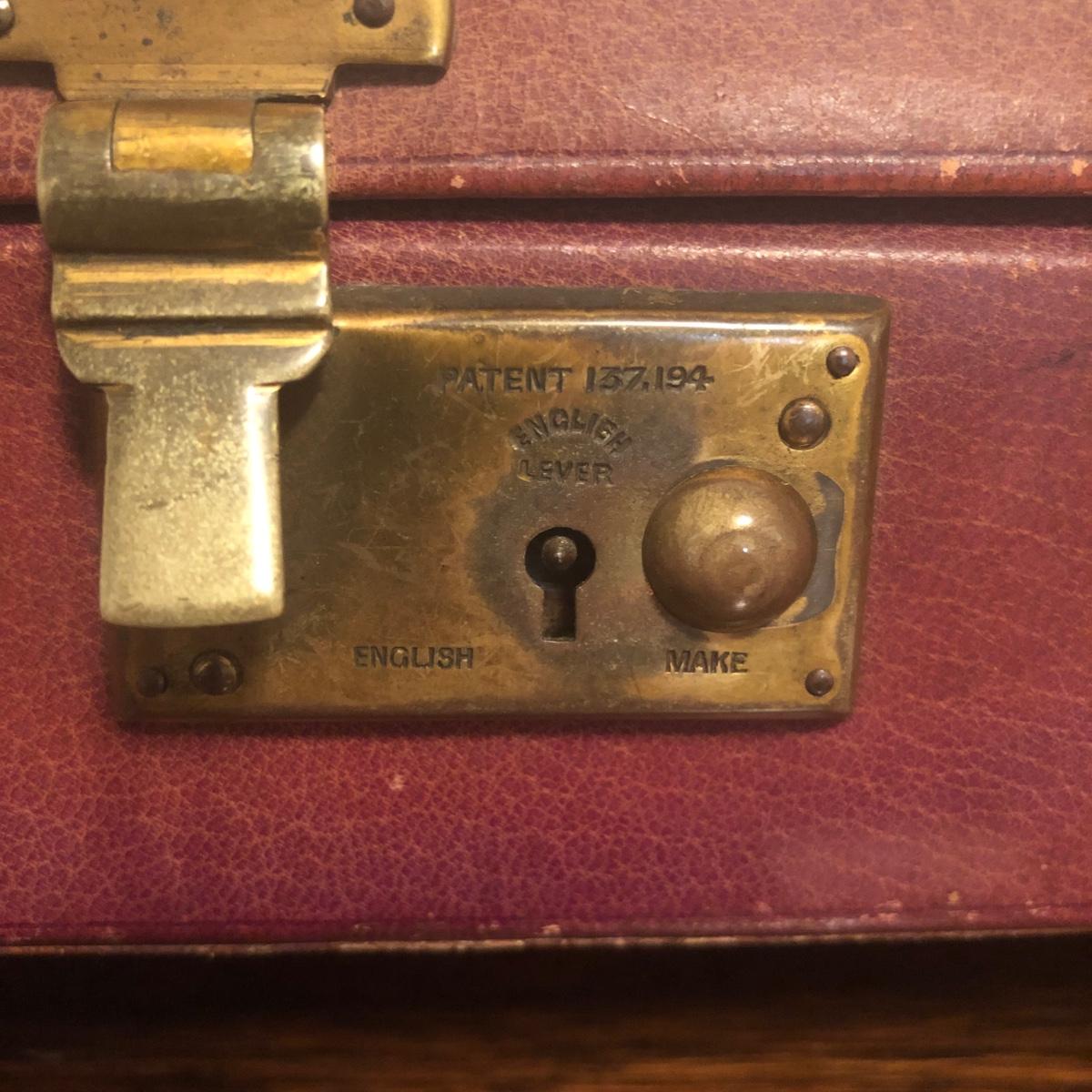 This red brown leather case opens with a skeleton key and contains antique scissors, needles, handmade pincushion, bees wax, Pringle cashmere thread, mending cotton, mending silk, and more. The lock on the box is marked Pat 137, 134 English Lever English Make.