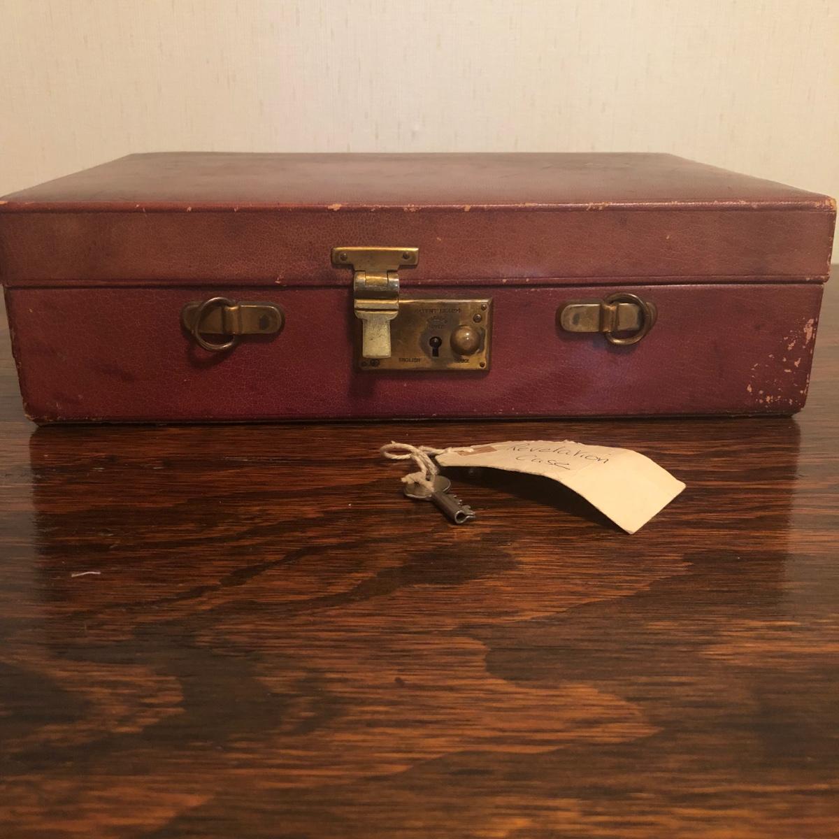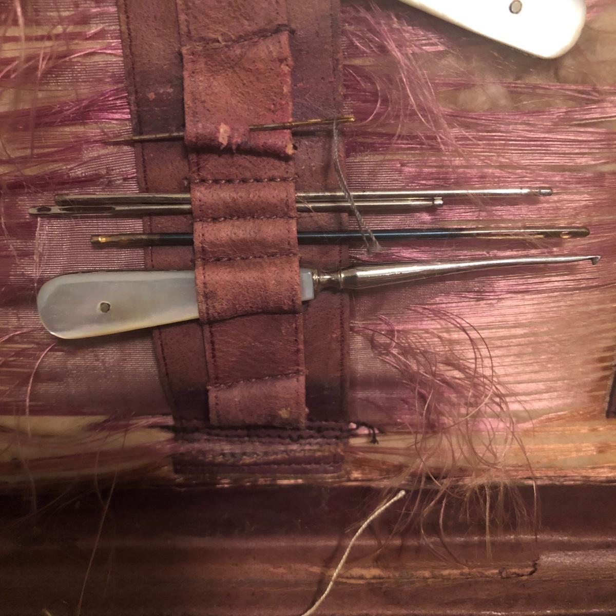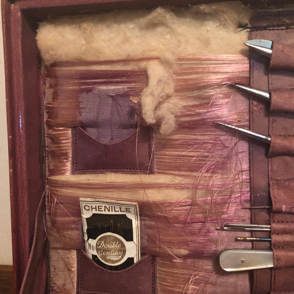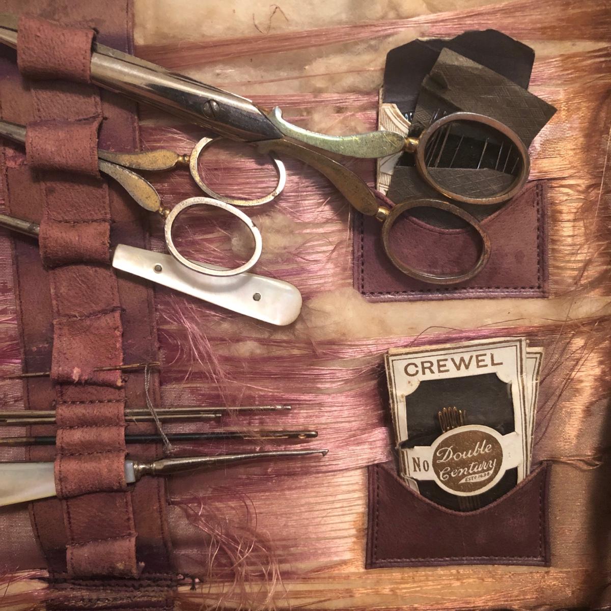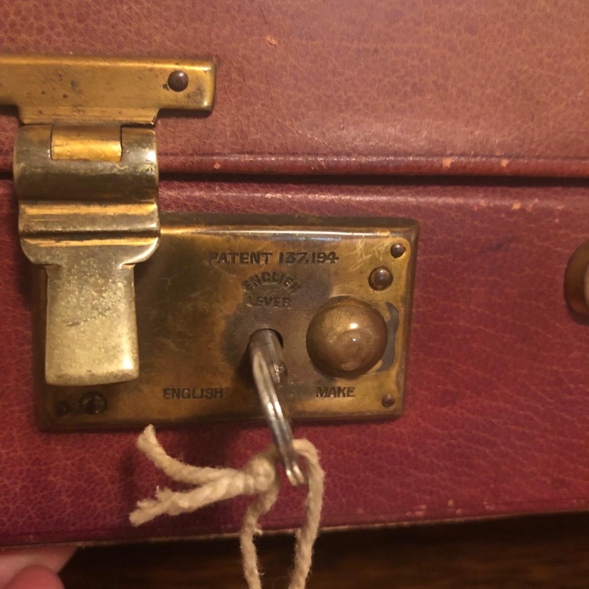 This red brown leather case opens with a skeleton key and contains antique scissors, needles, handmade pincushion, bees wax, Pringle cashmere thread, mending cotton, mending silk, and more. The lock on the box is marked Pat 137, 134 English Lever English Make.