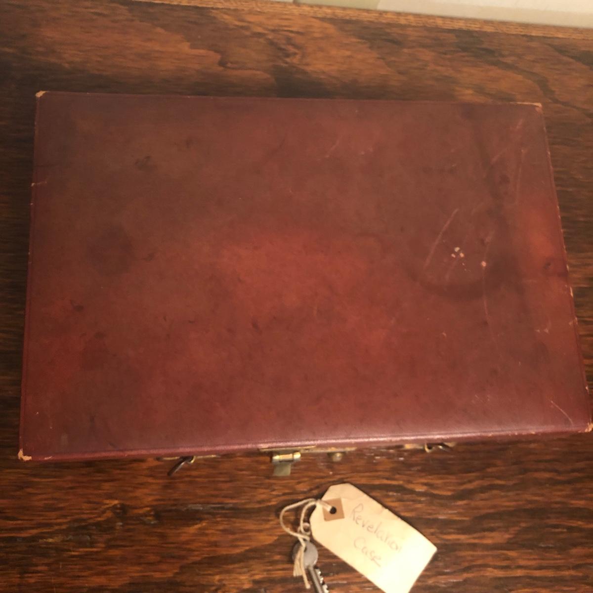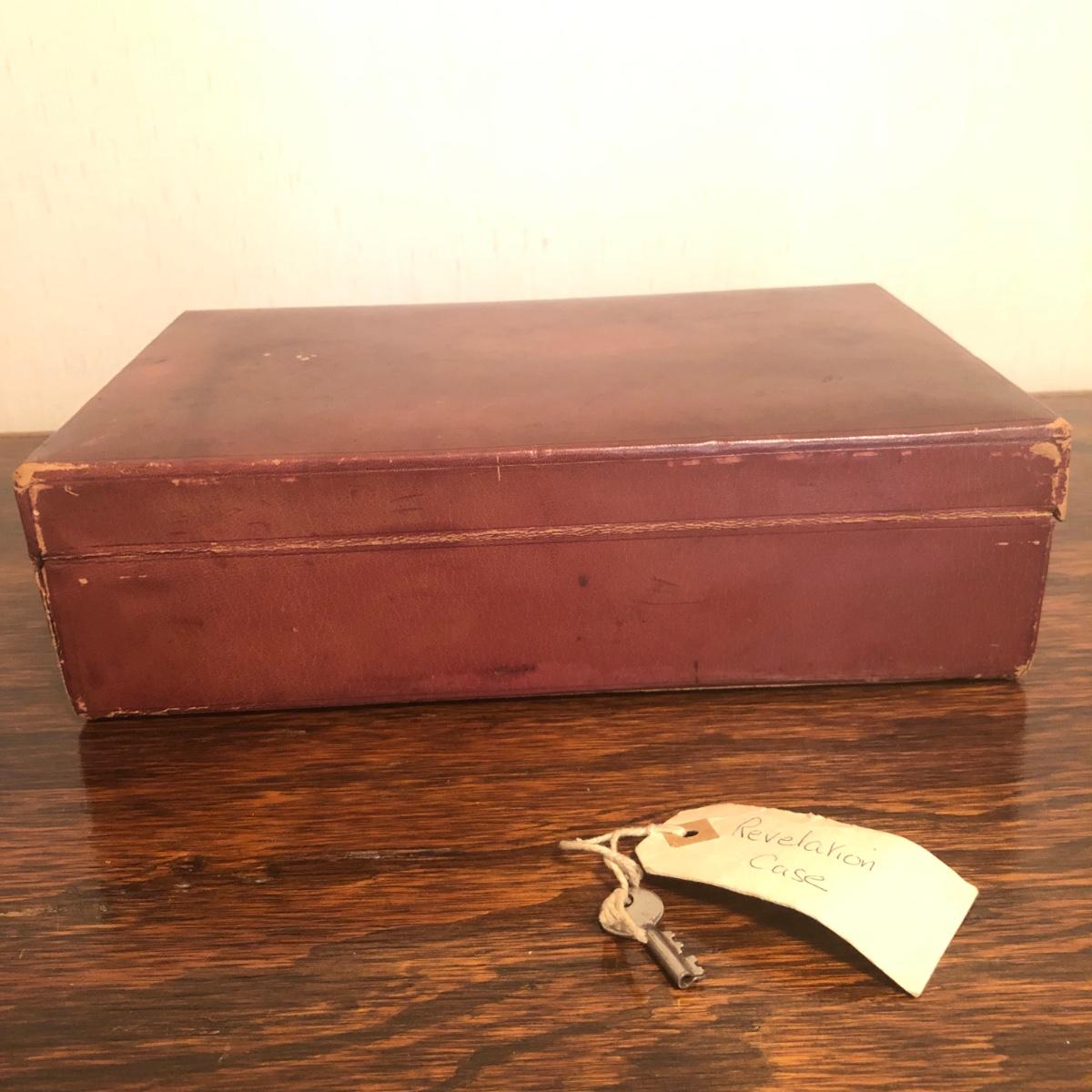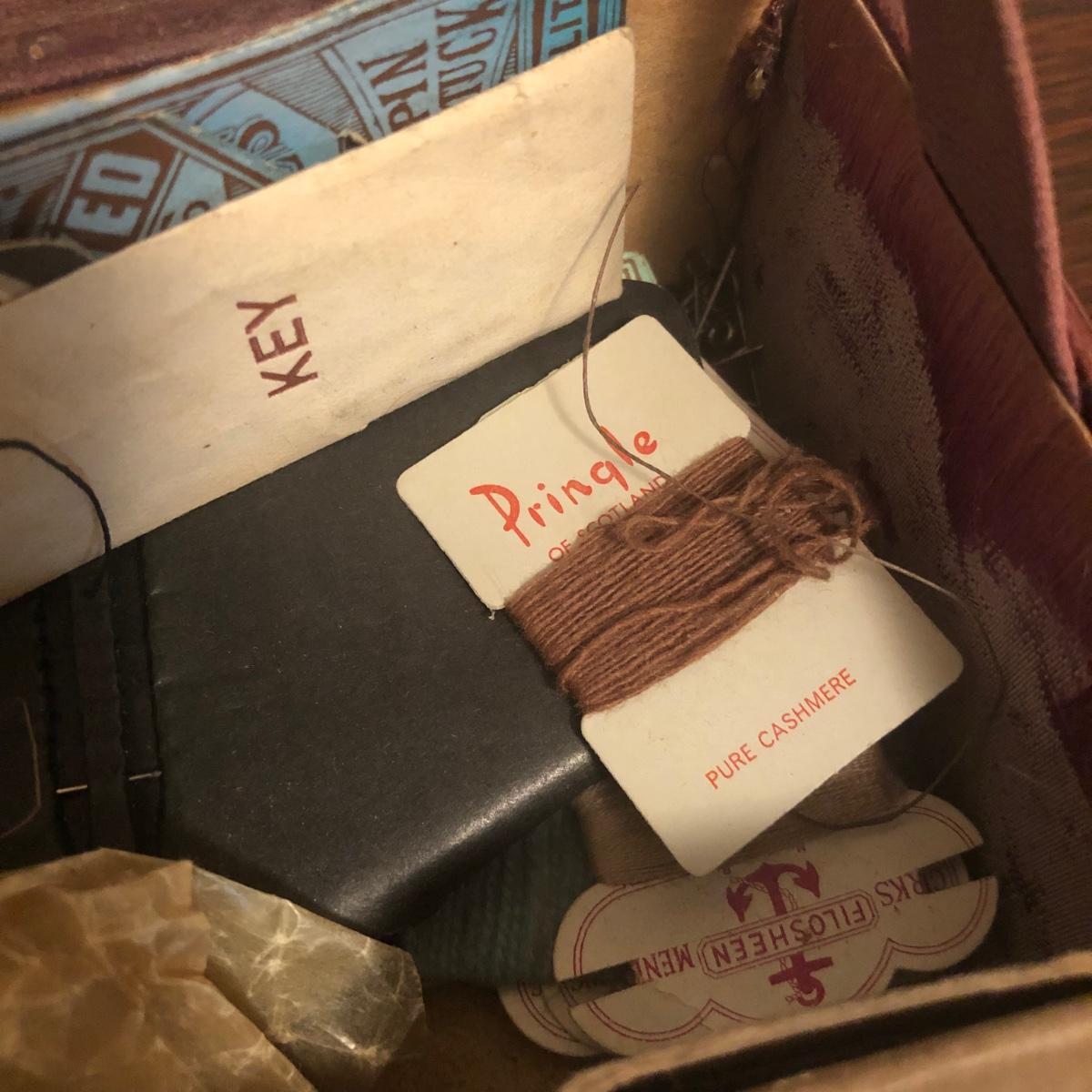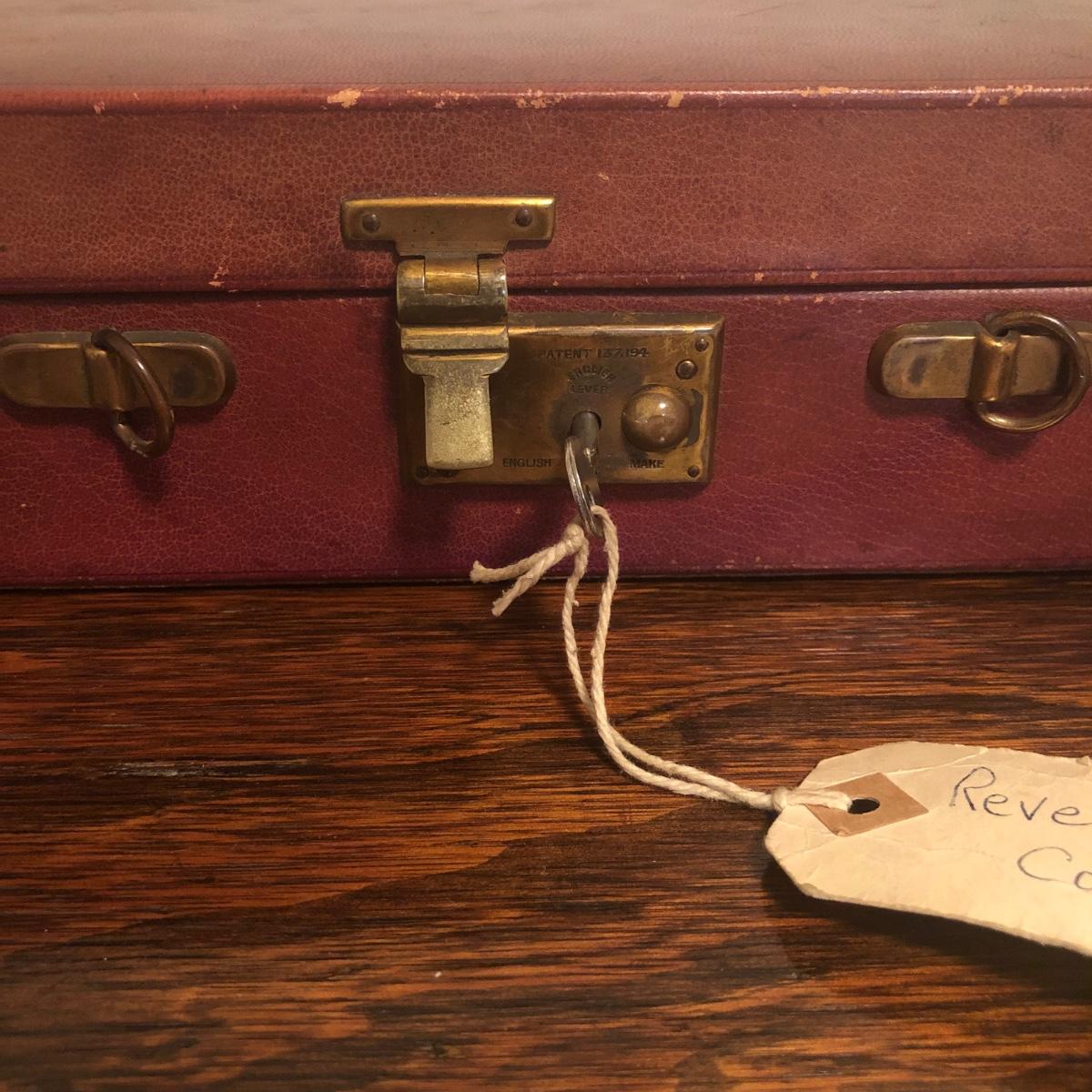 This red brown leather case opens with a skeleton key and contains antique scissors, needles, handmade pincushion, bees wax, Pringle cashmere thread, mending cotton, mending silk, and more. The lock on the box is marked Pat 137, 134 English Lever English Make.