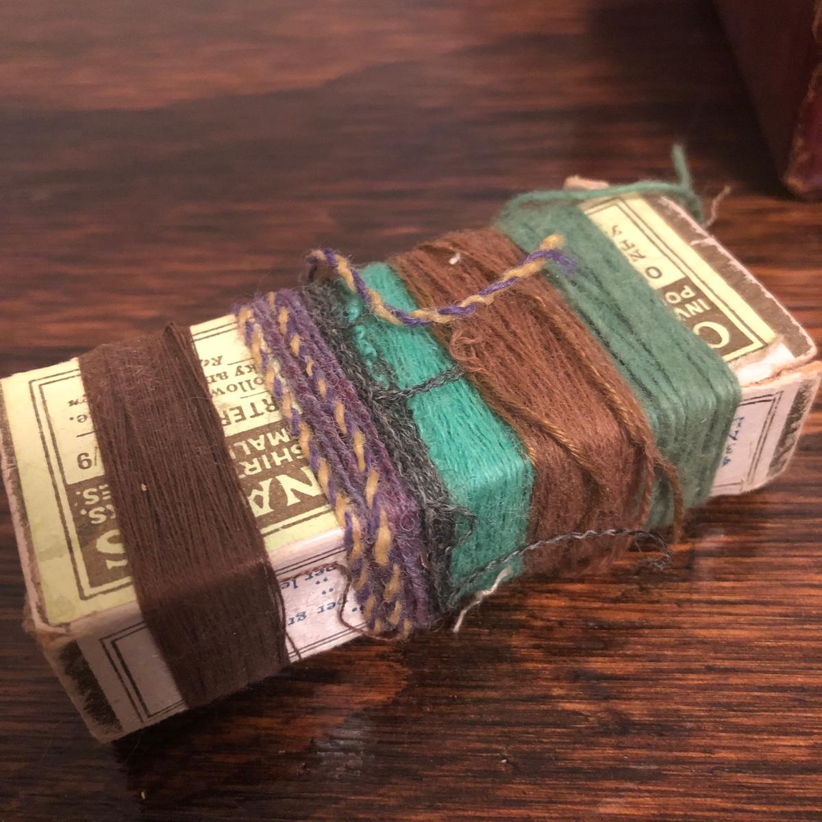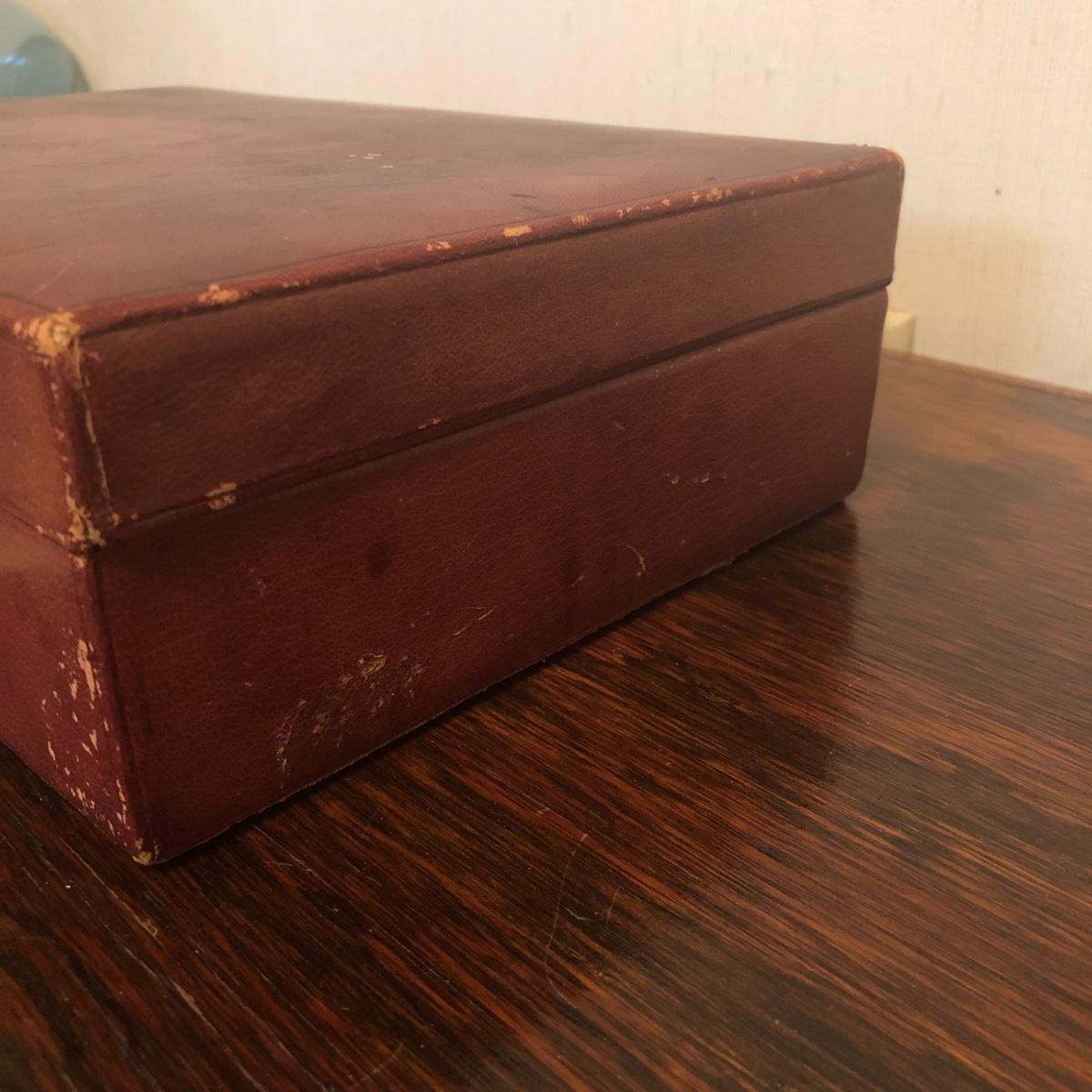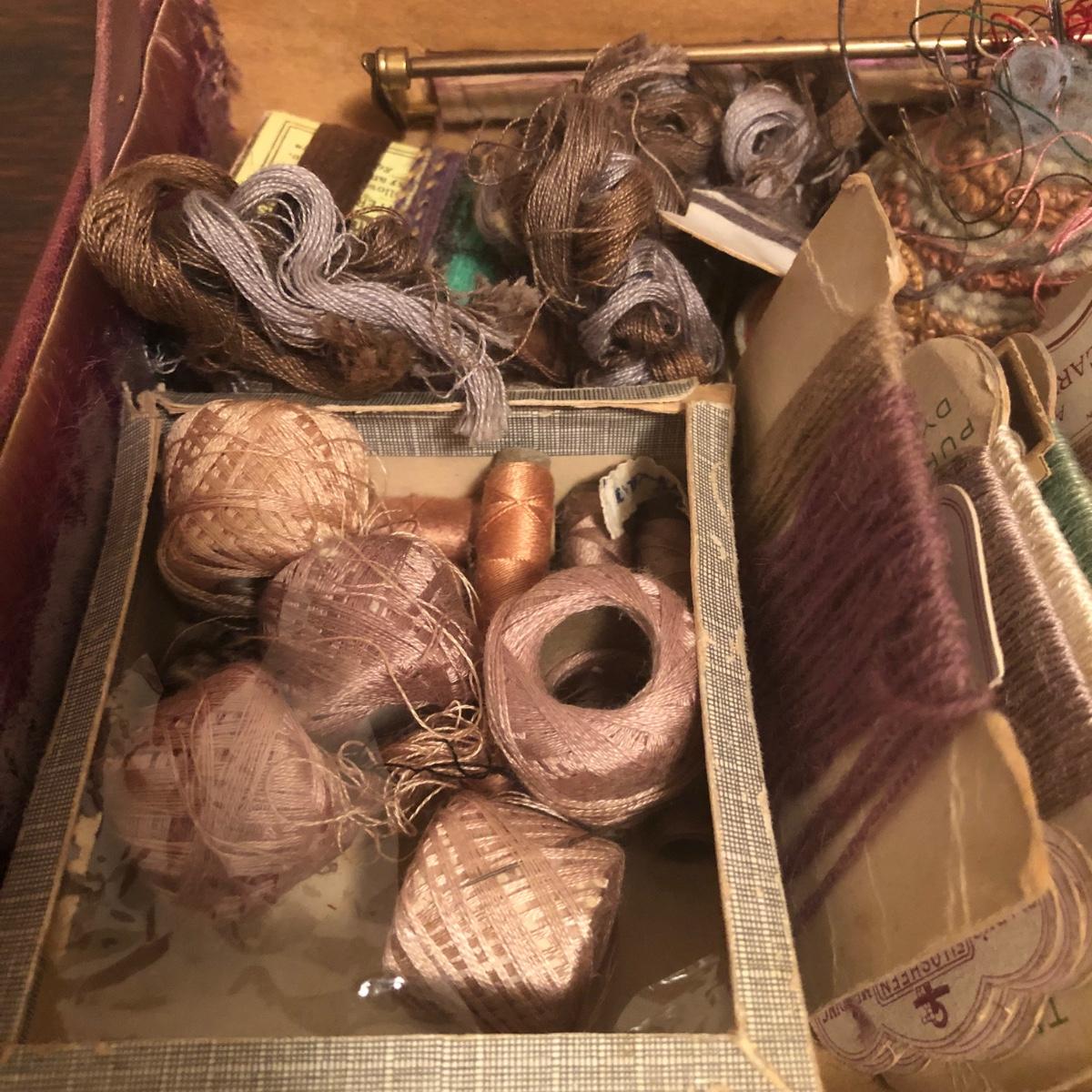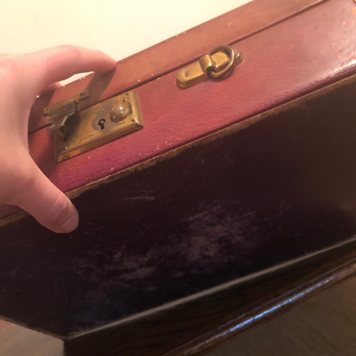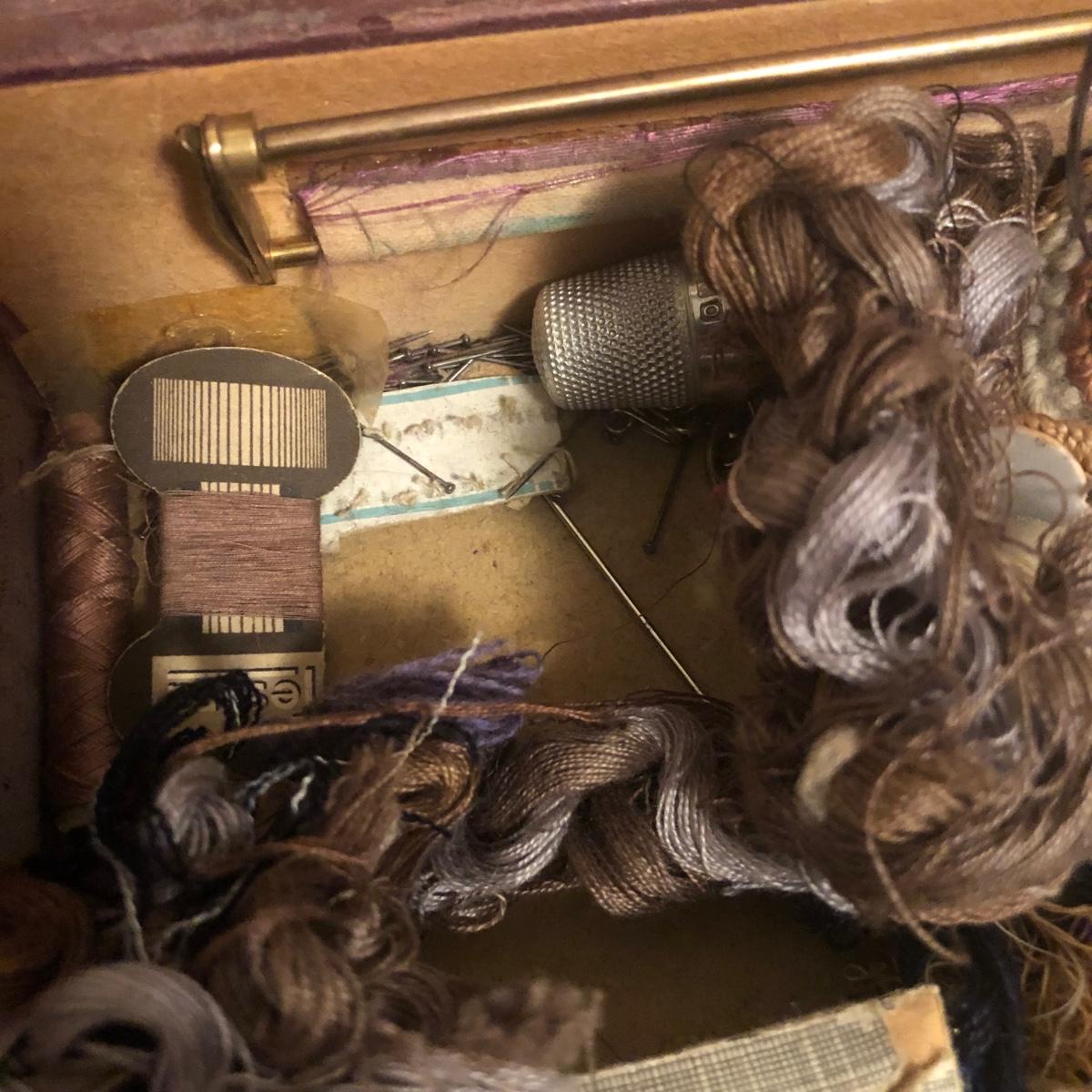 This red brown leather case opens with a skeleton key and contains antique scissors, needles, handmade pincushion, bees wax, Pringle cashmere thread, mending cotton, mending silk, and more. The lock on the box is marked Pat 137, 134 English Lever English Make.