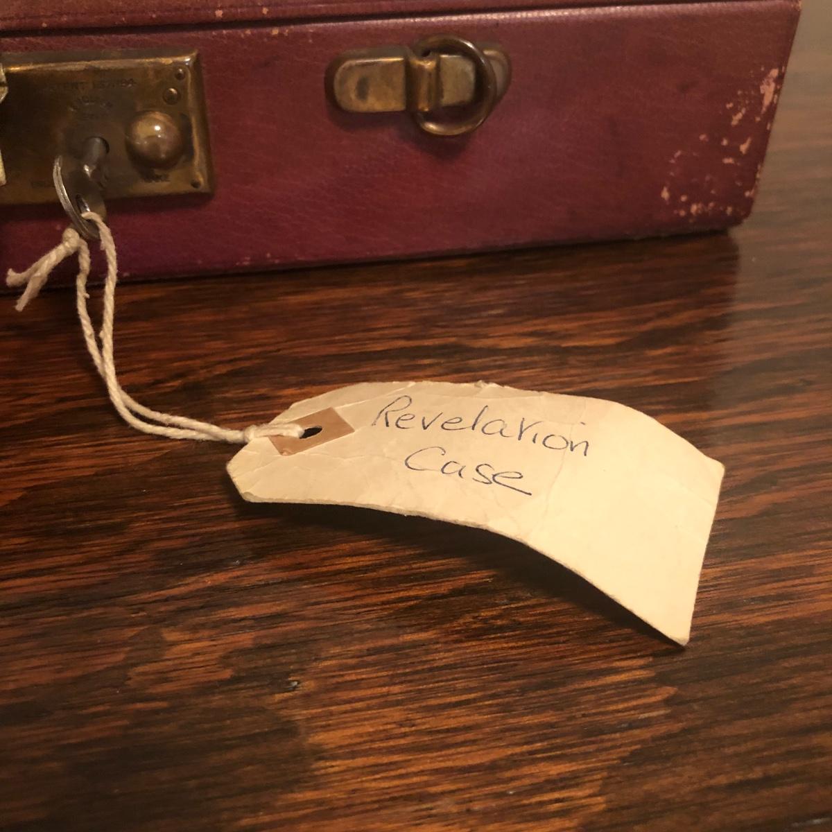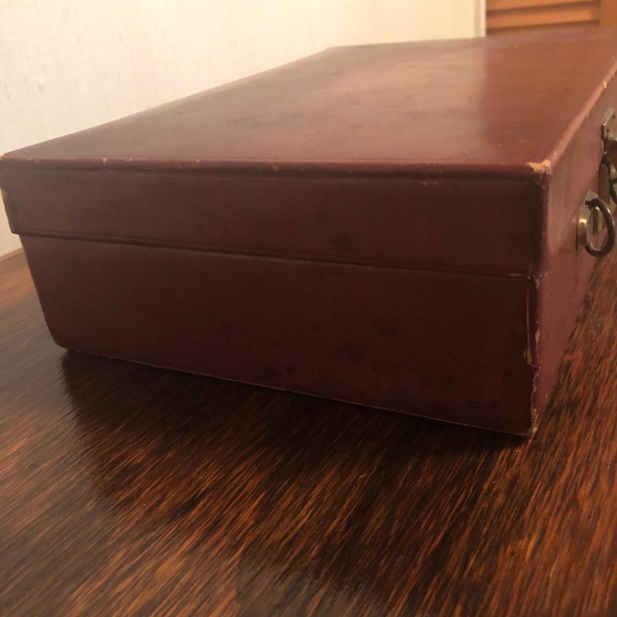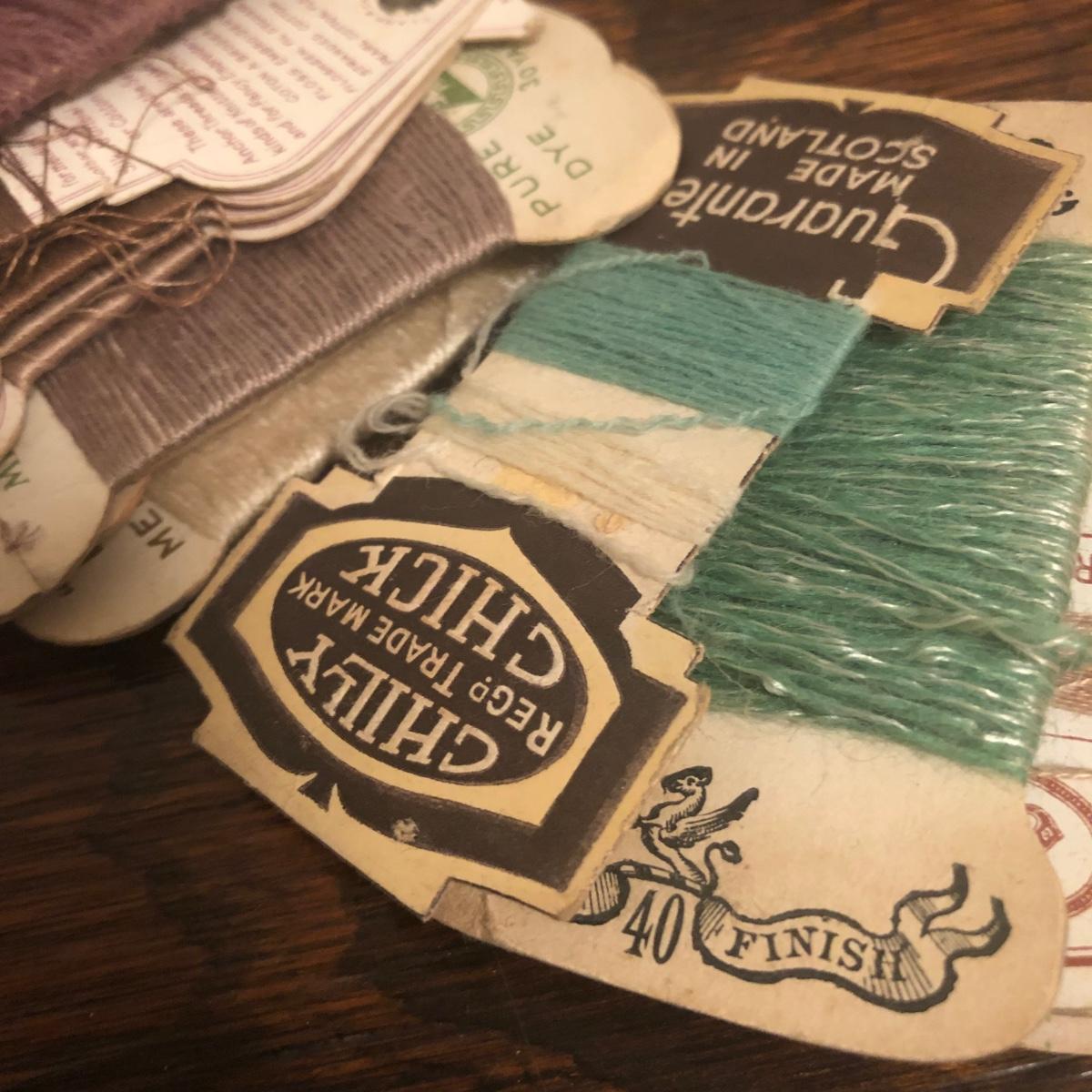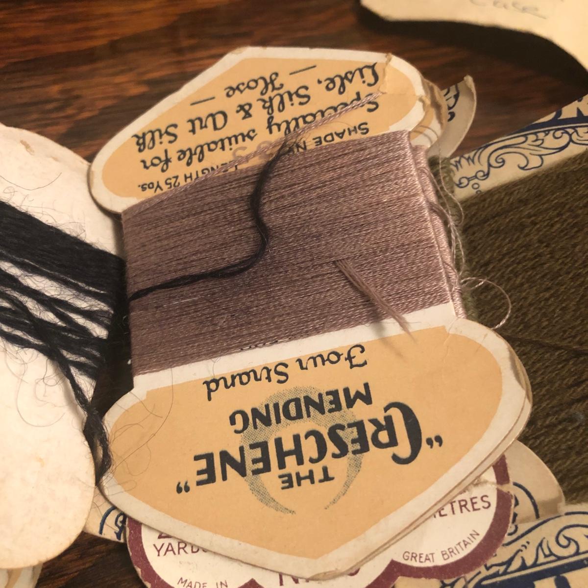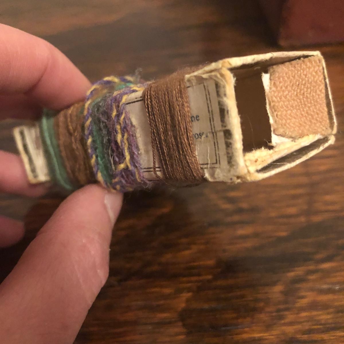 This red brown leather case opens with a skeleton key and contains antique scissors, needles, handmade pincushion, bees wax, Pringle cashmere thread, mending cotton, mending silk, and more. The lock on the box is marked Pat 137, 134 English Lever English Make.